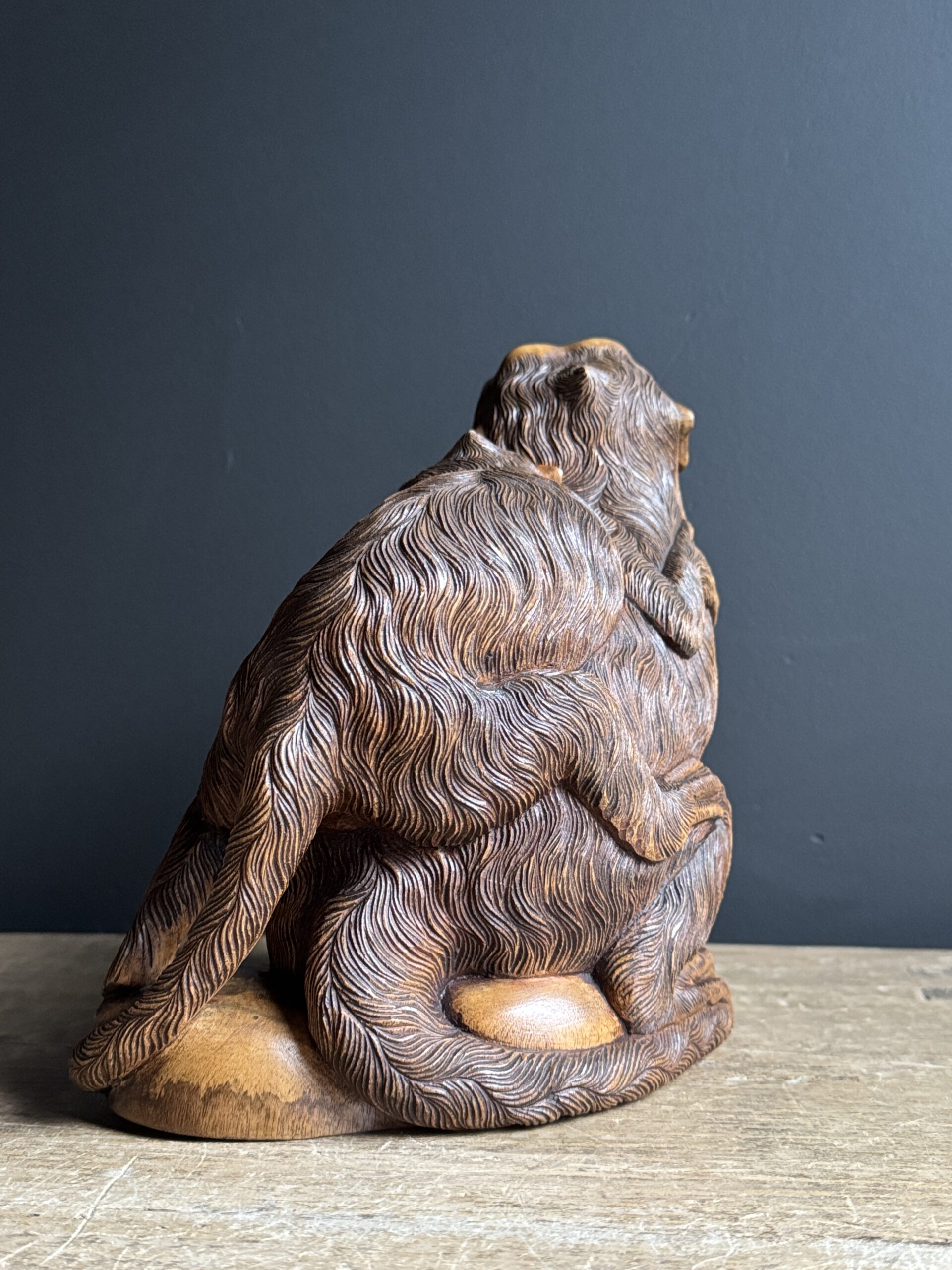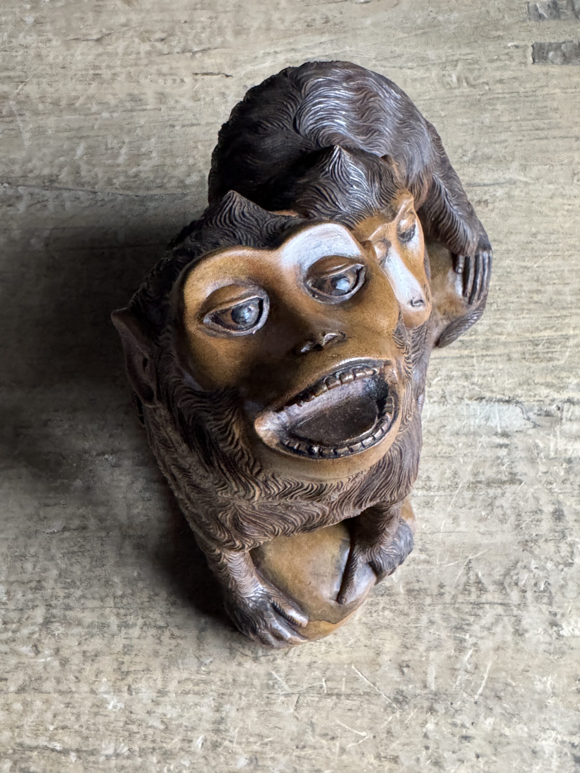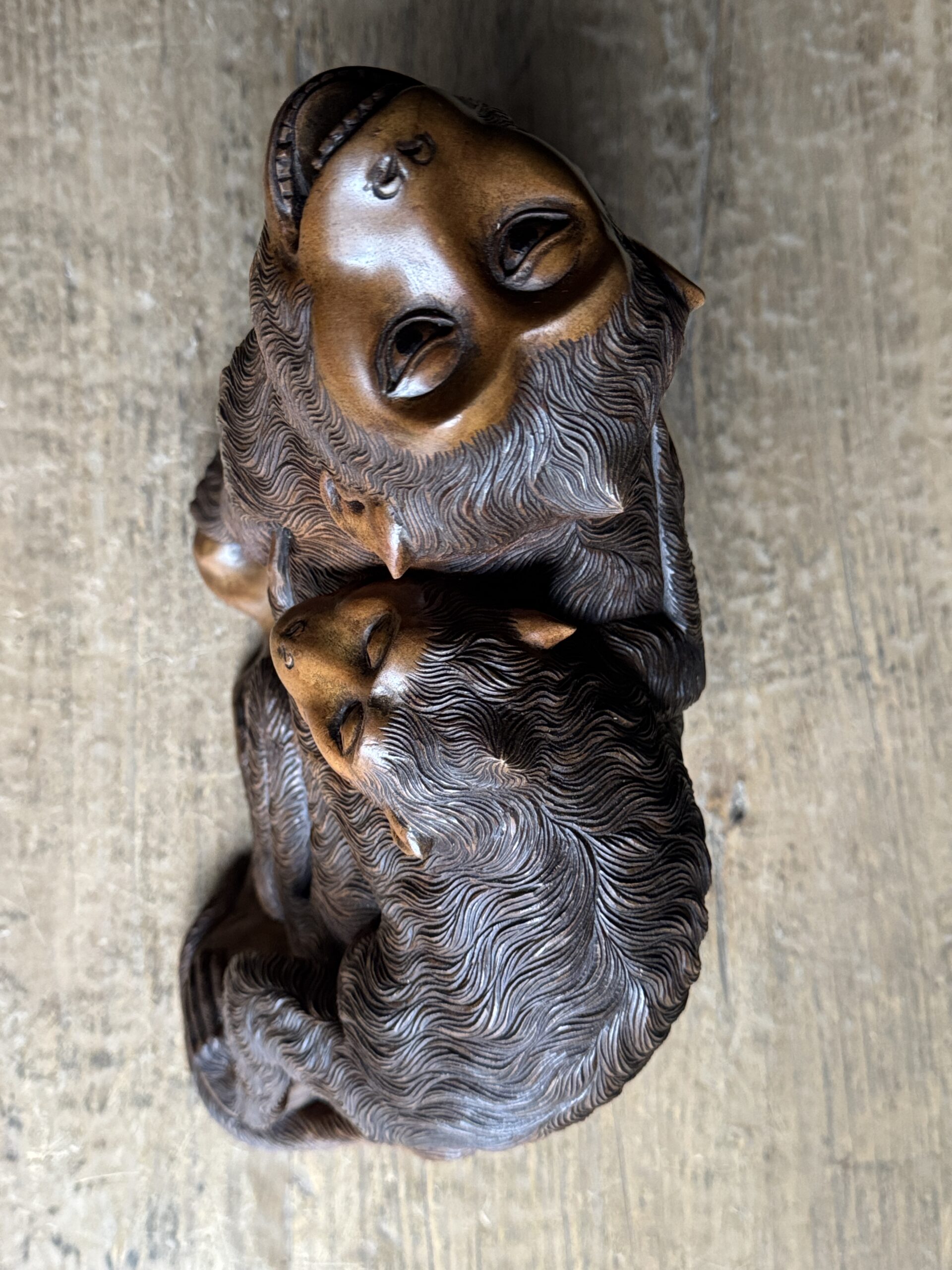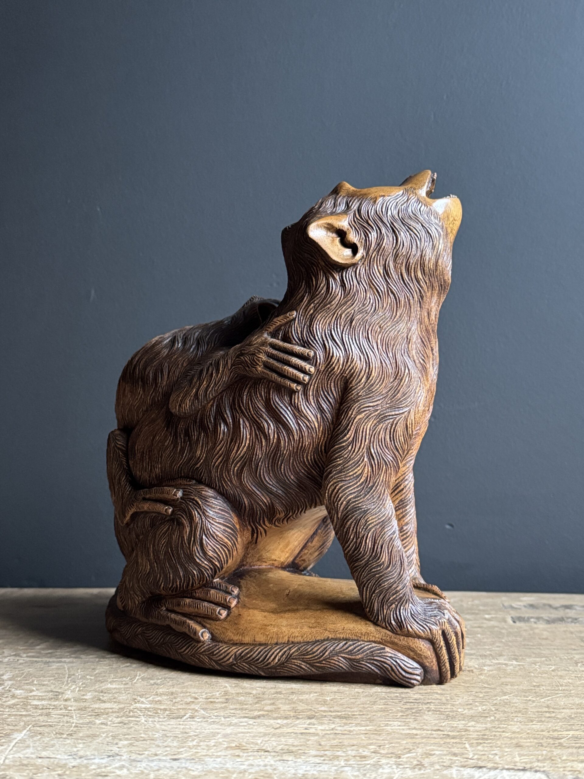 This remarkable wood carving depicts a monkey with her young, with remarkable attention to detail and expression. It is entirely hand-carved by a skilled craftsman, bringing every tuft of fur, posture, and facial expression to life. The warm wood tones and fine finish give the figurine a natural, rustic charm. A unique work of art that beautifully combines craftsmanship and animal tenderness.