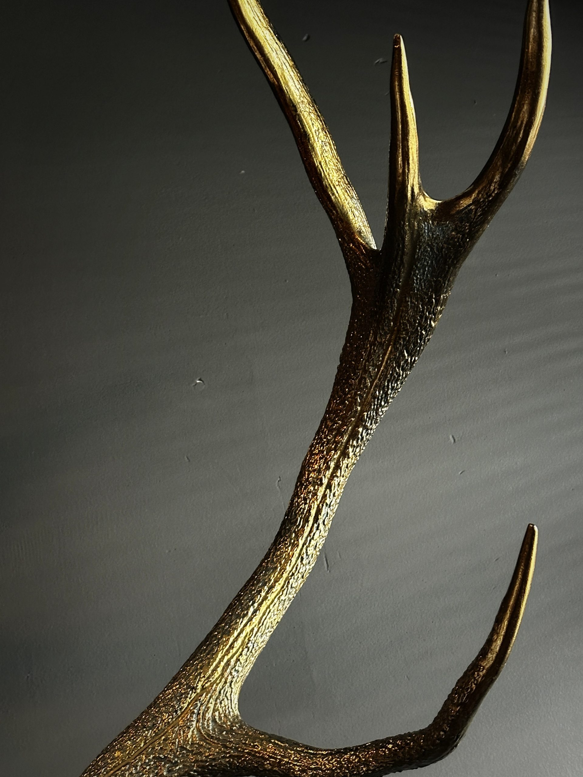 Metalized antler of a red stag which has a bronze finish. The antlers have a real bronze finish. We can apply various types of metal also to other surfaces. Please inquire about the possibilities.