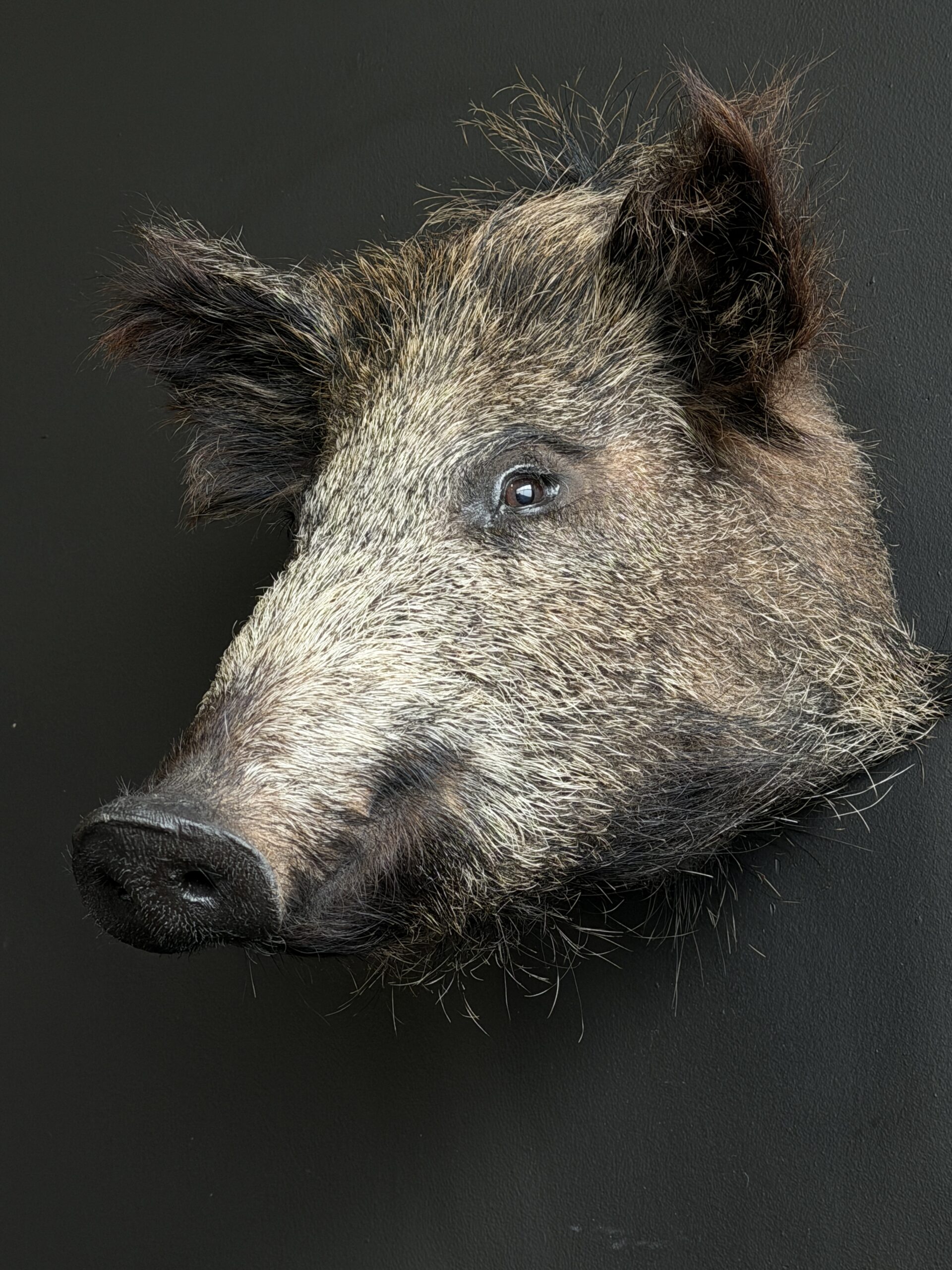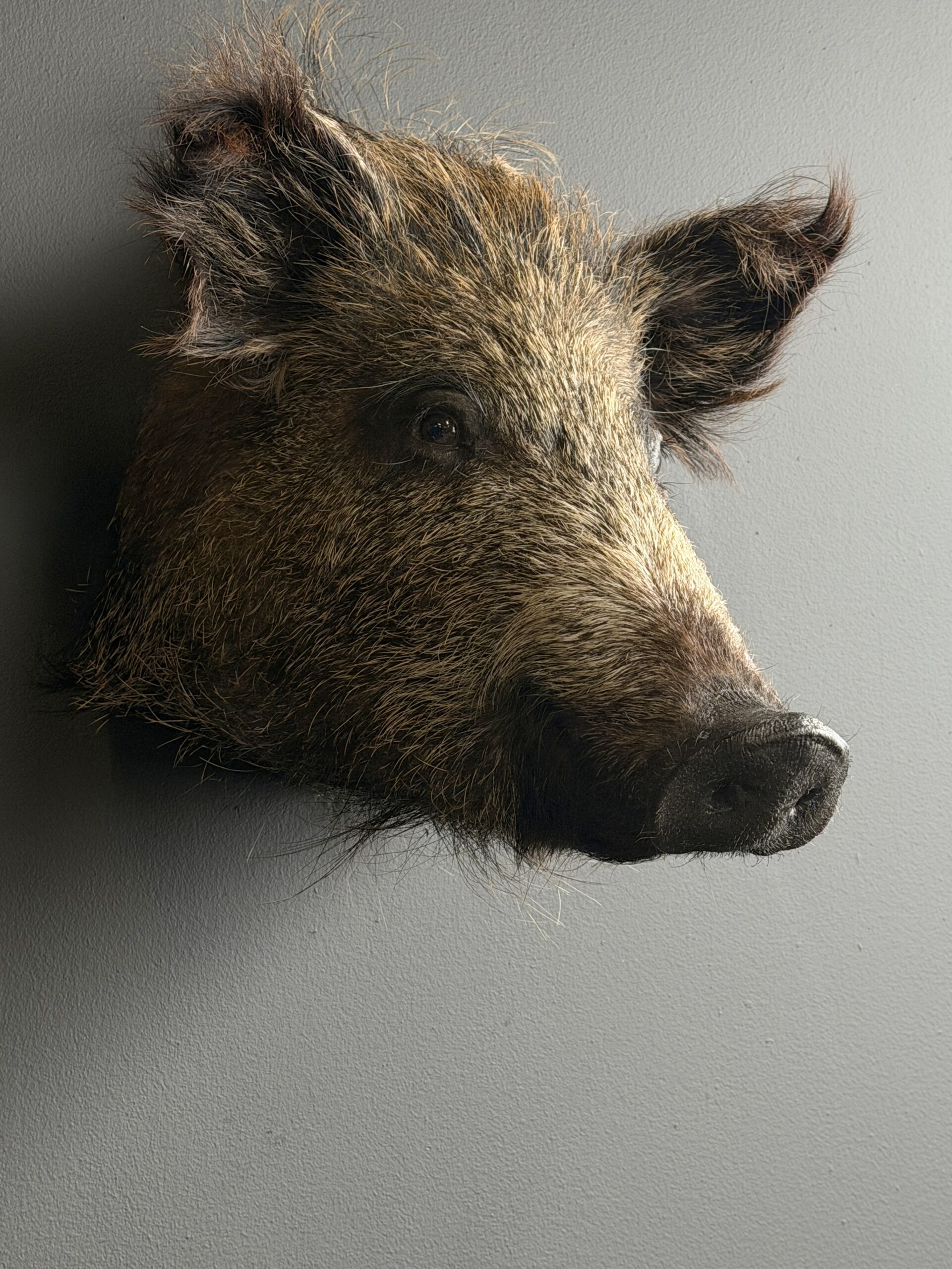 This stuffed boar's head has been professionally prepared and is a lifelike representation of the animal. Characteristic features such as the shape of the head, the coat structure and the teeth have been carefully crafted.