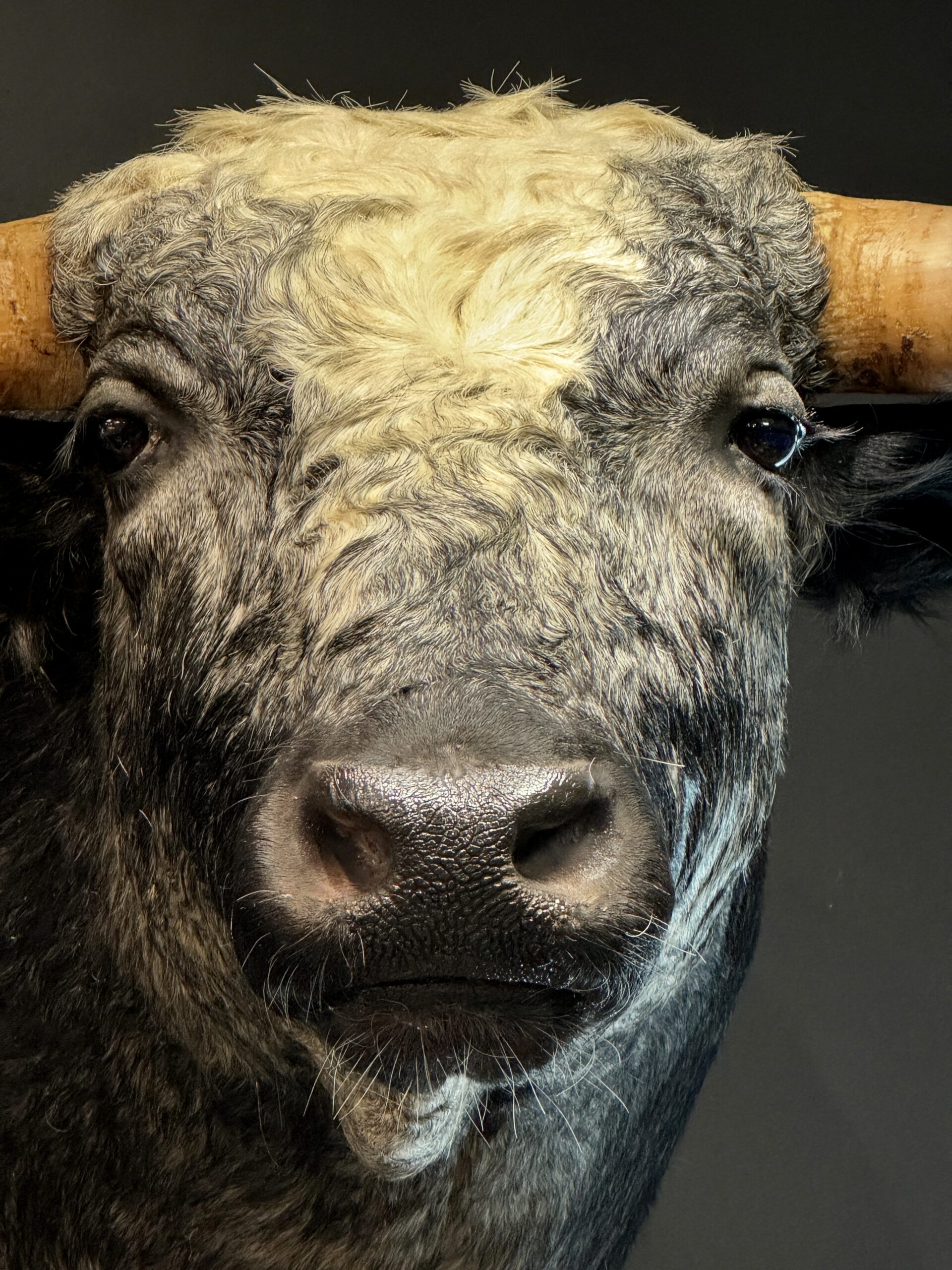 Very impressive stuffed head of a large Spanish bull. This grey Spanish bull has a very beautiful and tough appearance. He is mounted with great attention to detail. This stuffed Spanish bull is a true eye catcher for your interior. If desired, the bull can be delivered on a wooden panel.
