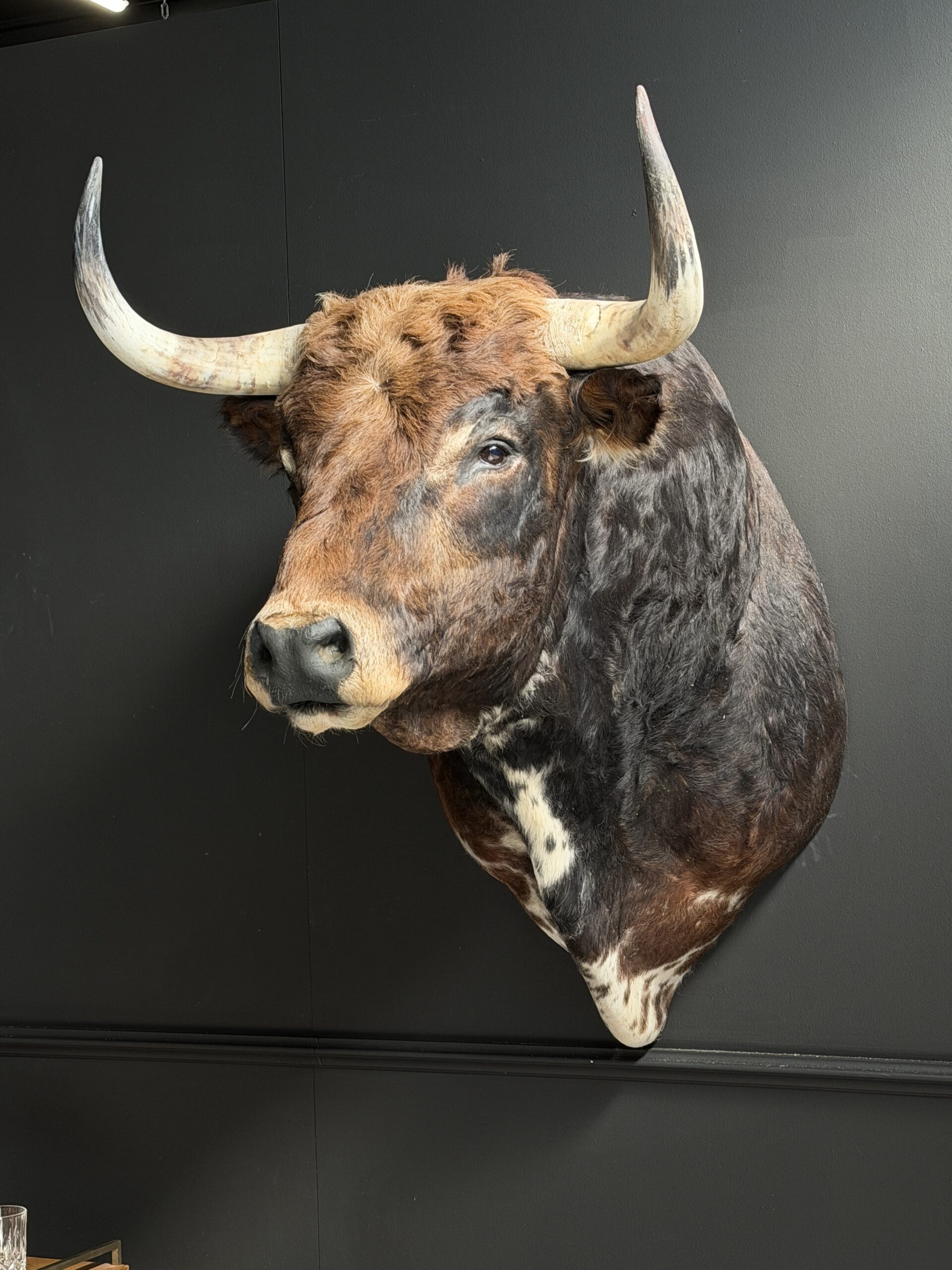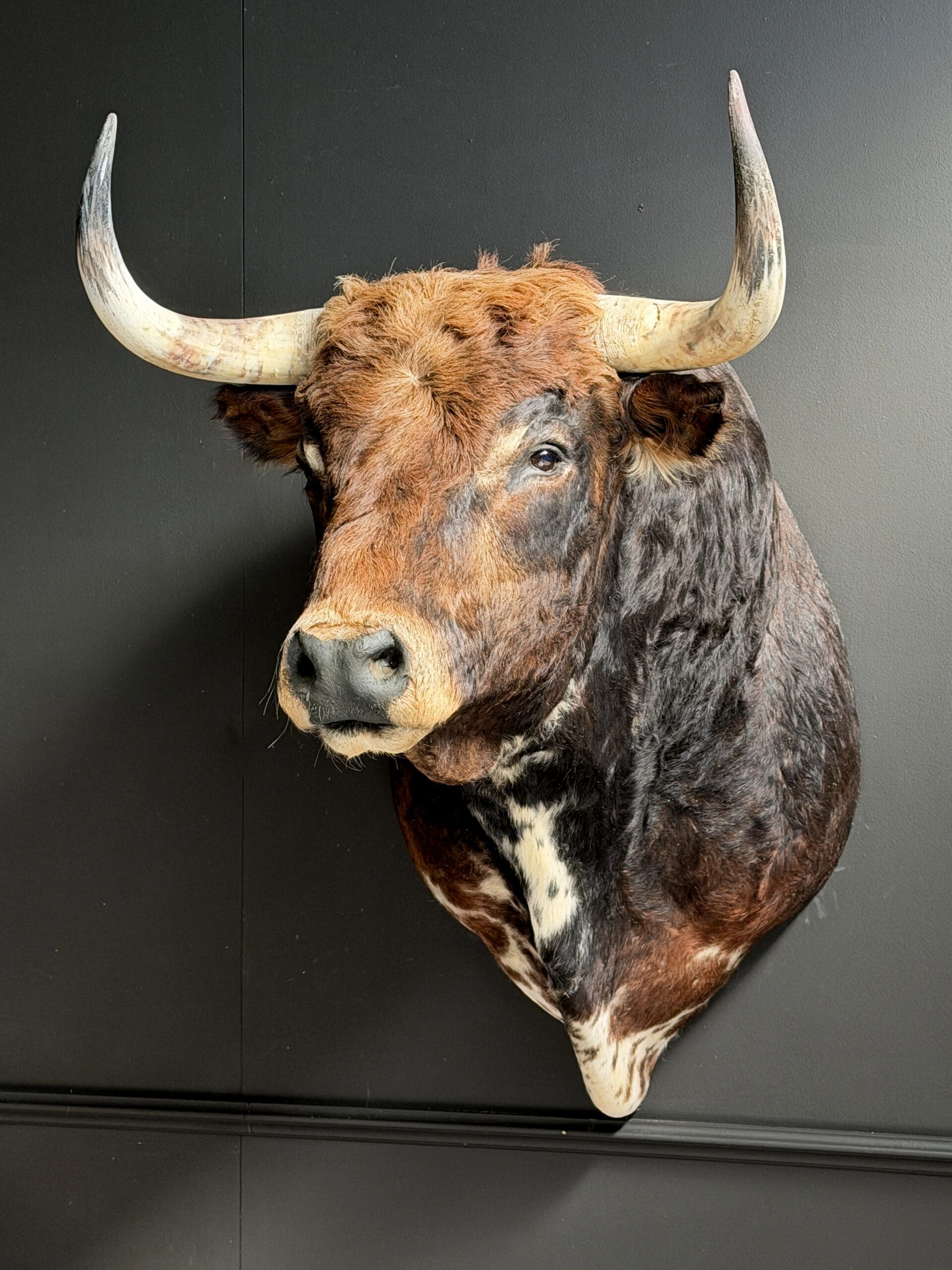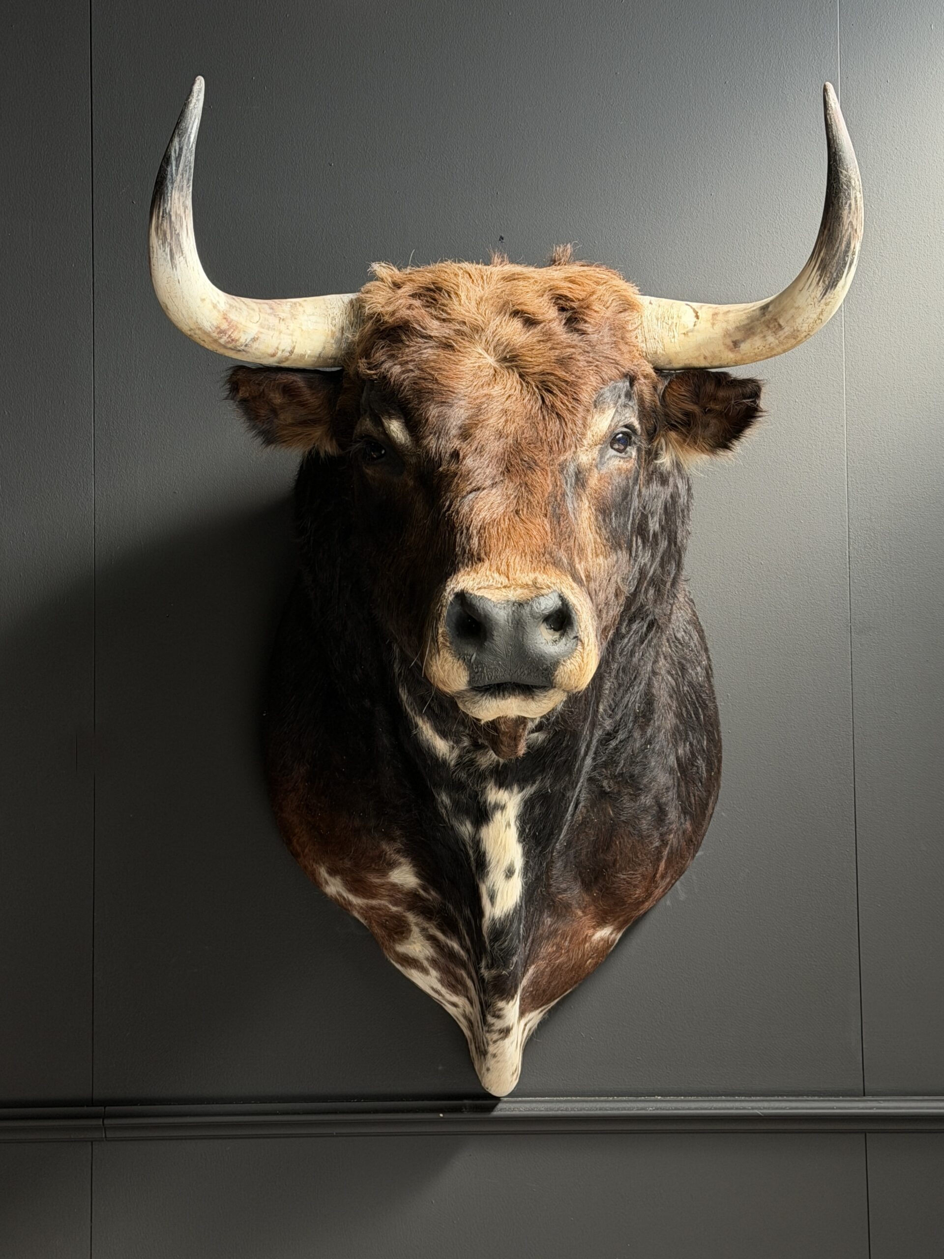 Very impressive stuffed head of a large Spanish bull. This grey Spanish bull has a very beautiful and tough appearance. He is mounted with great attention to detail.