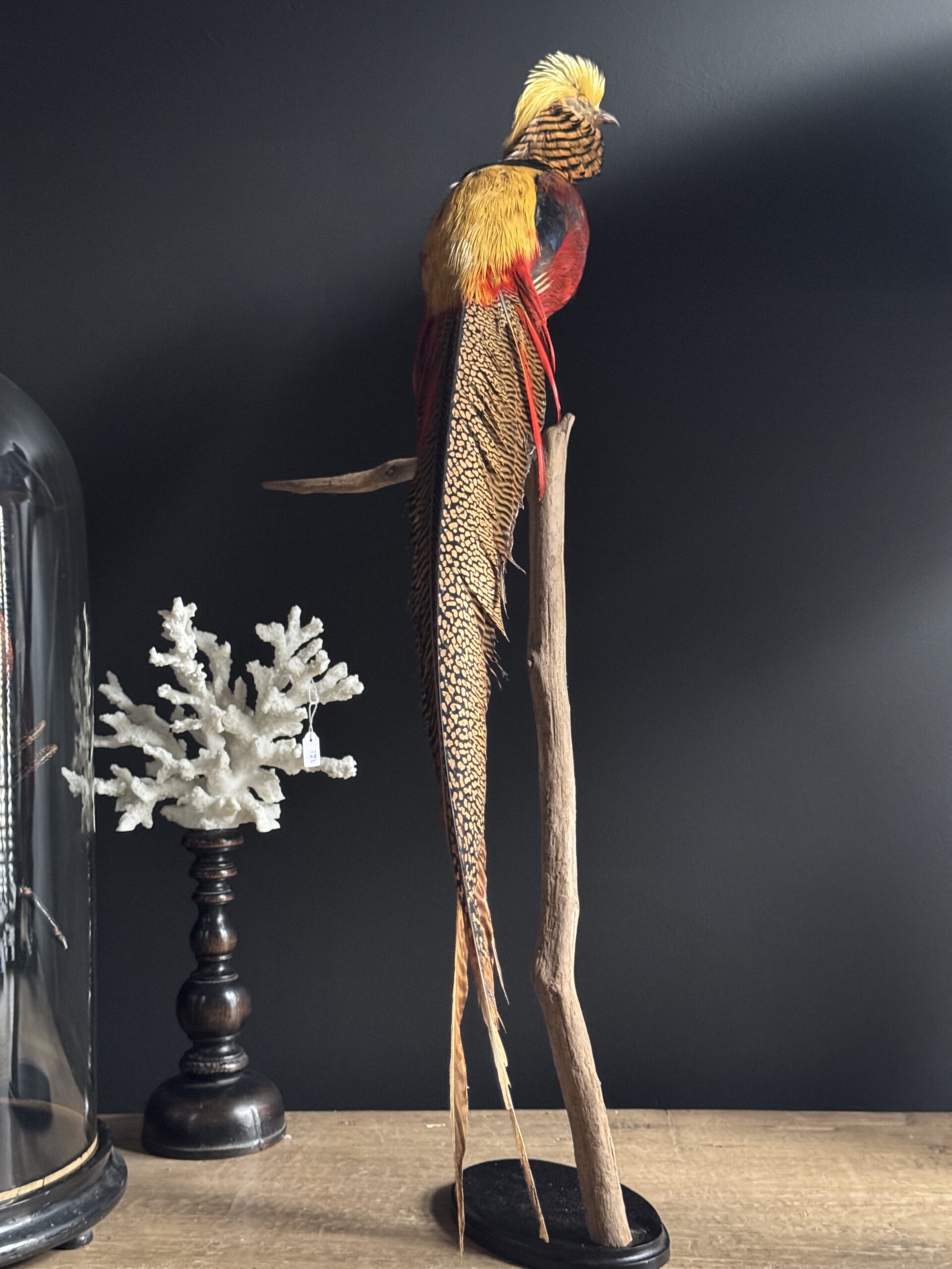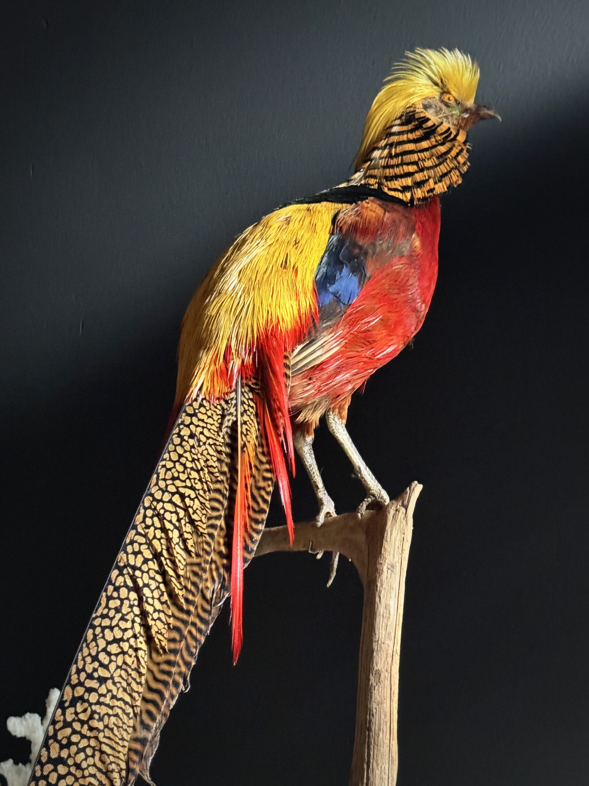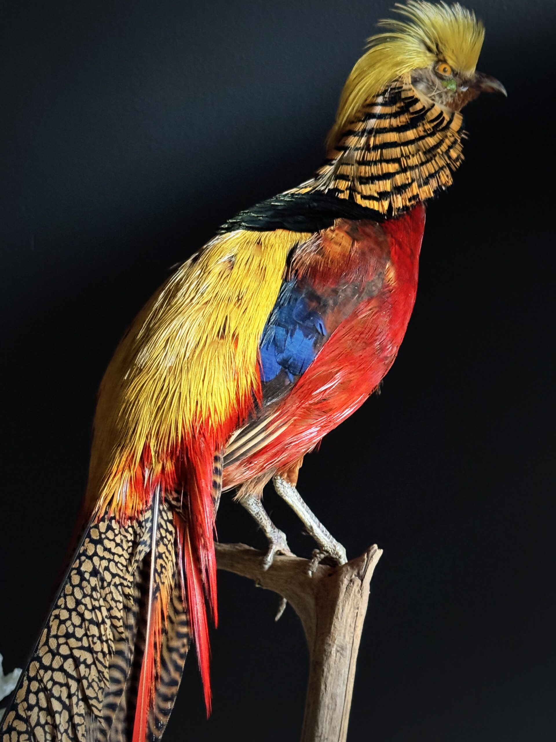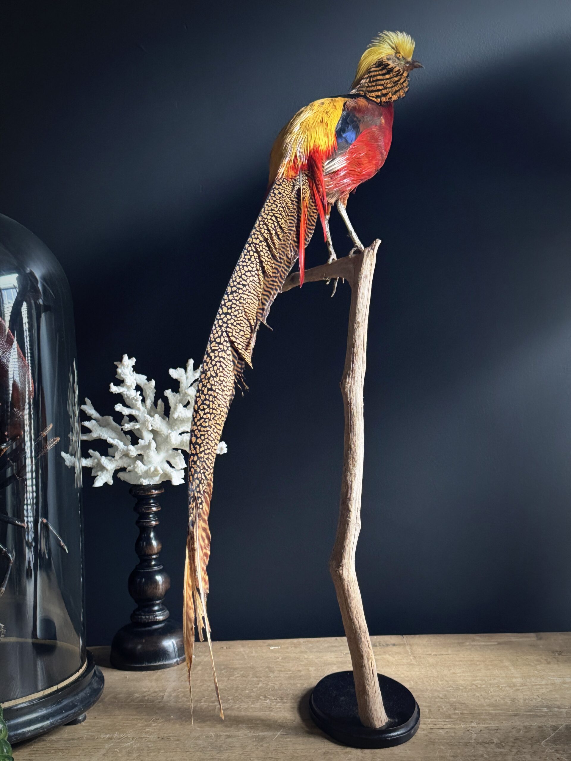 Stylish stuffed gold pheasant mounted on a tall natural stump making it a beautiful freestanding object.