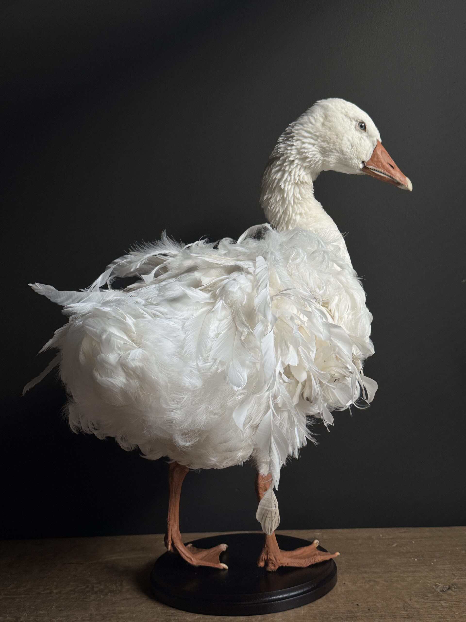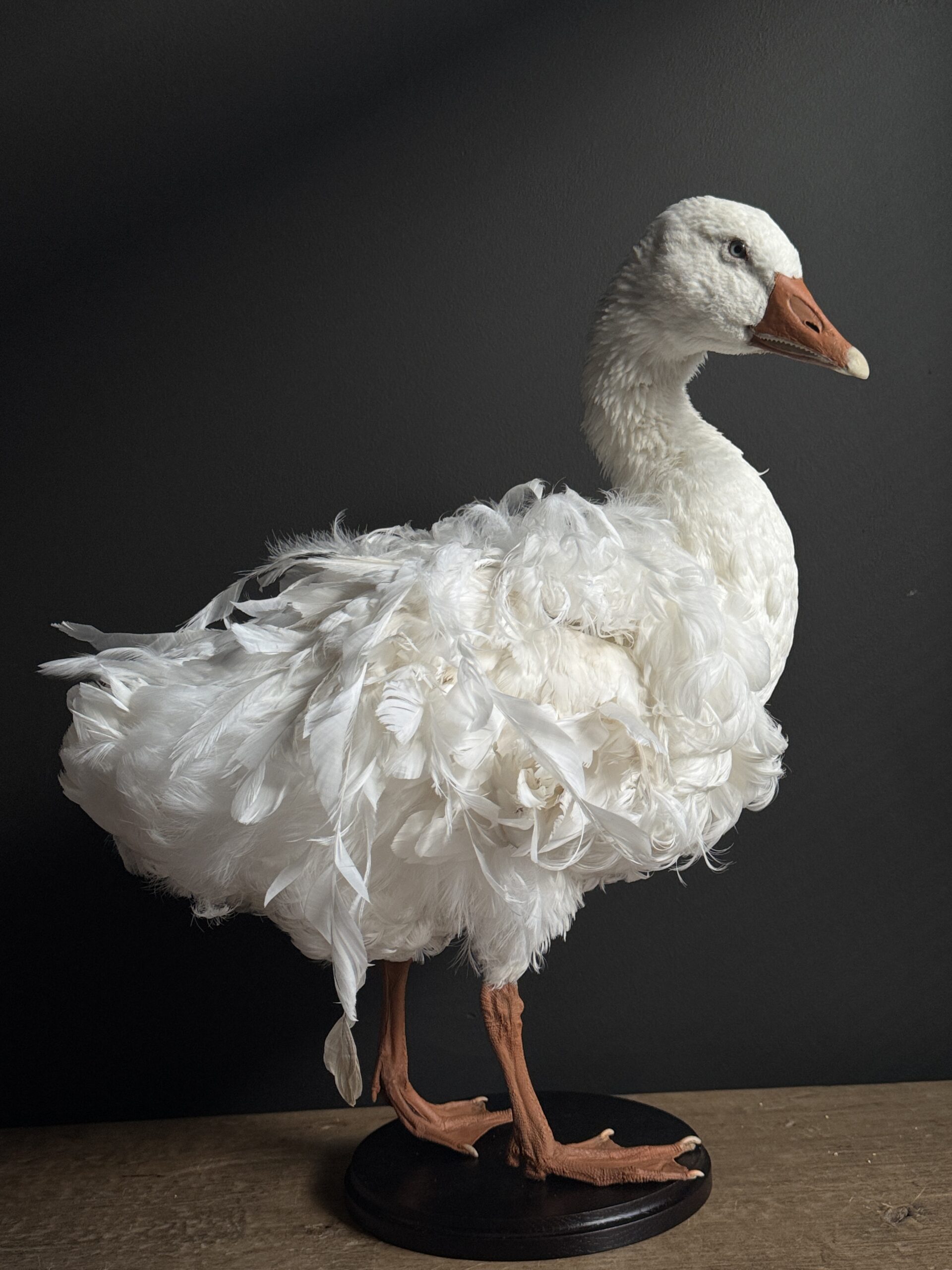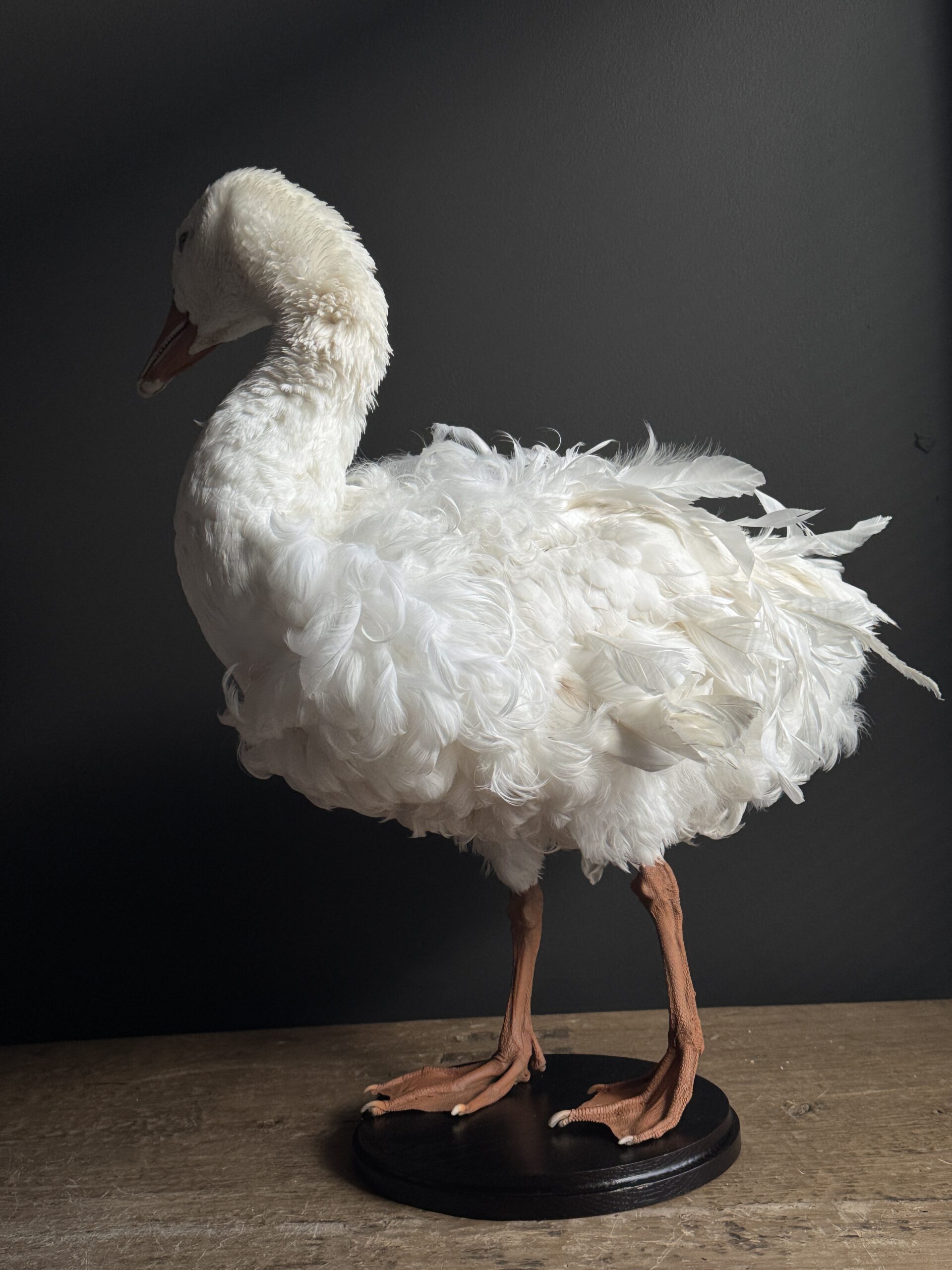 Mounted unusual curly goose. This goose is set up with great attention to detail. We can create the geese in a pose to your liking. Please inquire about the possibilities.
