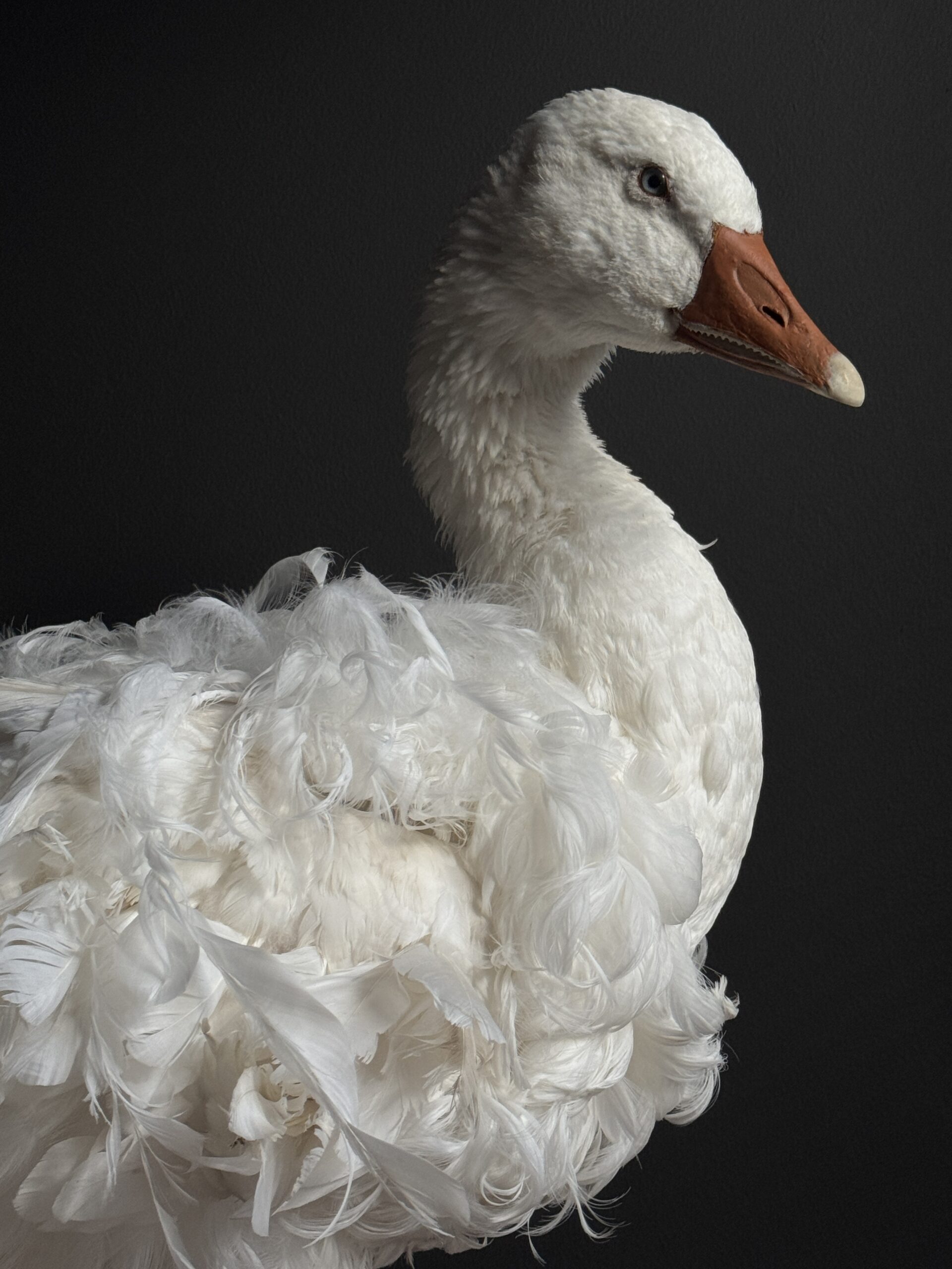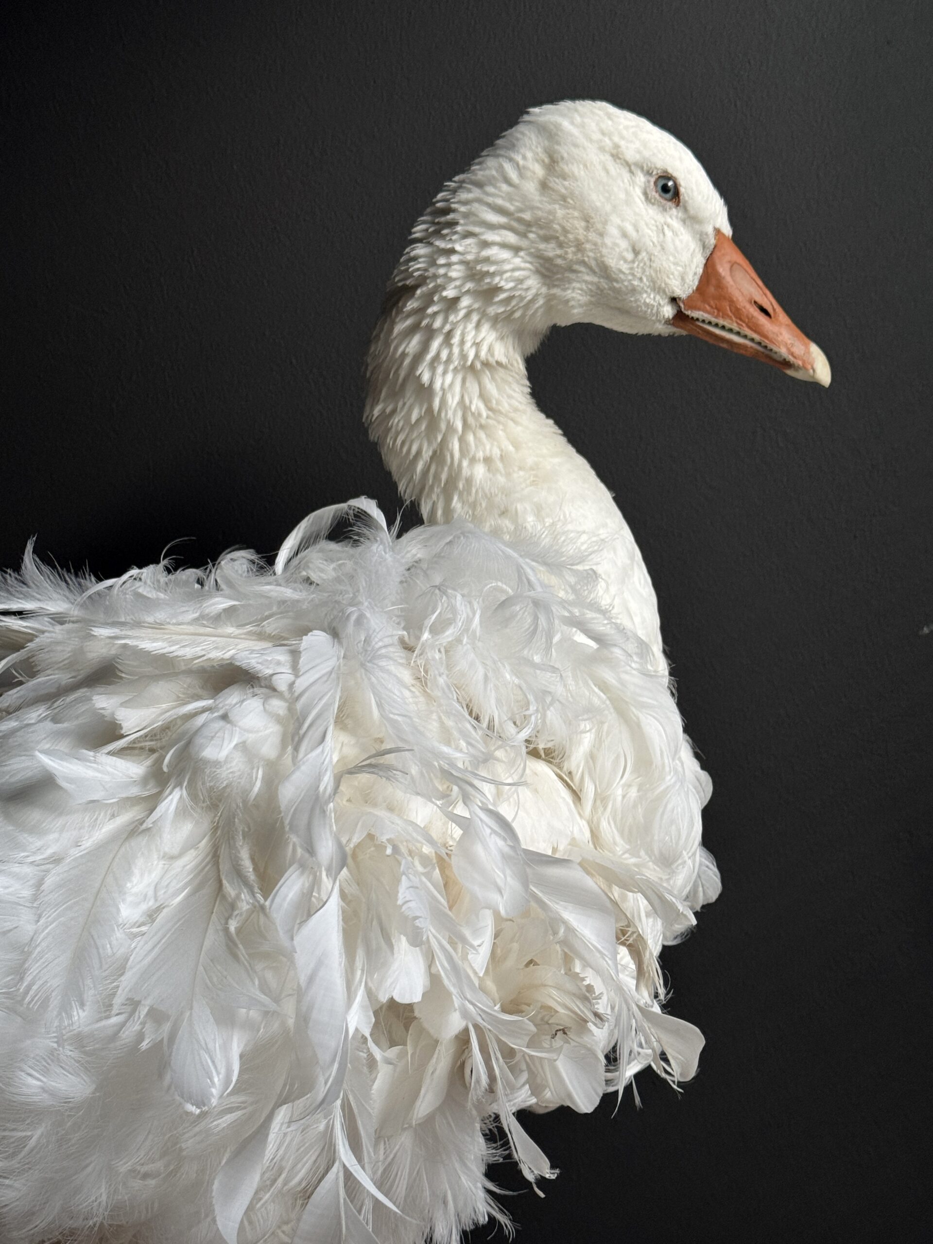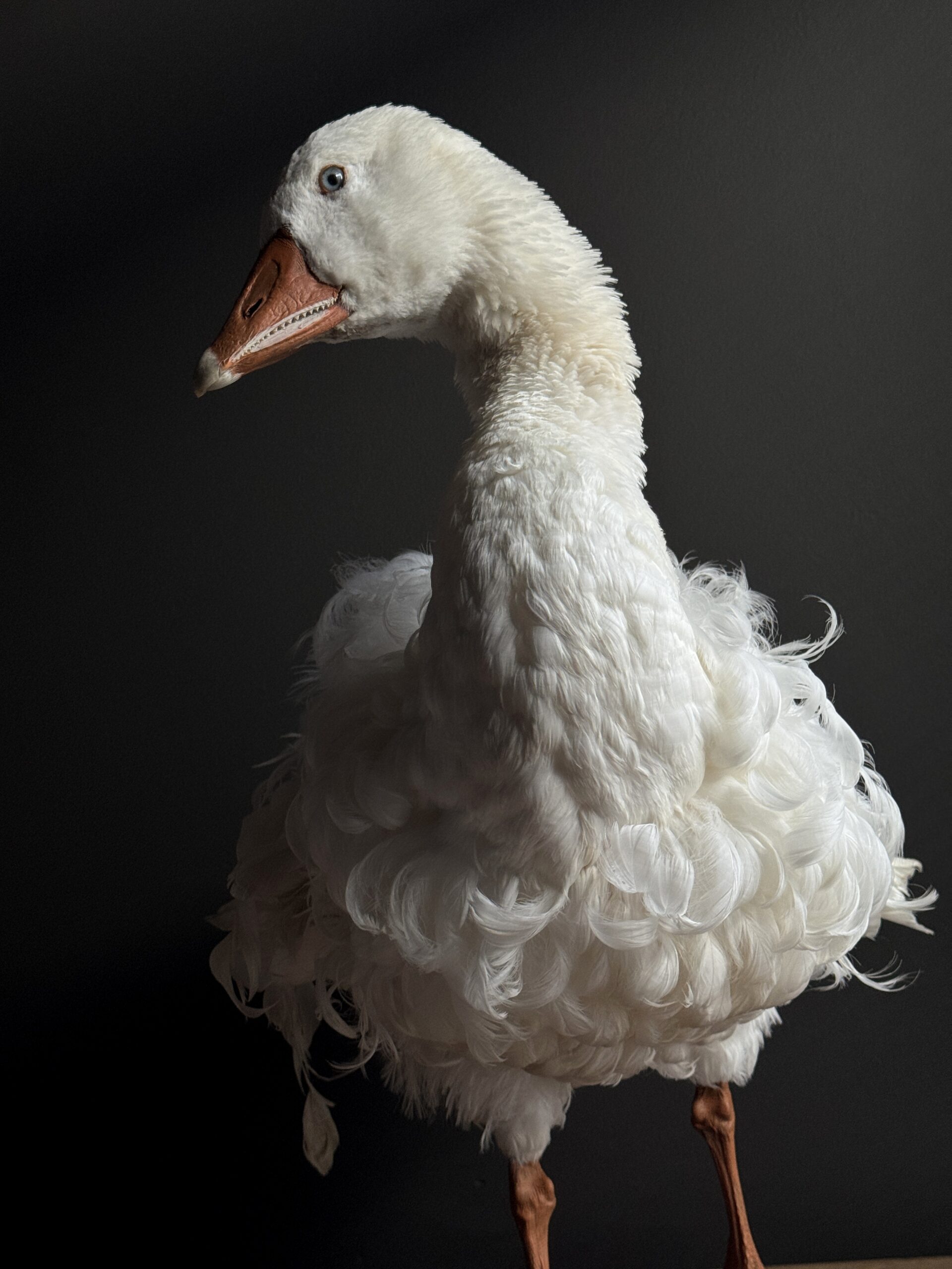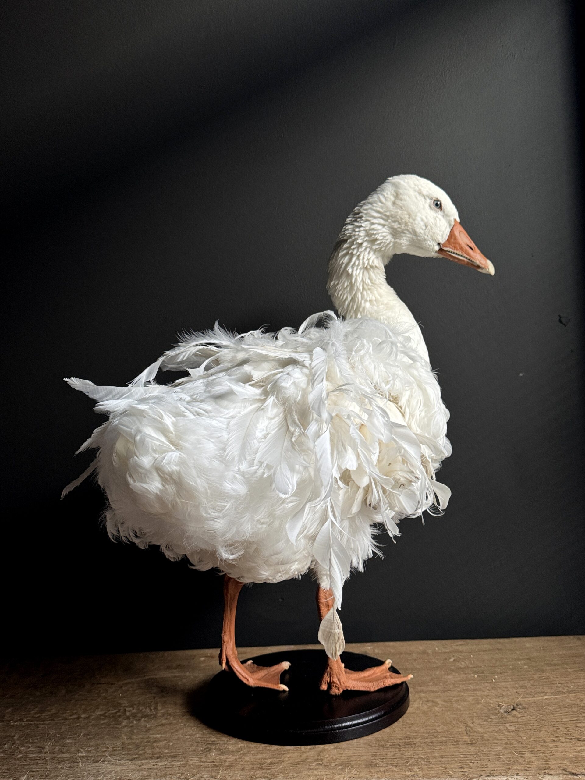 Mounted unusual curly goose. This goose is set up with great attention to detail. We can create the geese in a pose to your liking. Please inquire about the possibilities.