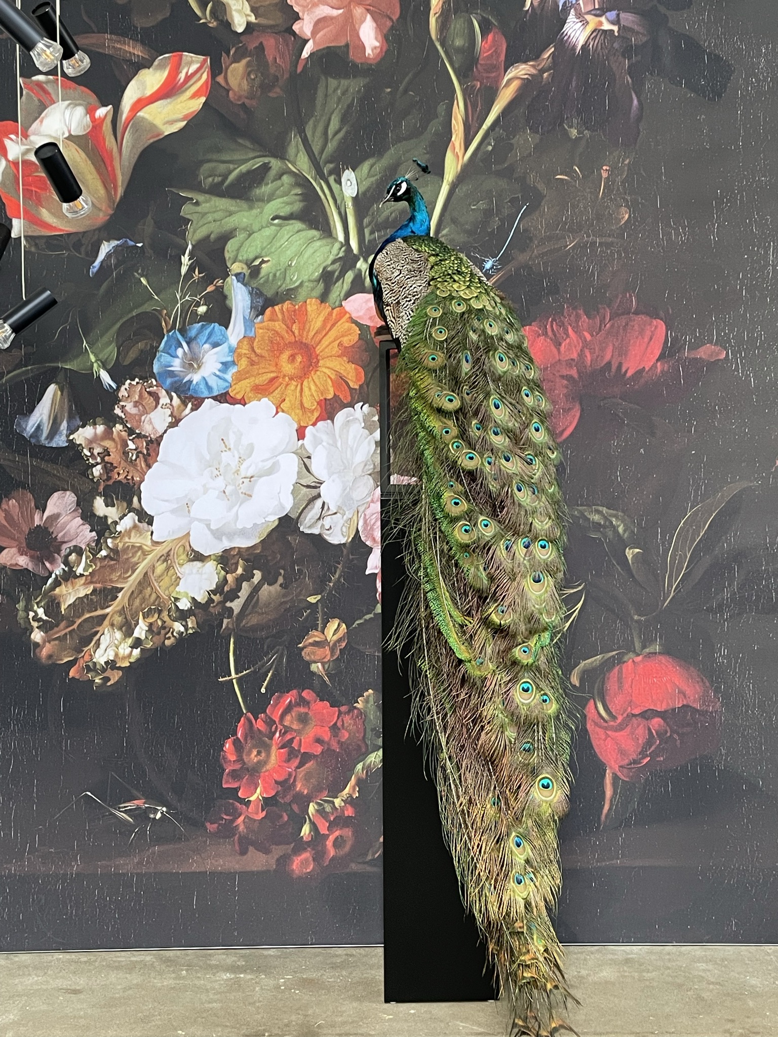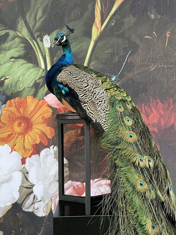 This beautiful black winged peacock is stuffed in a stylish resting pose. Our peacocks are stuffed with great attention to detail and are true additions to your interior.
