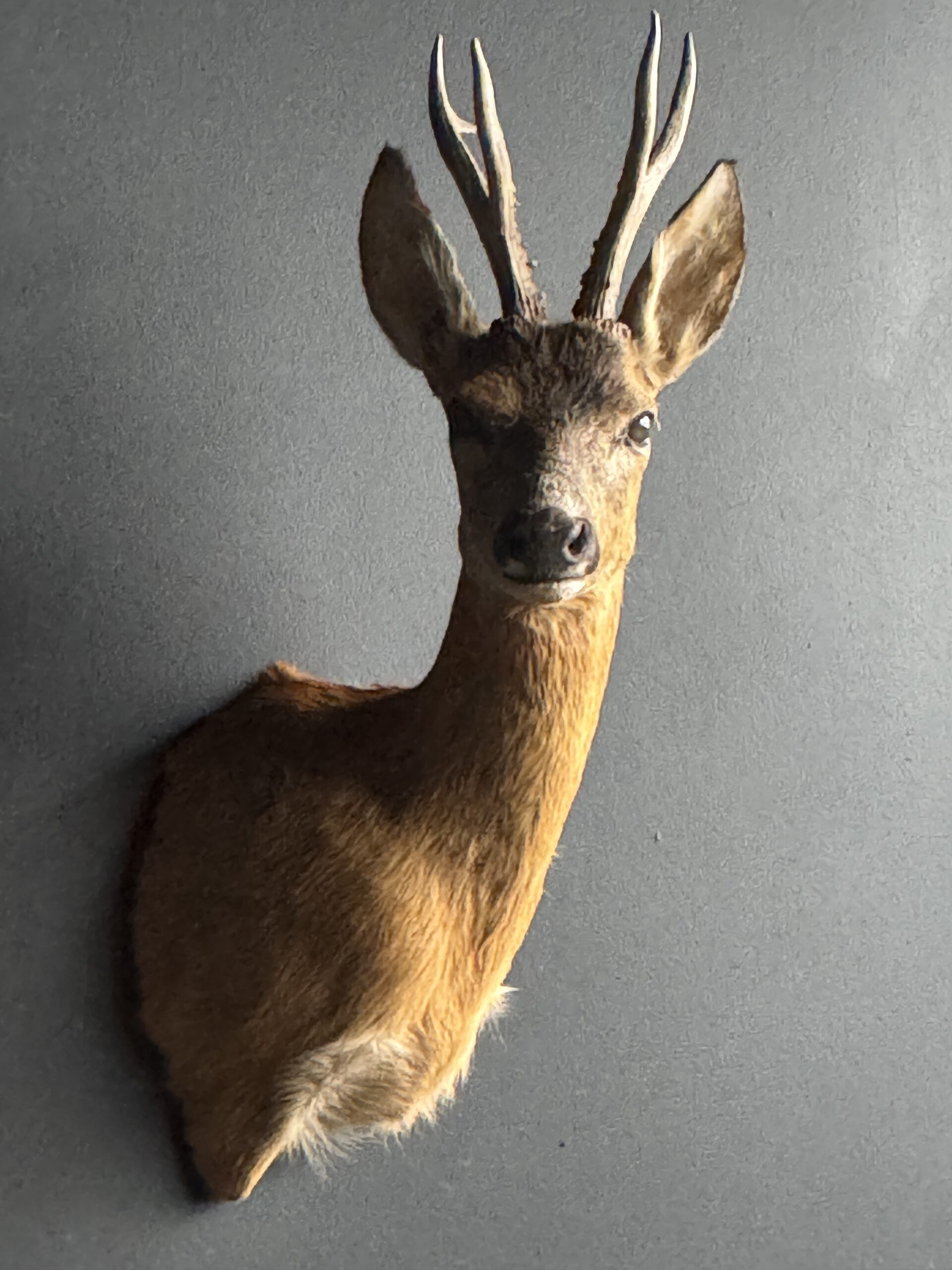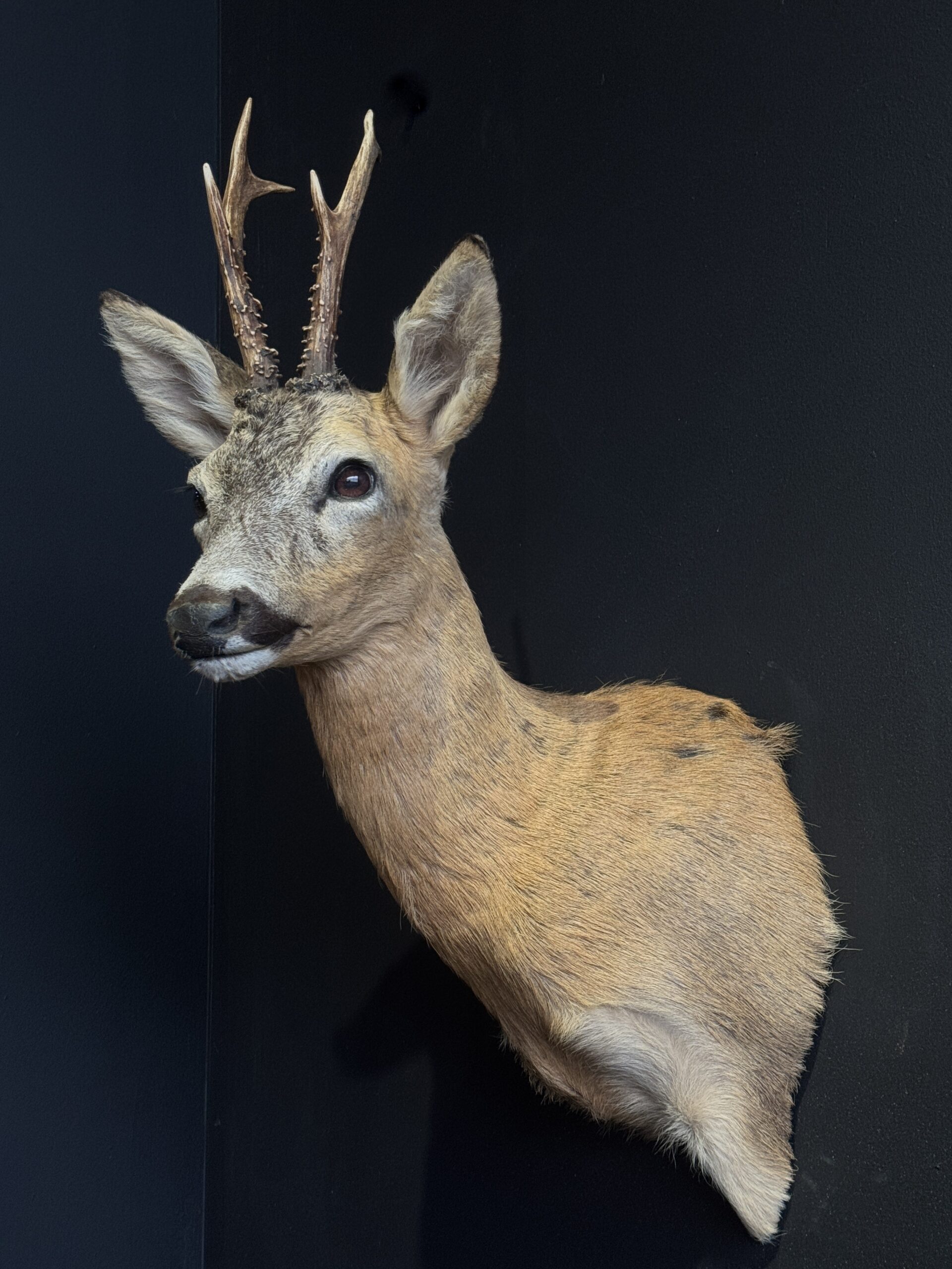 Mounted head of a beautiful roebuck in summer plumage. This is a strong roebuck with large antlers. This form has a lot of breast area making it an imposing piece. We have several roebuck and deer in stock which are all on our website.