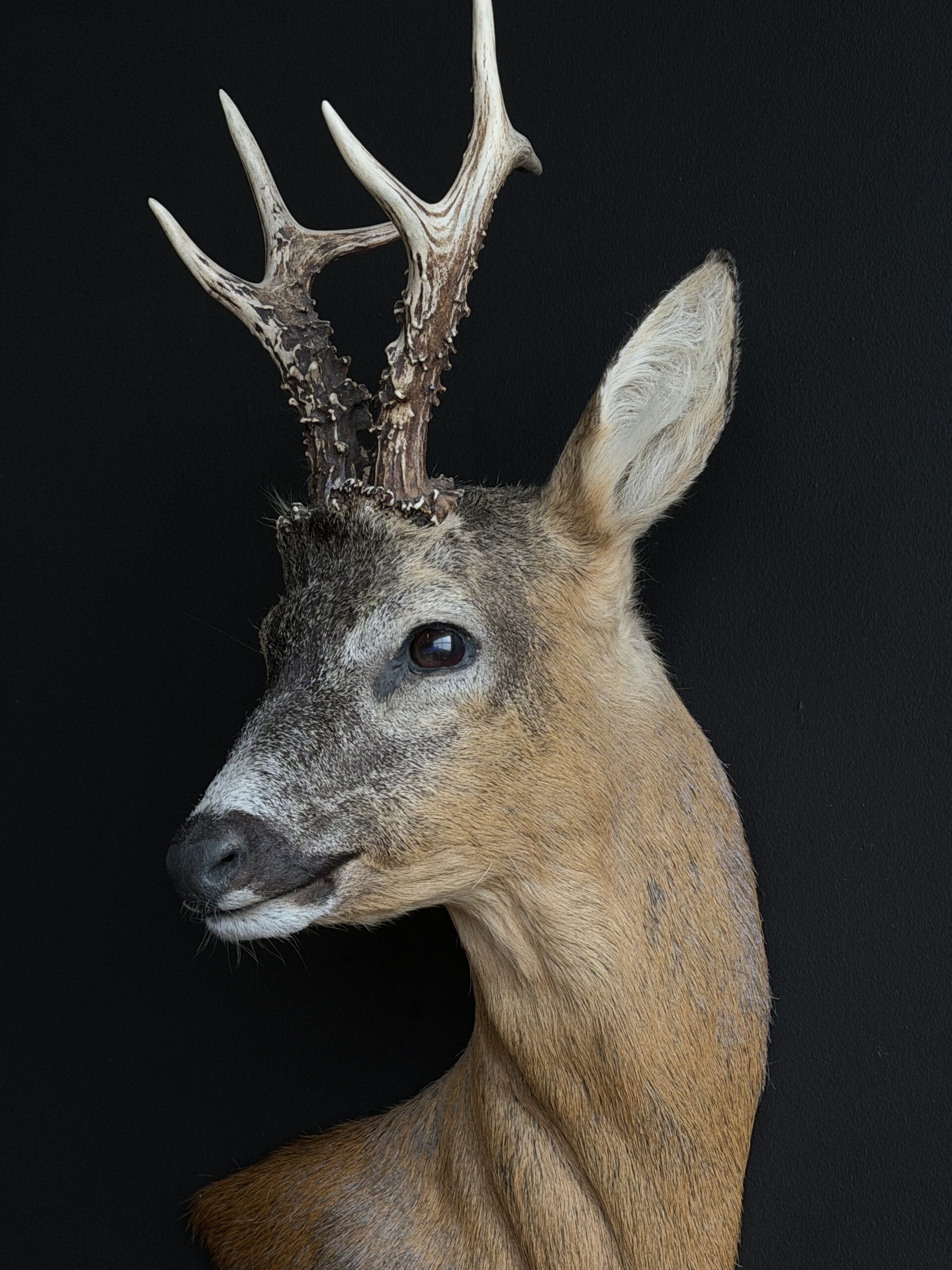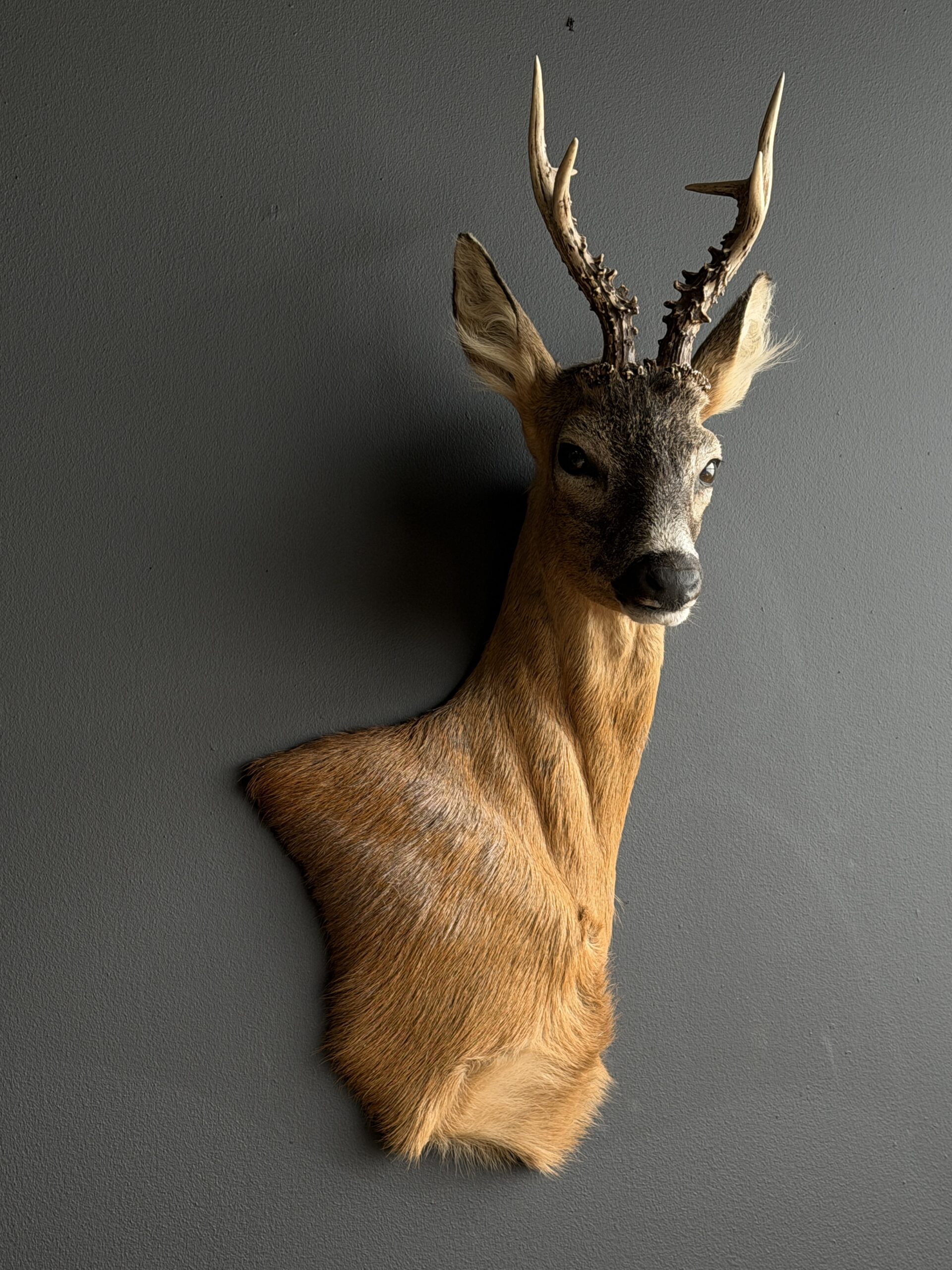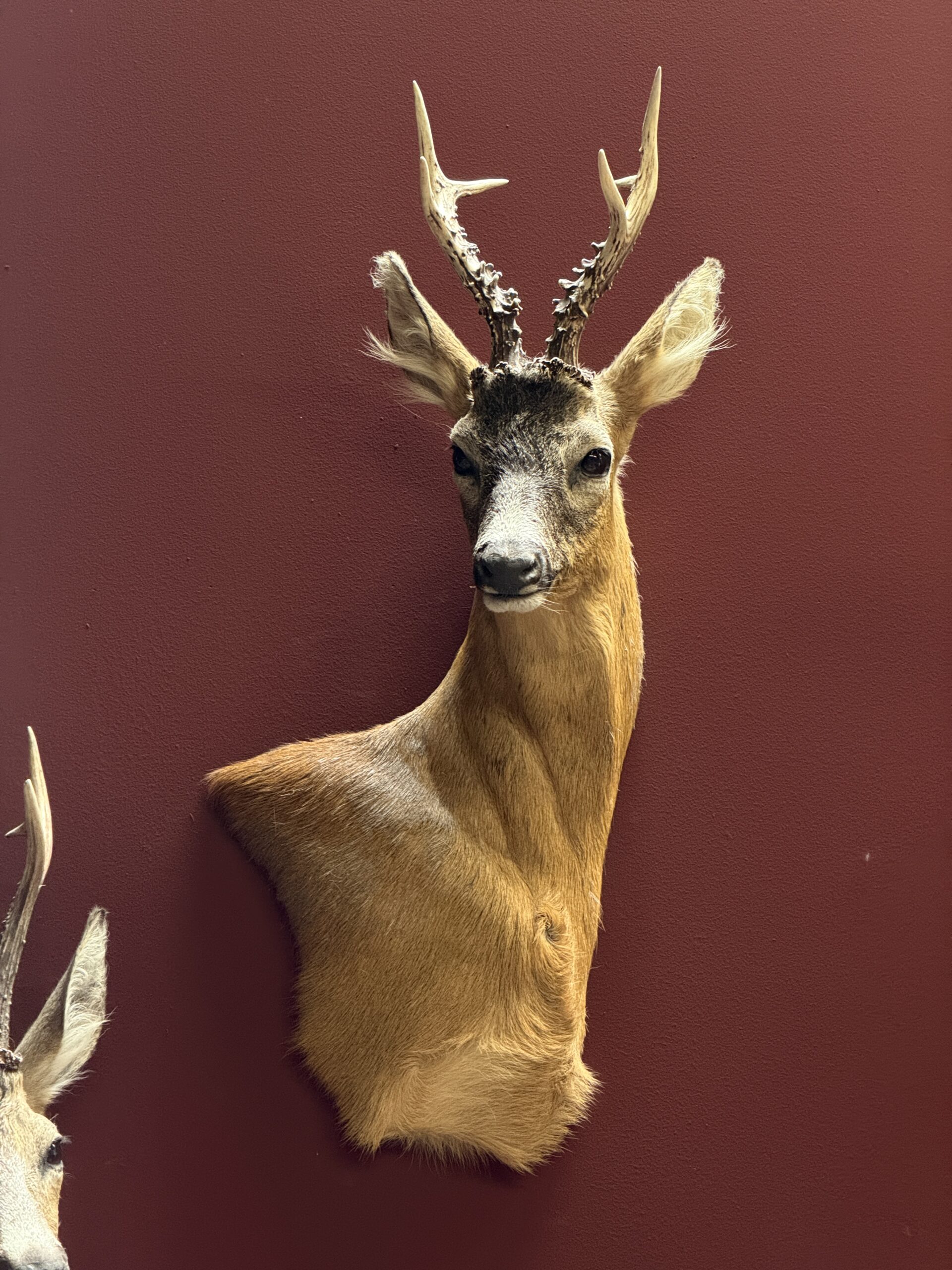 A mounted head of a magnificent roebuck in its summer coat. This is a robust roebuck in a striking pose. The design makes the roebuck appear to emerge from the wall, as it were. We have various roebucks and red deer in stock, all of which are featured on our website.