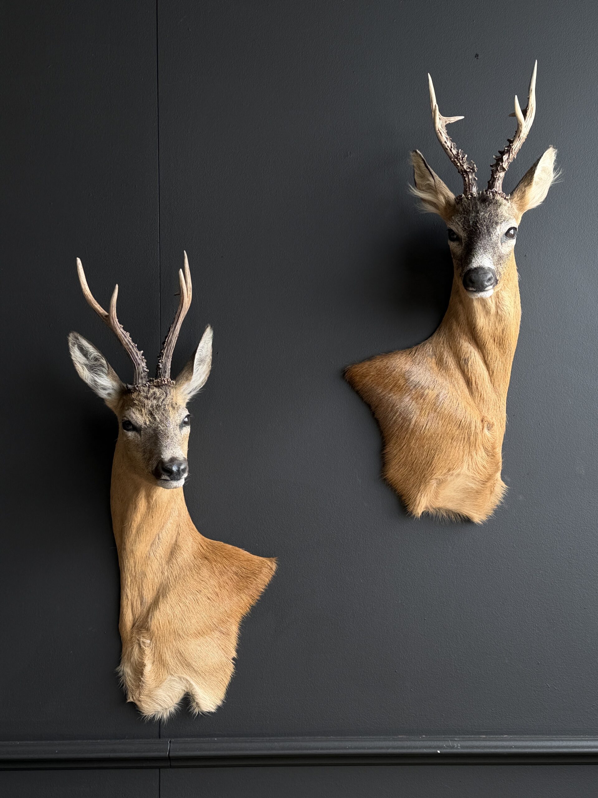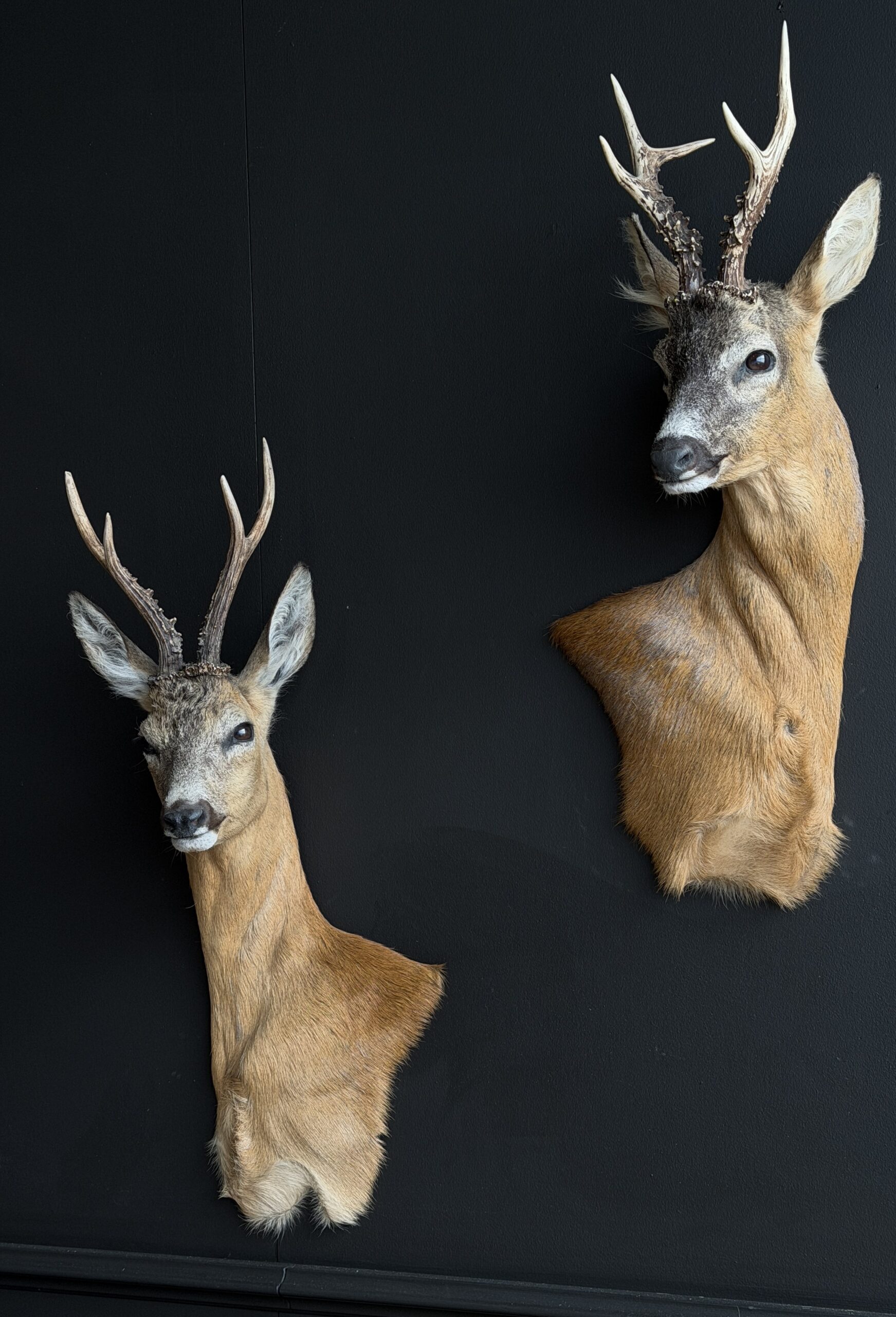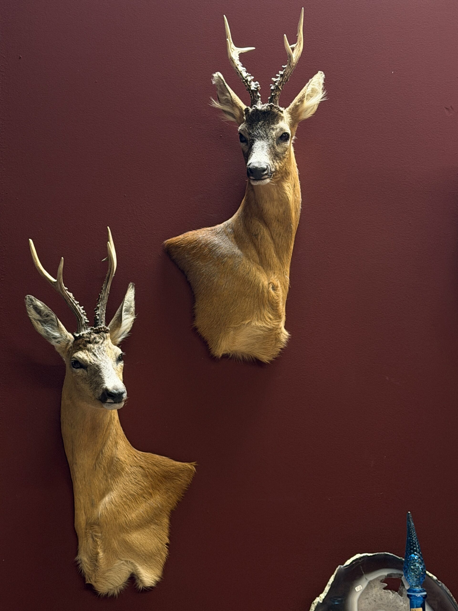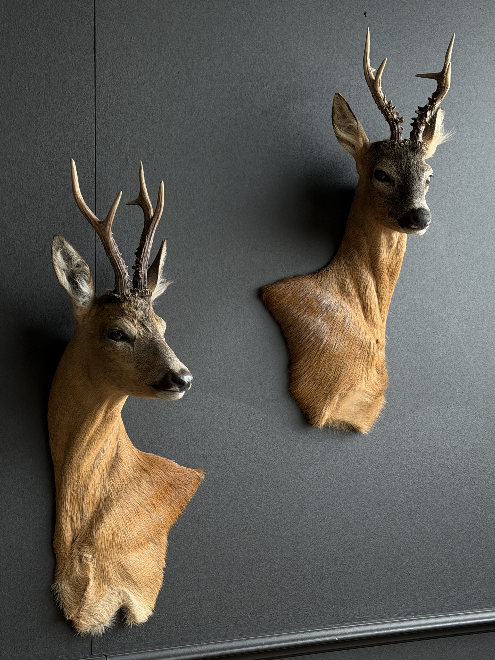 A mounted head of a magnificent roebuck in its summer coat. This is a robust roebuck in a striking pose. The design makes the roebuck appear to emerge from the wall, as it were. We have various roebucks and red deer in stock, all of which are featured on our website.