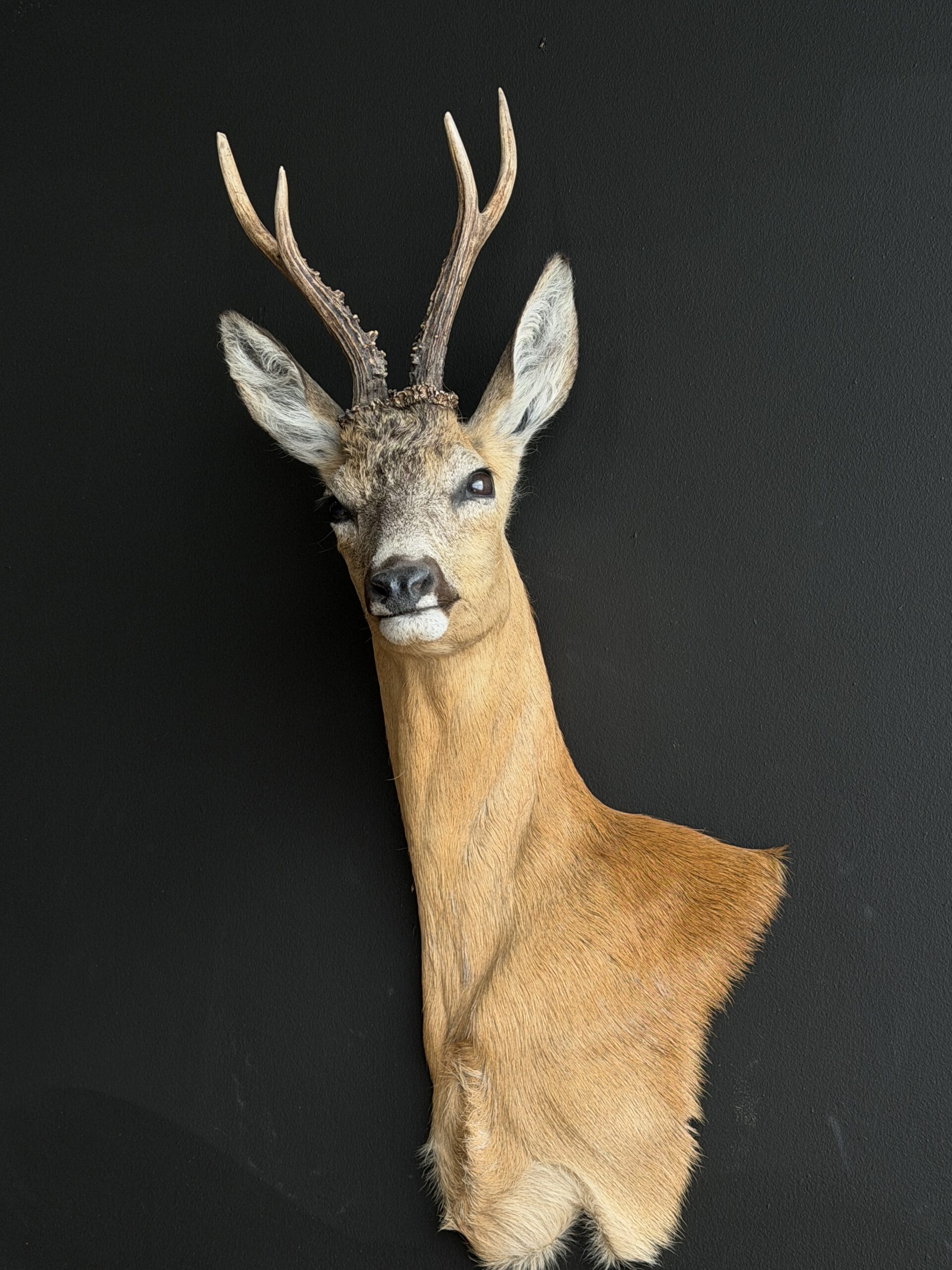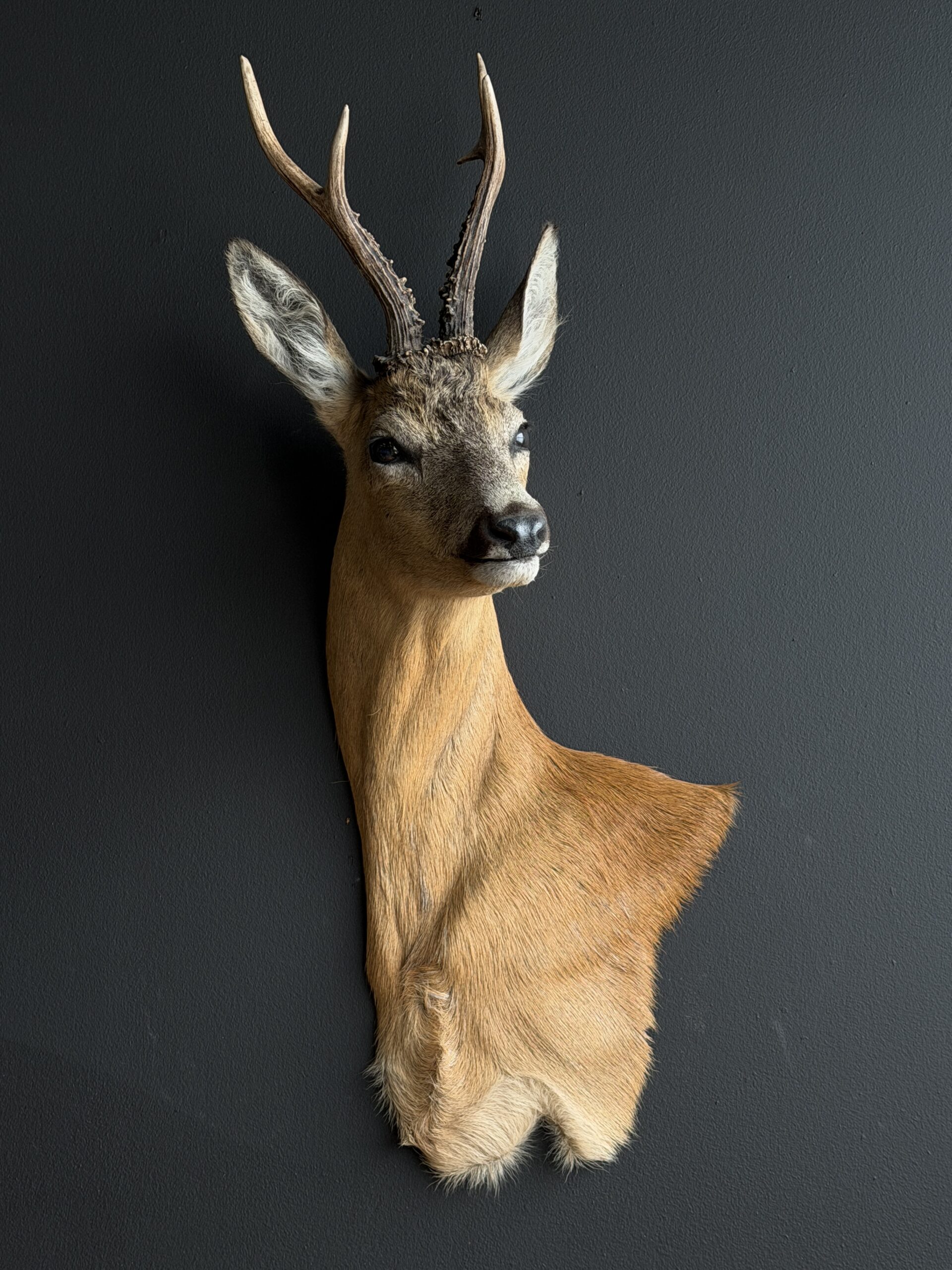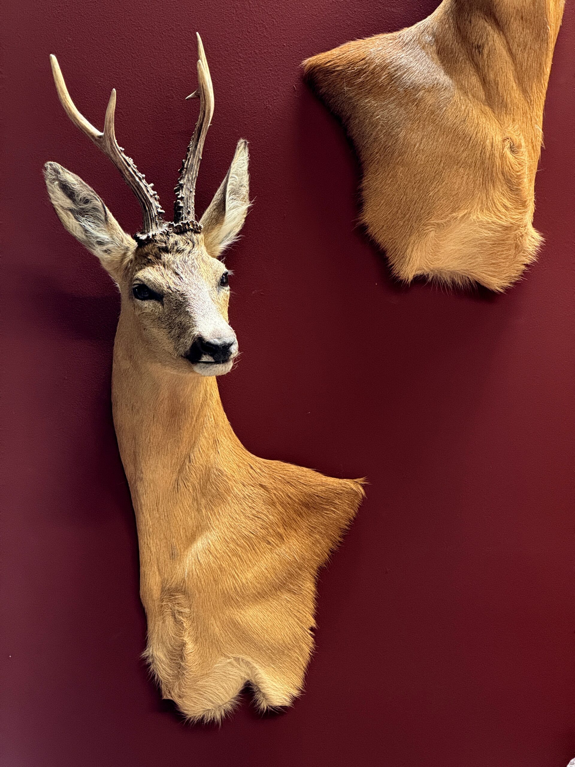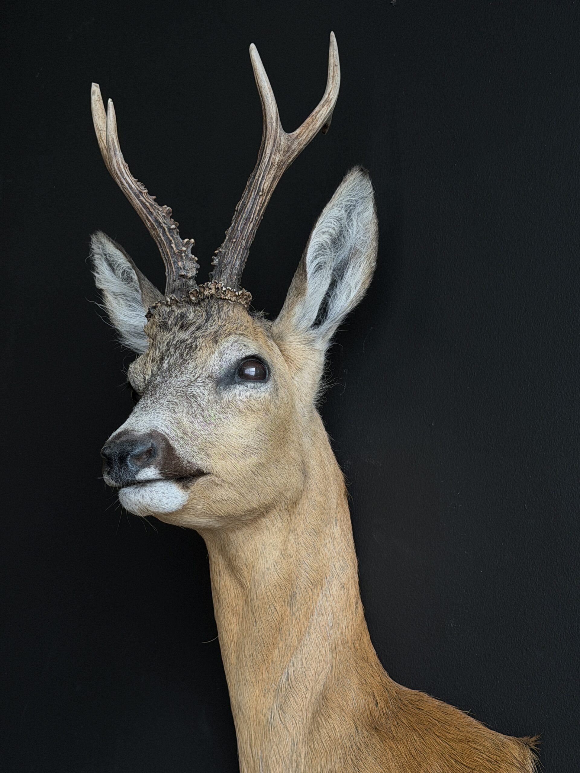A mounted head of a magnificent roebuck in its summer coat. This is a robust roebuck in a striking pose. The design makes the roebuck appear to emerge from the wall, as it were. We have various roebucks and red deer in stock, all of which are featured on our website.