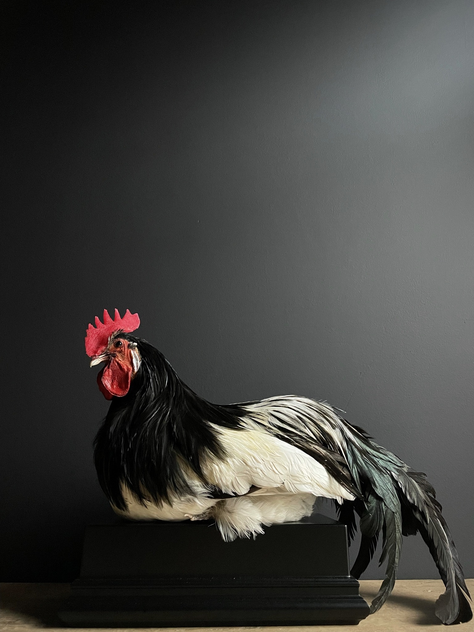 Mounted rooster on black pedestal
