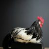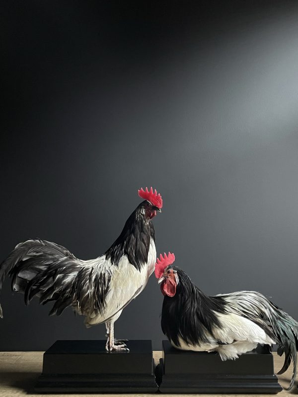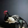 Beautiful large Laeken fowl rooster. The rooster is stuffed in a resting pose and placed on a handmade black coated pedestal. If you are looking for a special stuffed chicken or rooster please let us know.