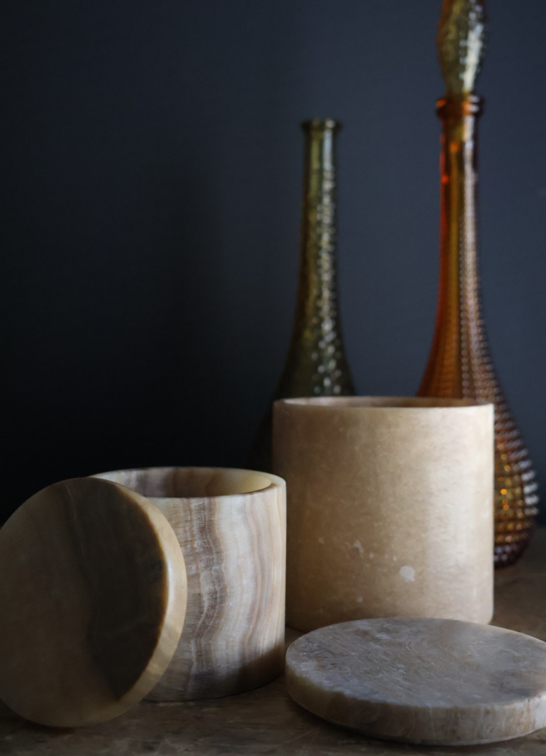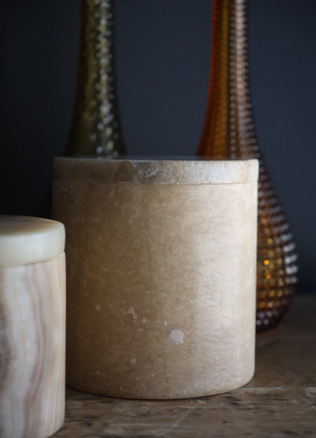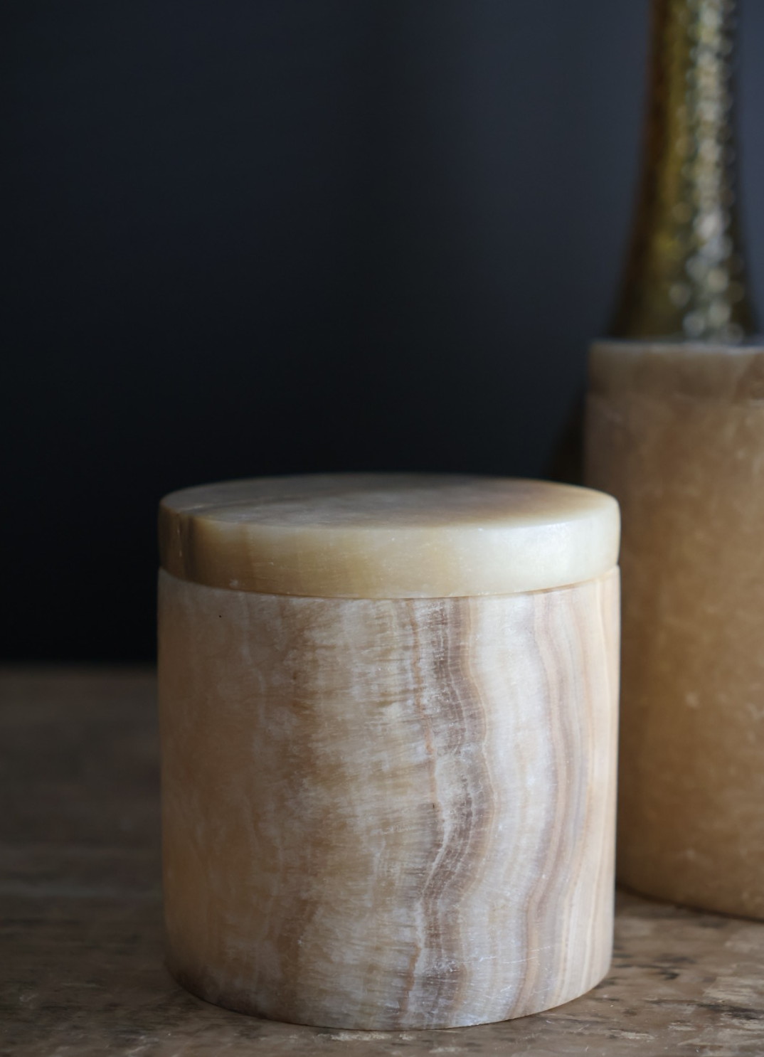 Onyx, a luxurious natural stone with beautiful colour patterns and translucent layers, exudes elegance and sophistication. Each pot is unique due to the natural markings of the stone from soft cream tones to deep green or amber veins. These pots are not only functional for storing small items, but also serve as stylish decoration on a sideboard, bathroom shelf or coffee table.