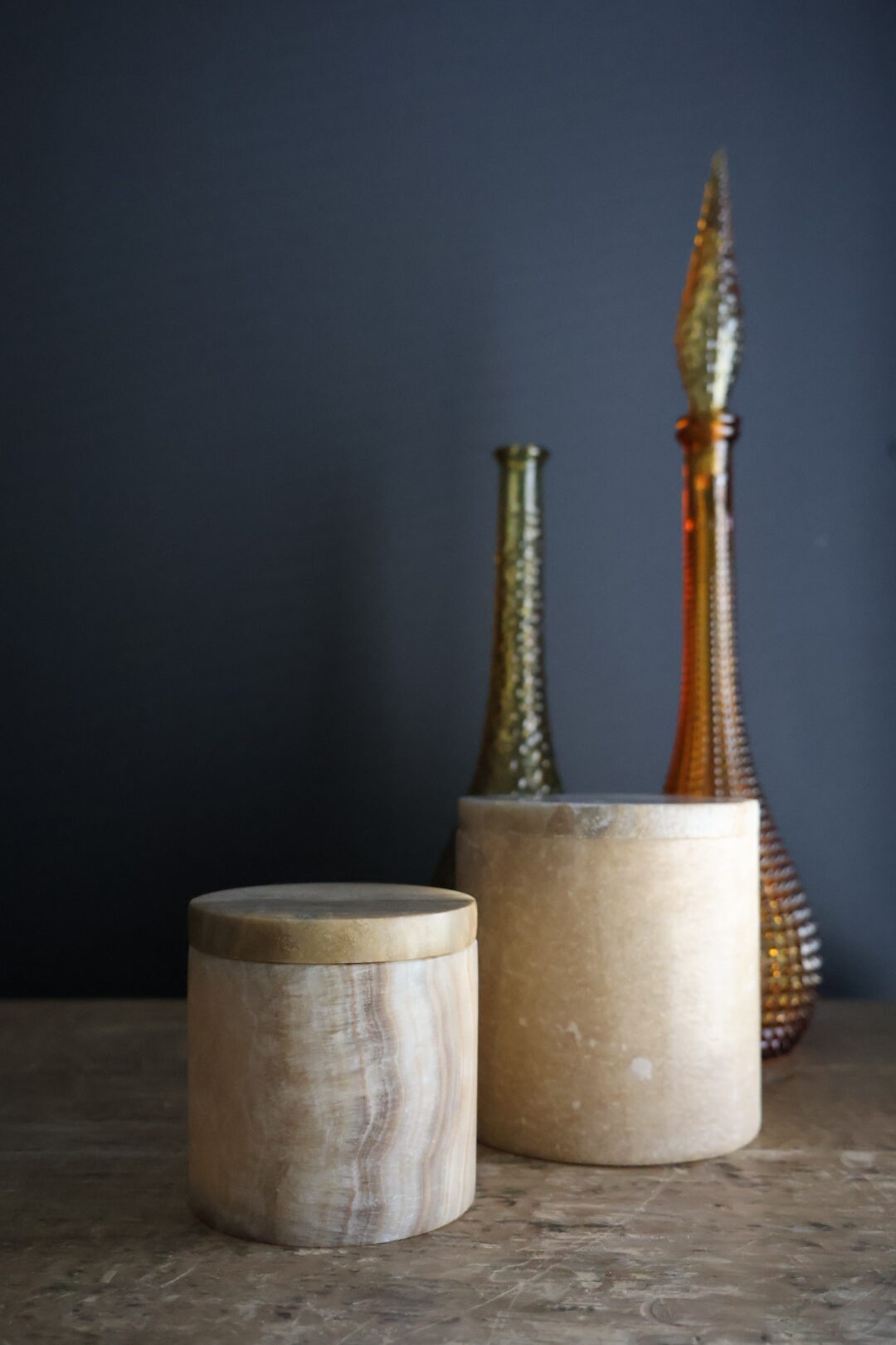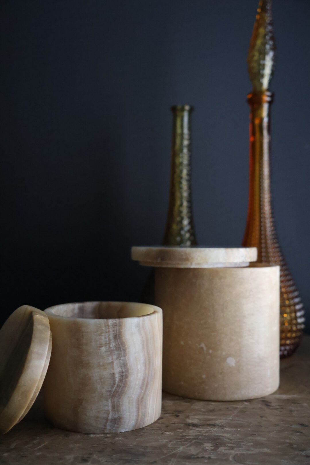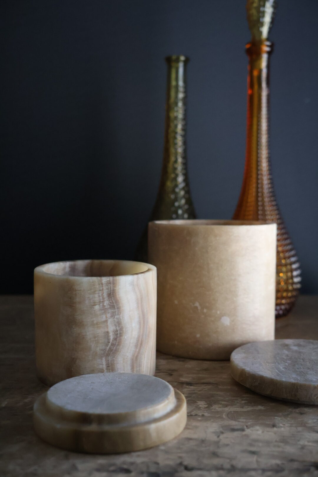 Onyx, a luxurious natural stone with beautiful colour patterns and translucent layers, exudes elegance and sophistication. Each pot is unique due to the natural markings of the stone from soft cream tones to deep green or amber veins. These pots are not only functional for storing small items, but also serve as stylish decoration on a sideboard, bathroom shelf or coffee table.