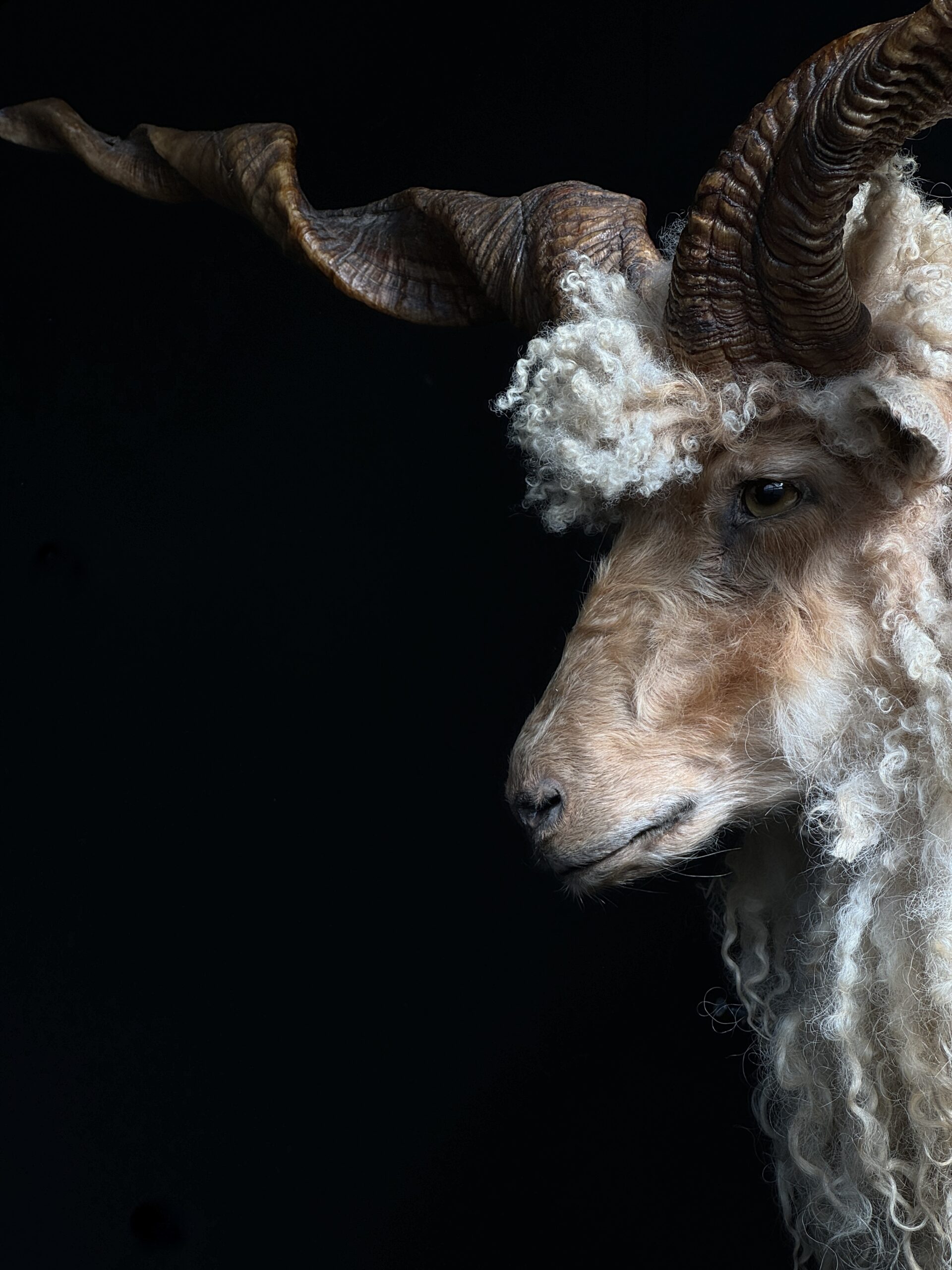 Mounted head of a Racka sheep. The Racka is a very ancient breed and belongs to the family of Zackal sheep. More than 8000 years ago, sheep were depicted on Egyptian wall paintings with screw-shaped horns and a long tail. It is likely that the Hungarian Racka is a descendant of the animals depicted.