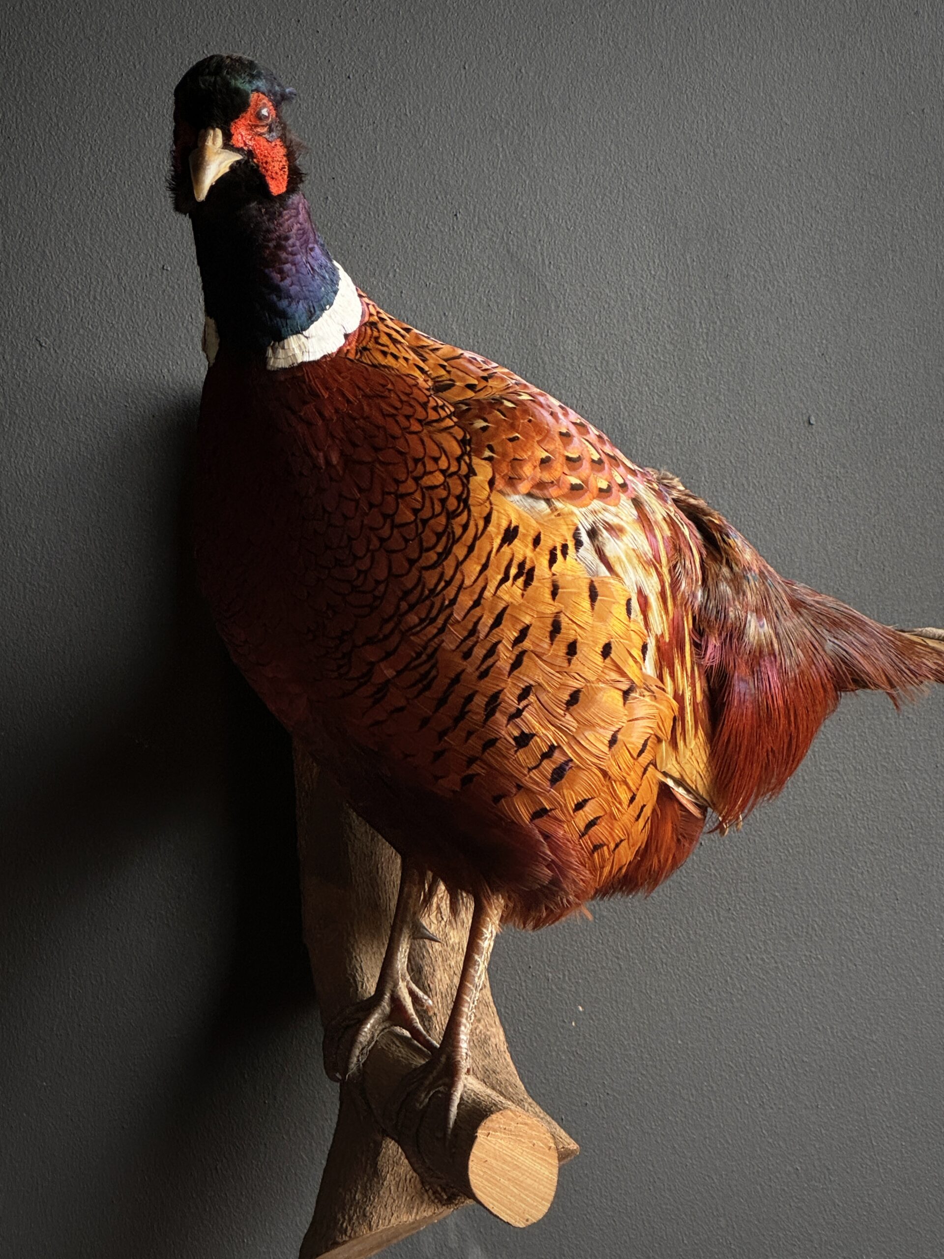 Mounted pheasant, mounted on a wooden stump for wall mounting.