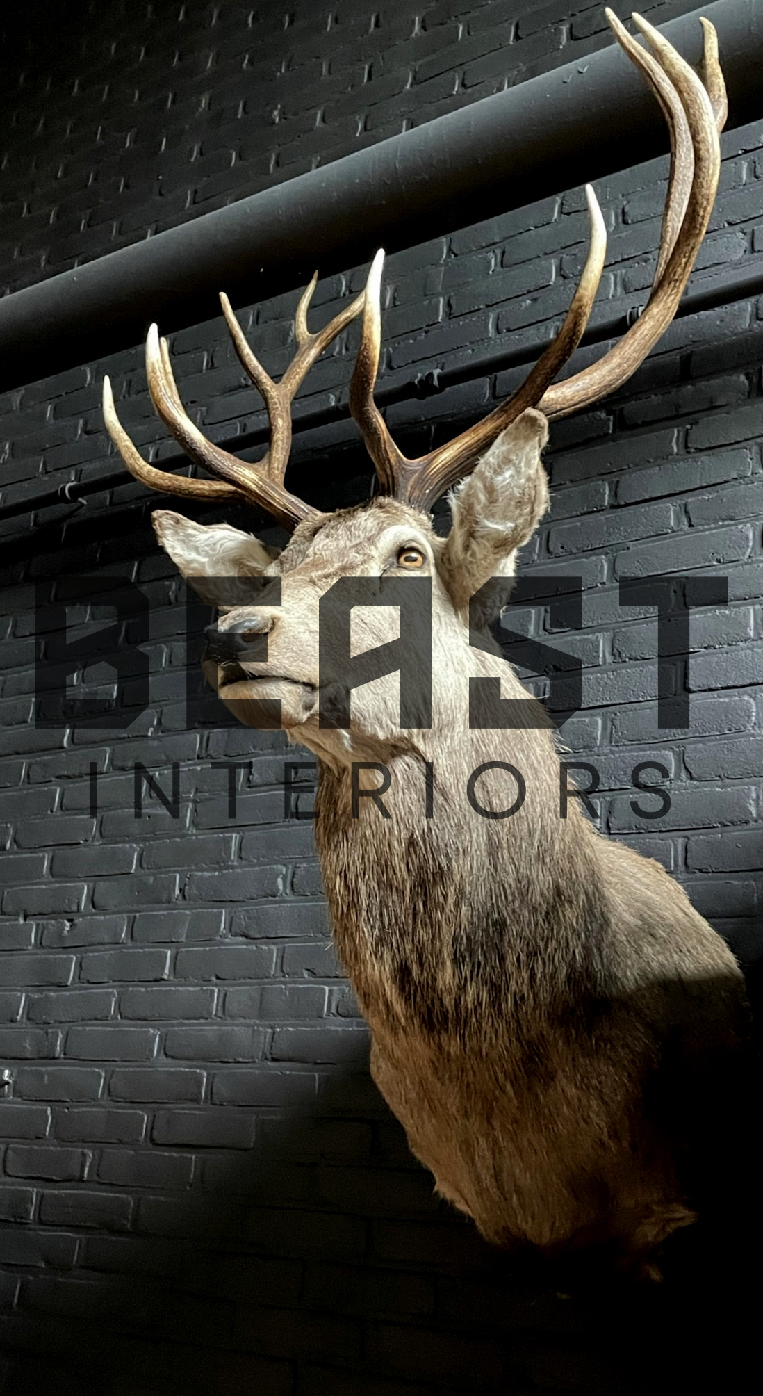 Recent opgezette kop van een edelhert uit Schotland. Het is een zeer mooi geprepareerd in een sierlijke pose. Het is een exemplaar wat levensecht is opgezet.