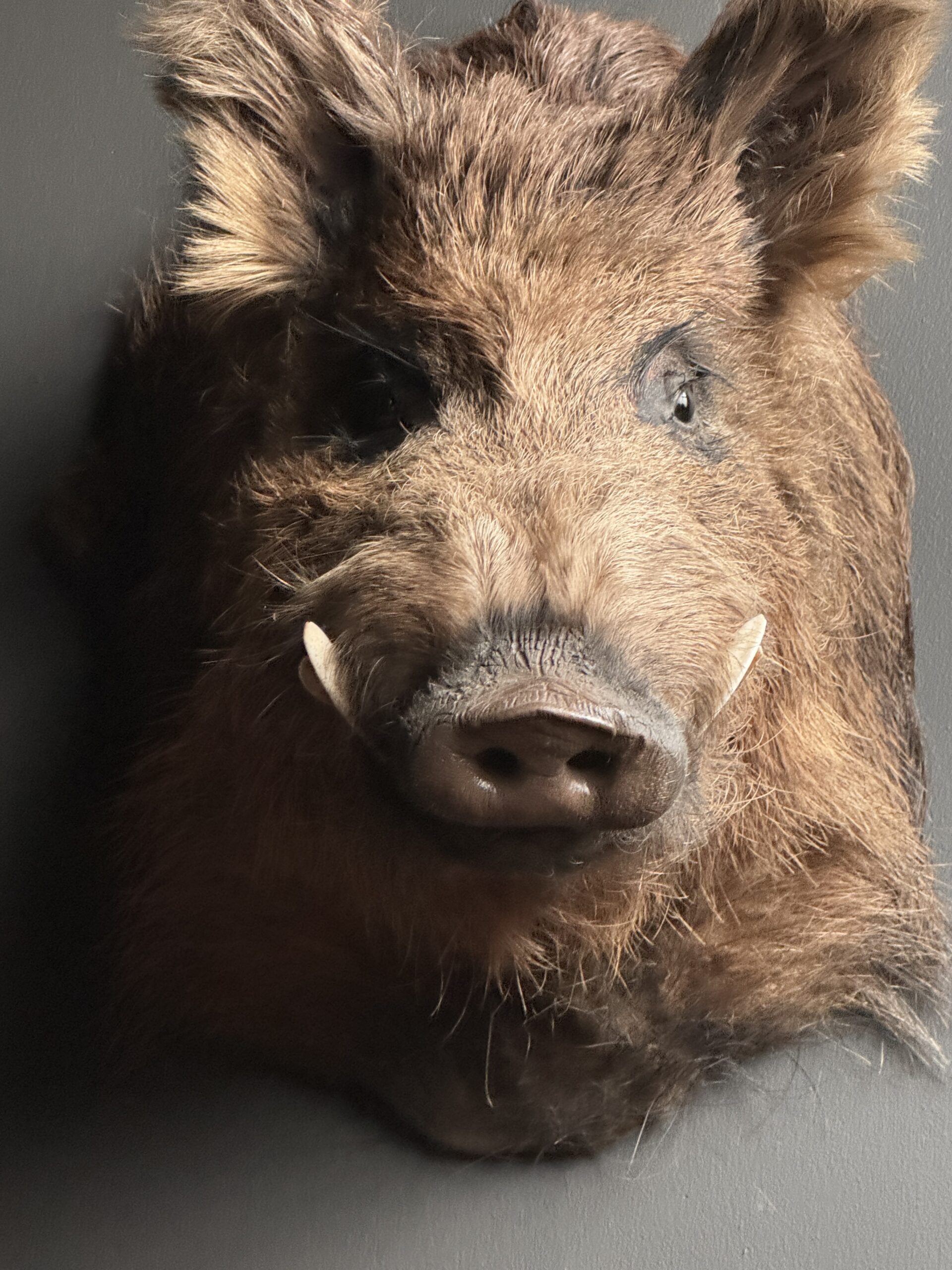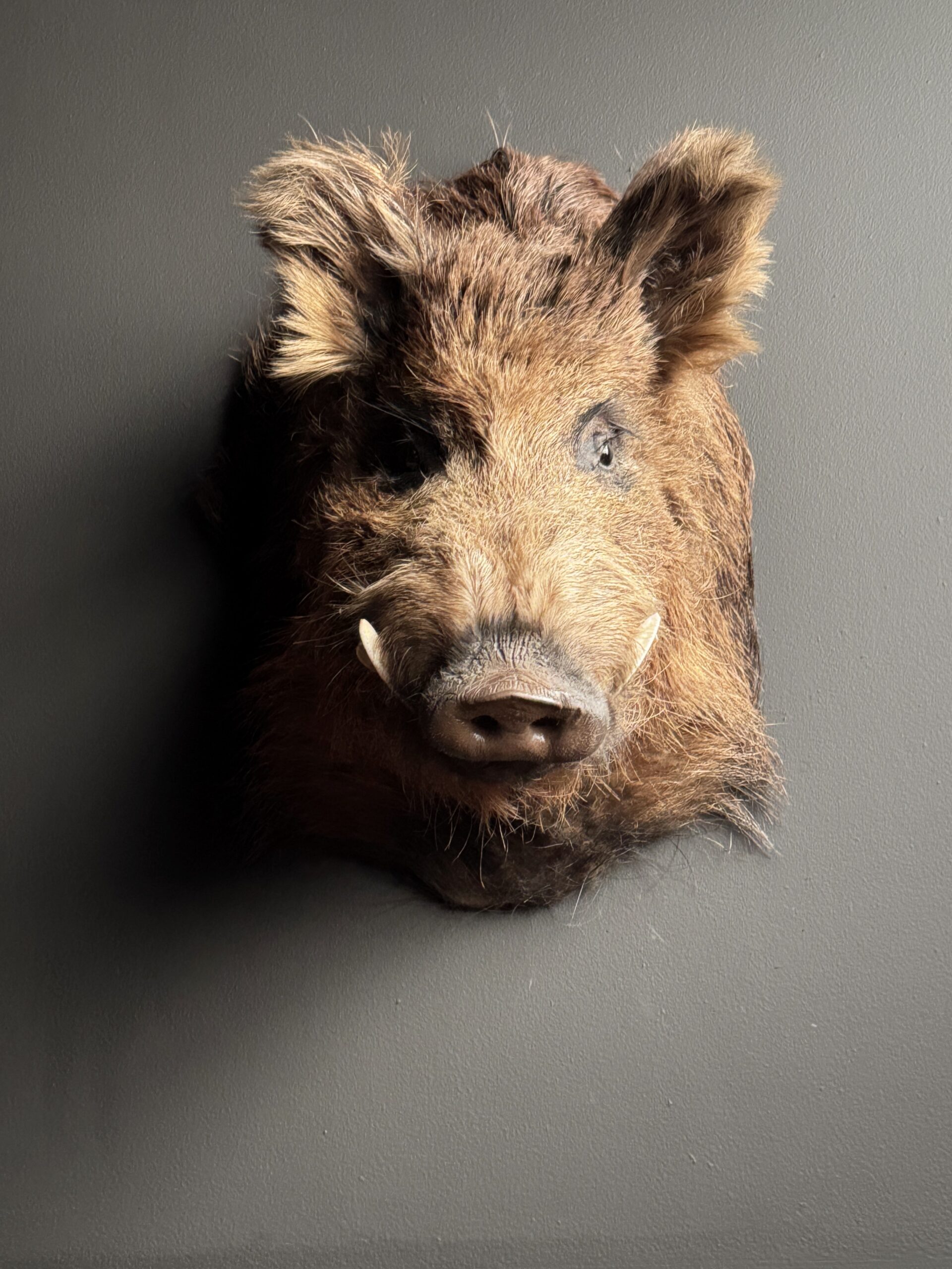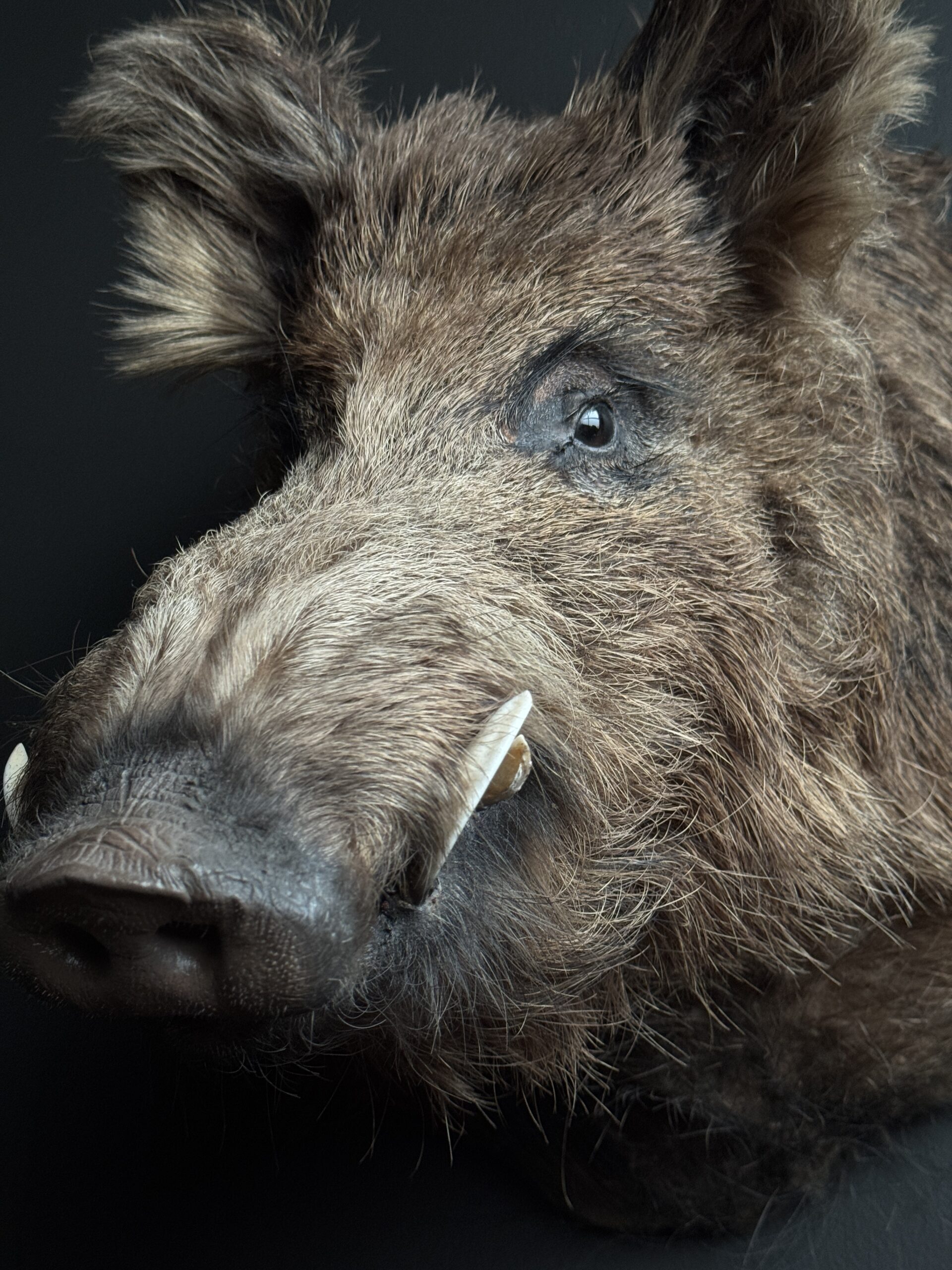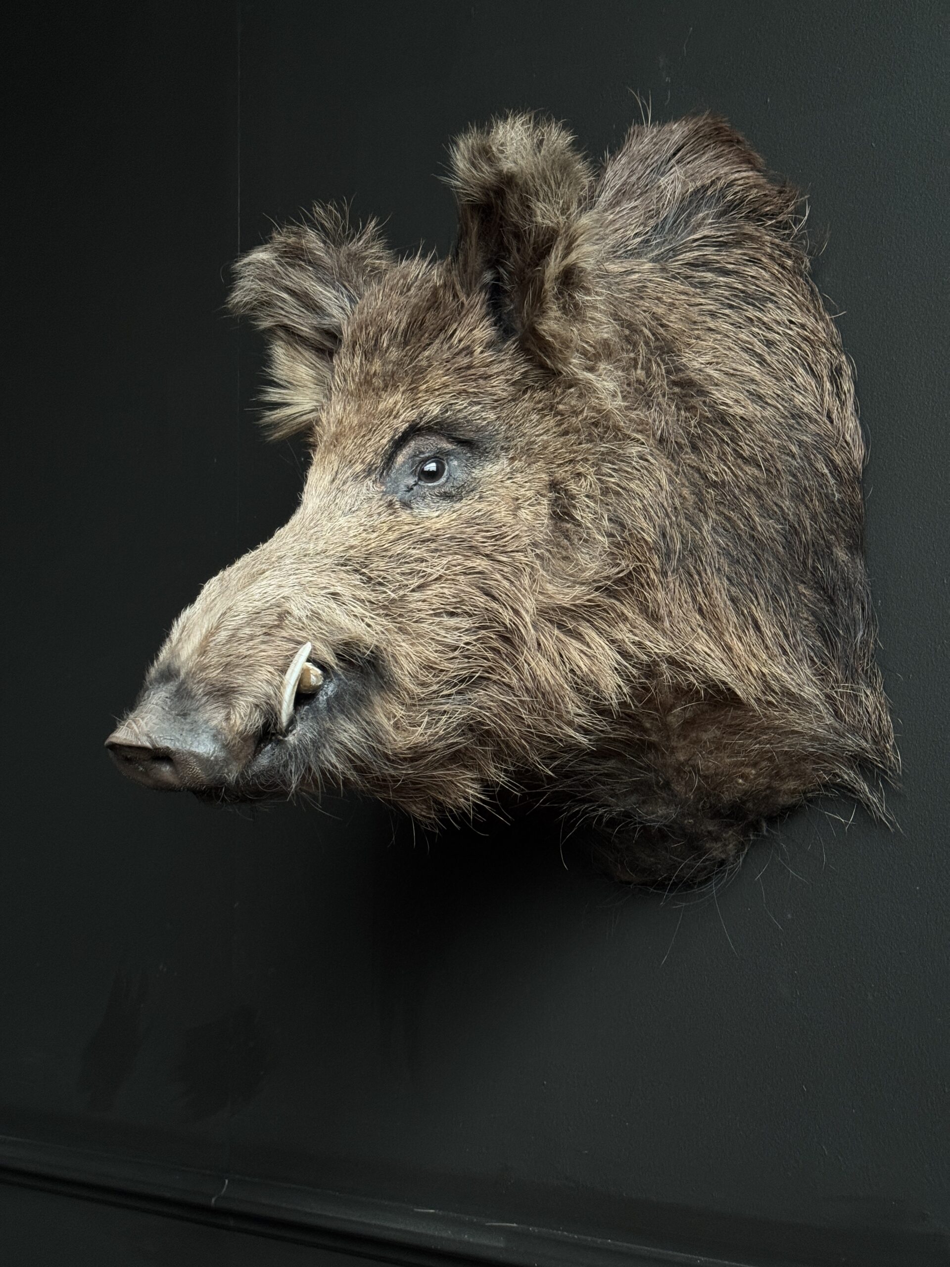 This stuffed head of a wild boar is a real eye-catcher for a tough and authentic interior. It has a beautiful, characteristic look and immediately brings a robust atmosphere to your home, mancave or hunting cabin.
