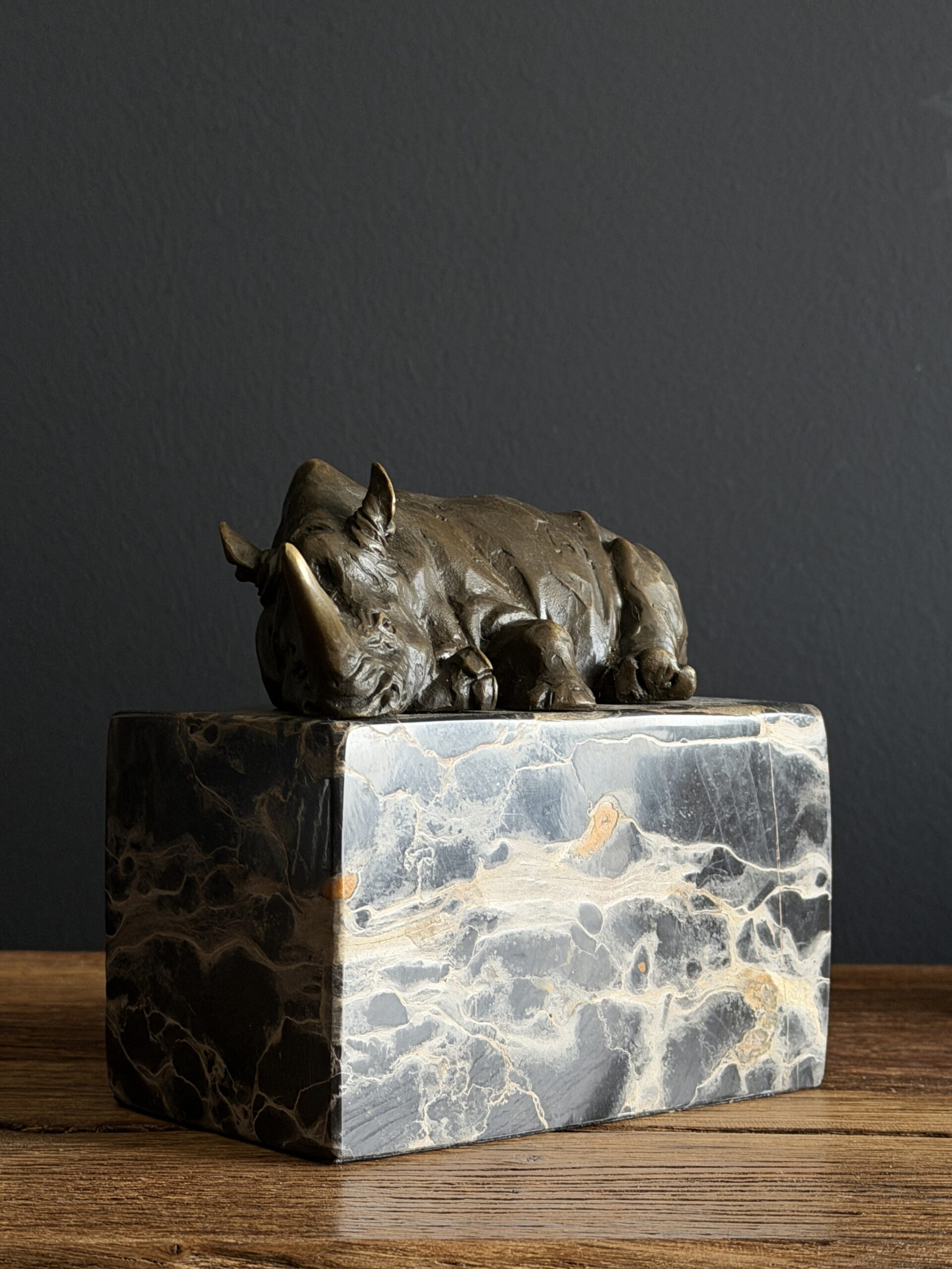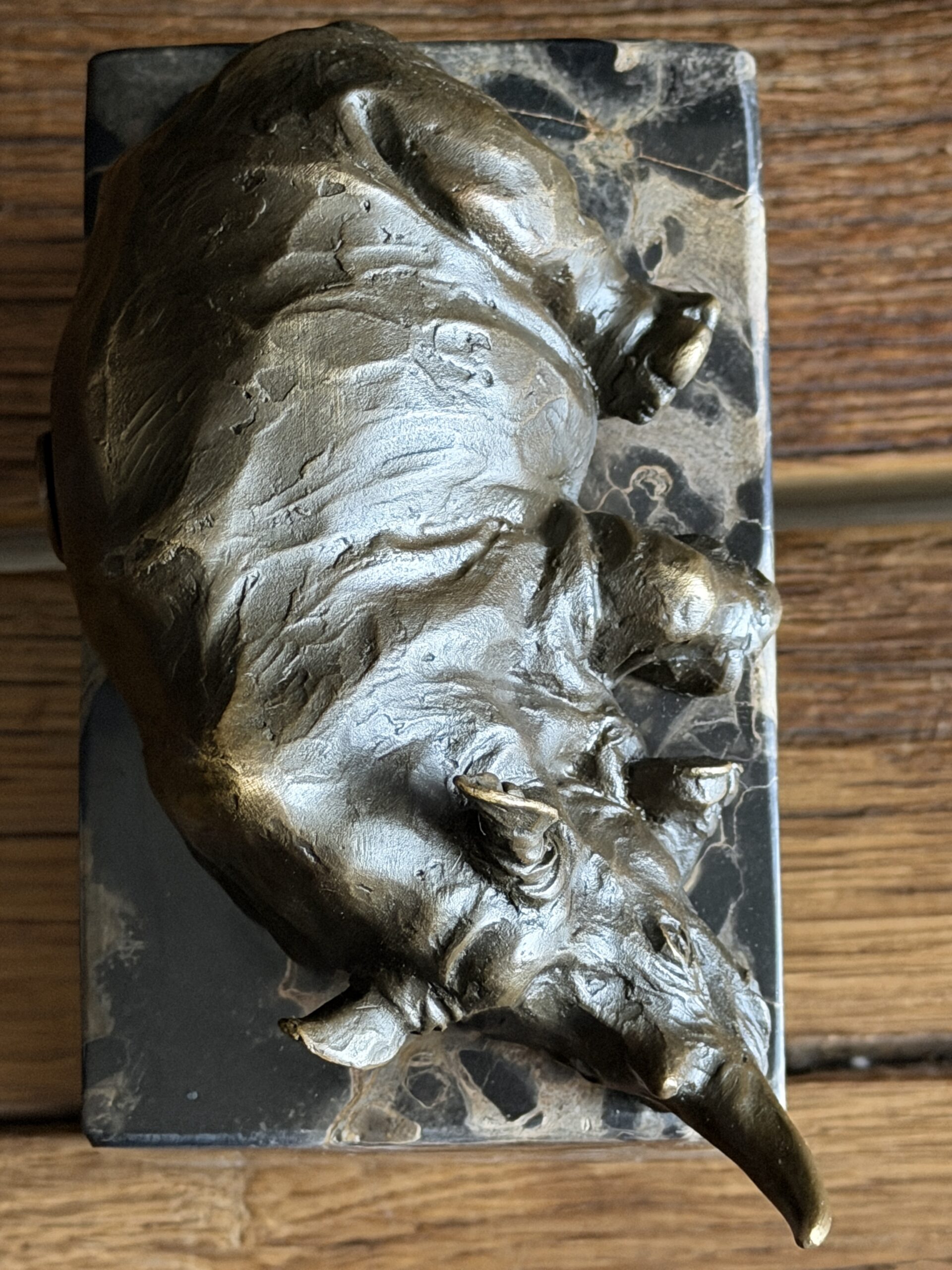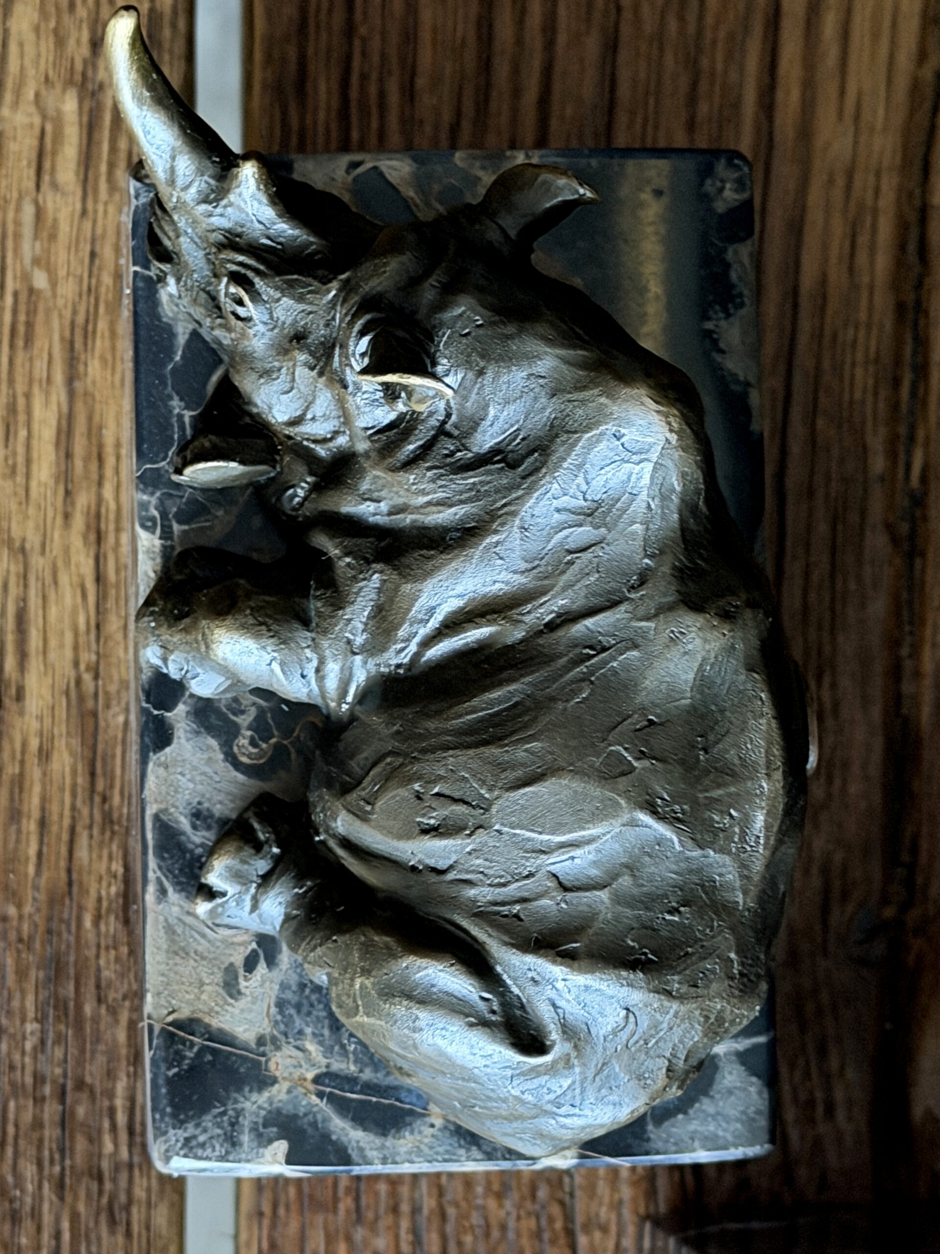 Heavy bronze sculpture of a rhinoceros on marble plinth.