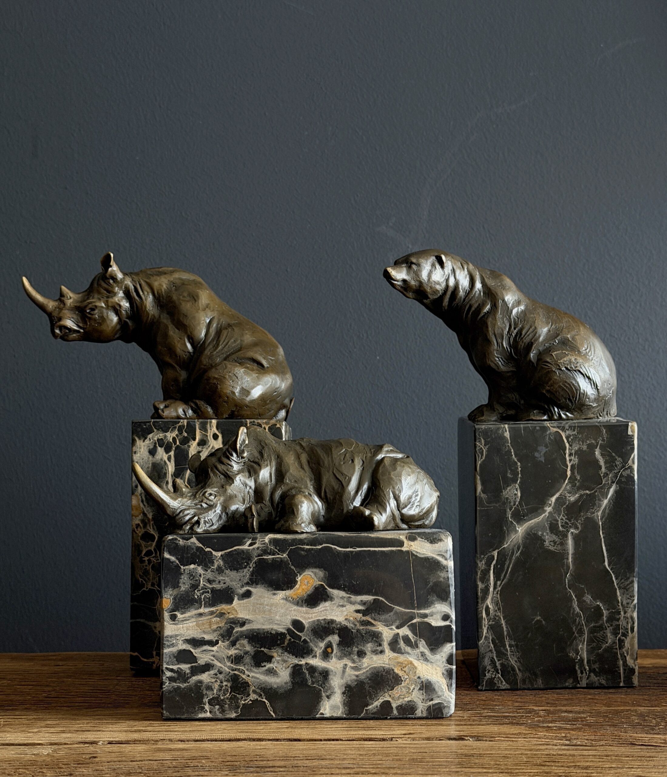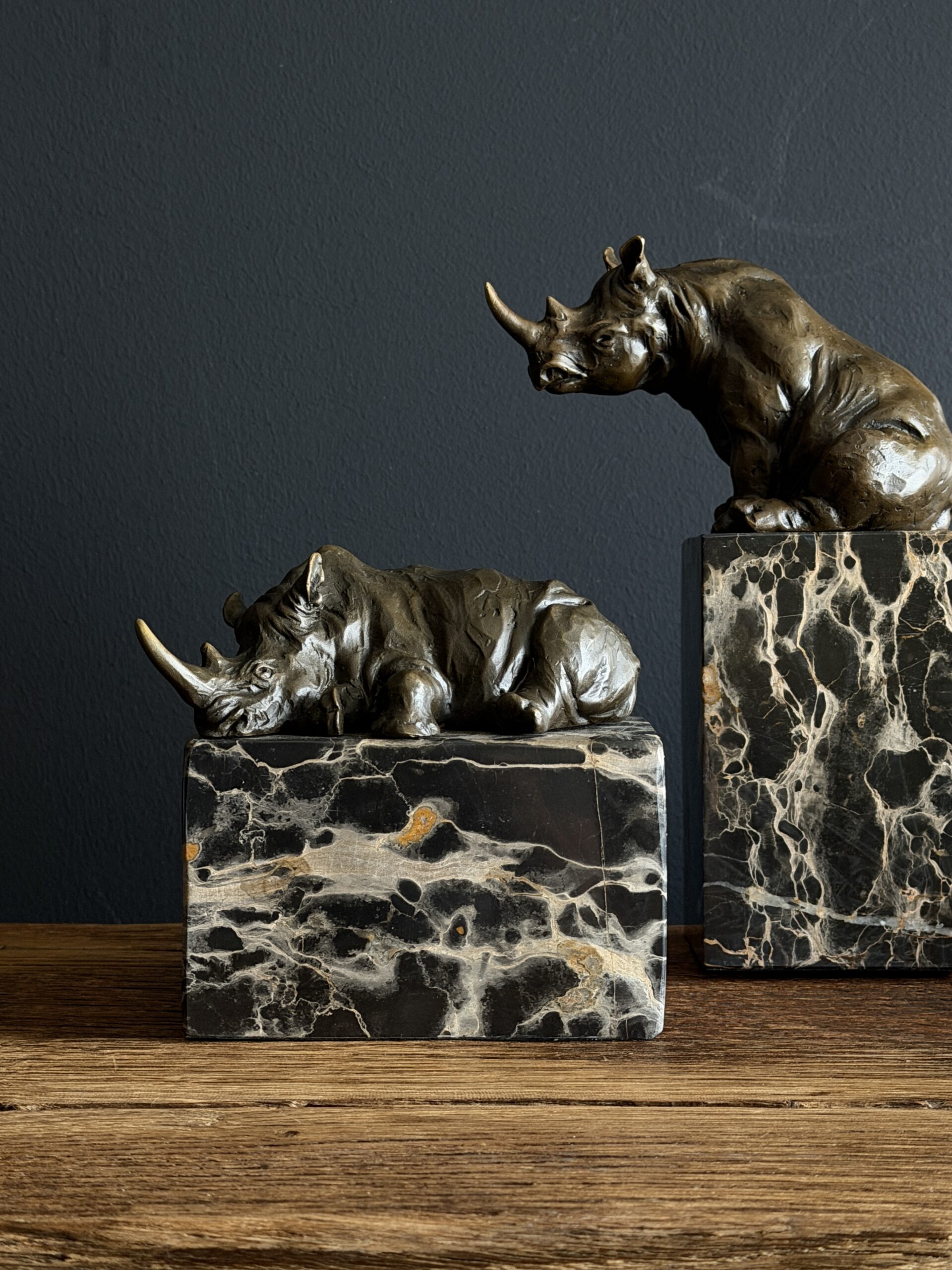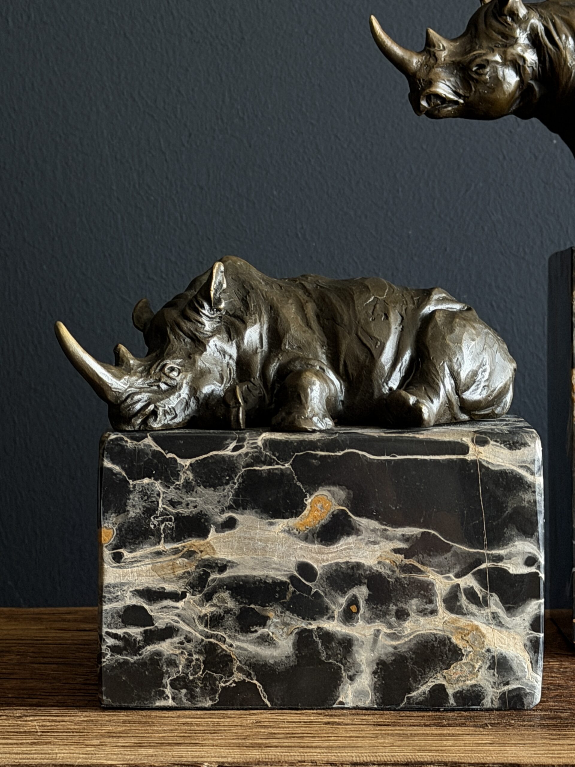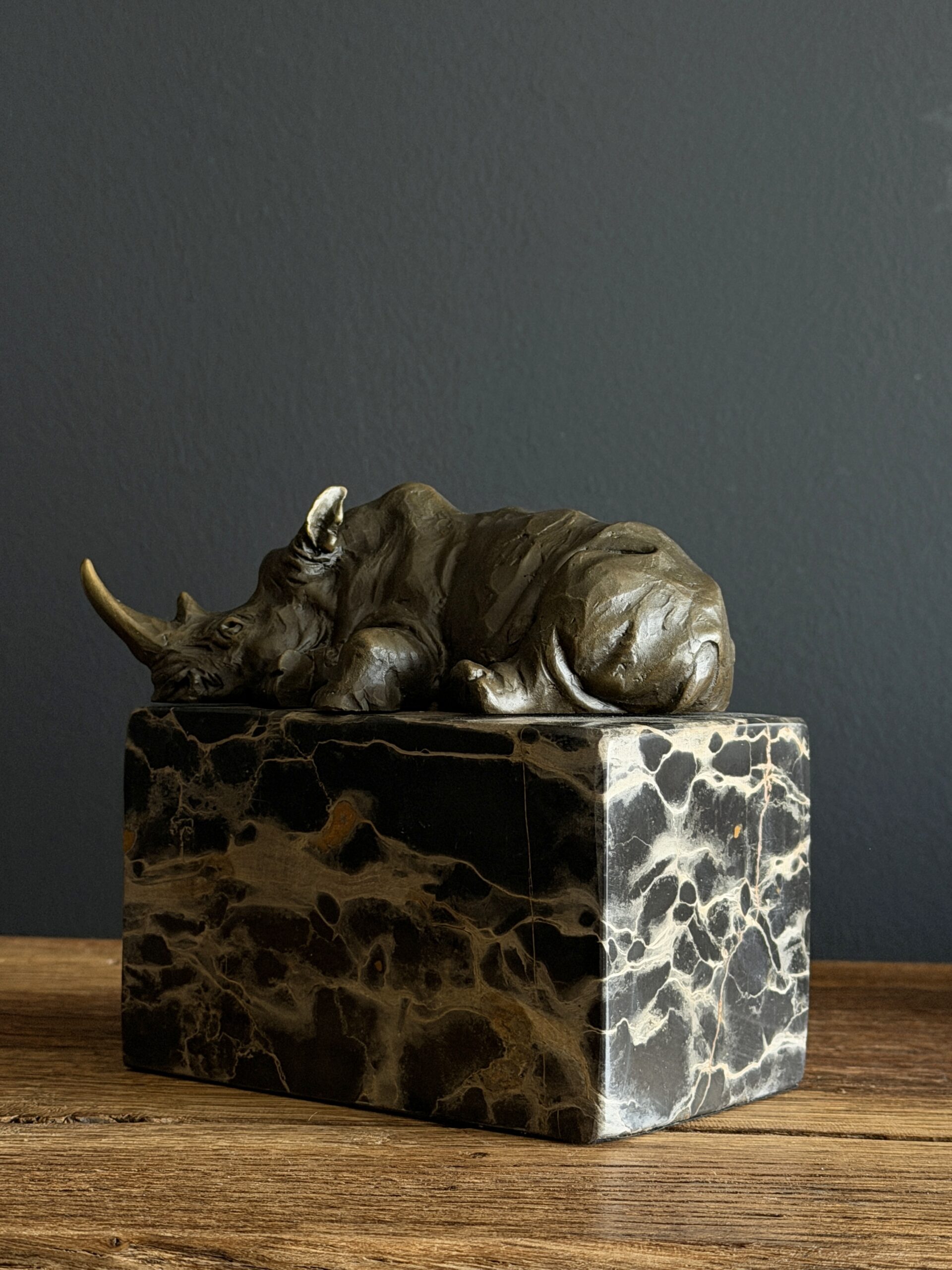 Heavy bronze sculpture of a rhinoceros on marble plinth.