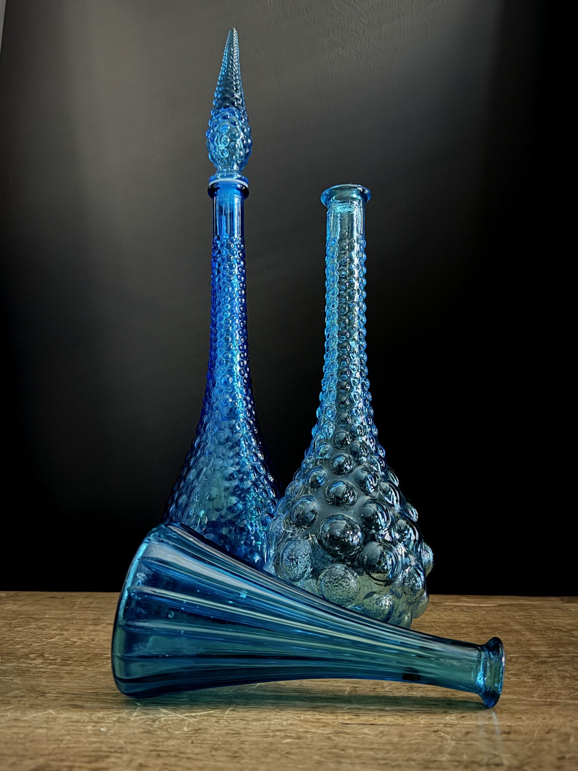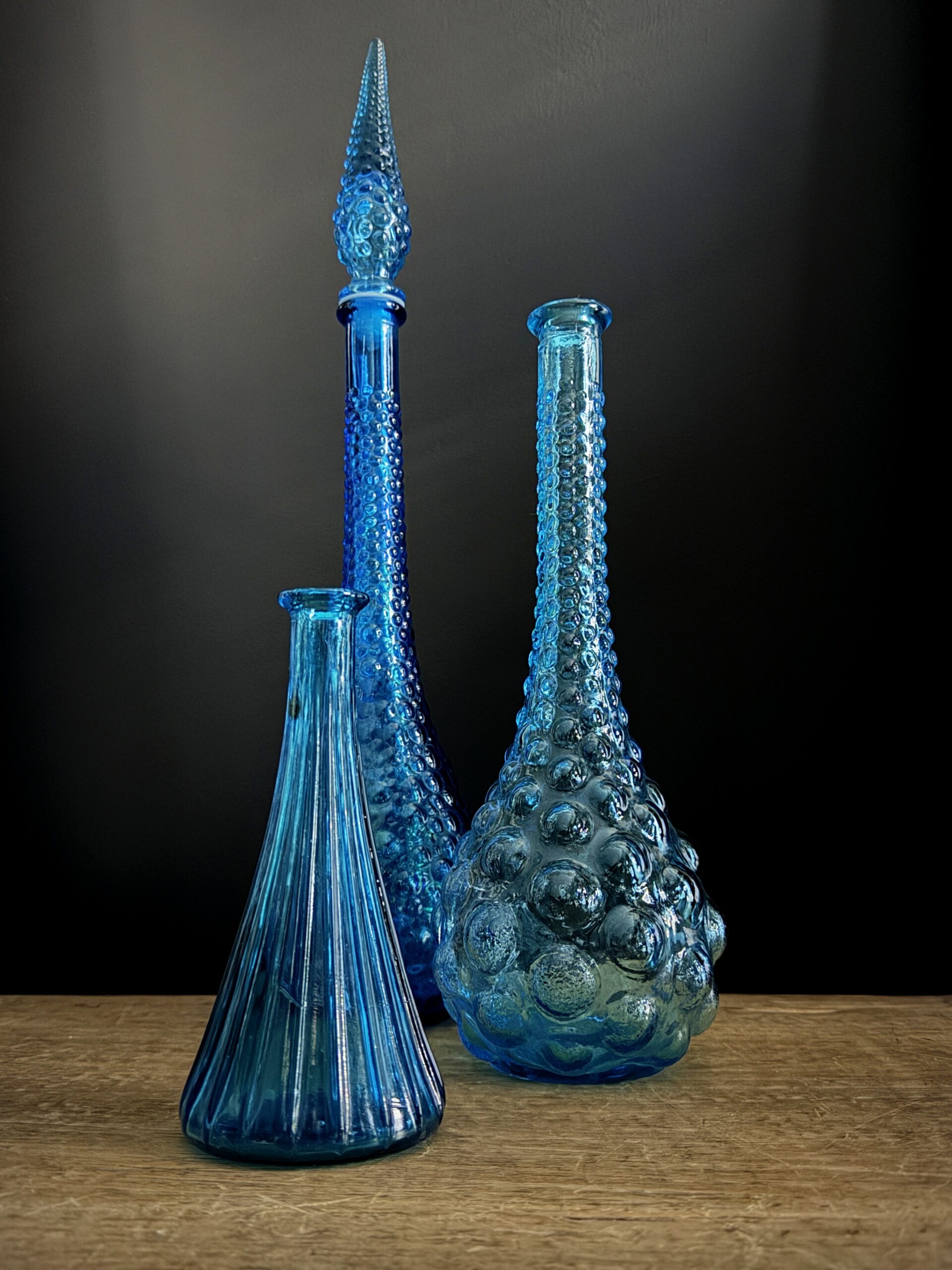 Beautiful set of 3 old Empoli decanters.