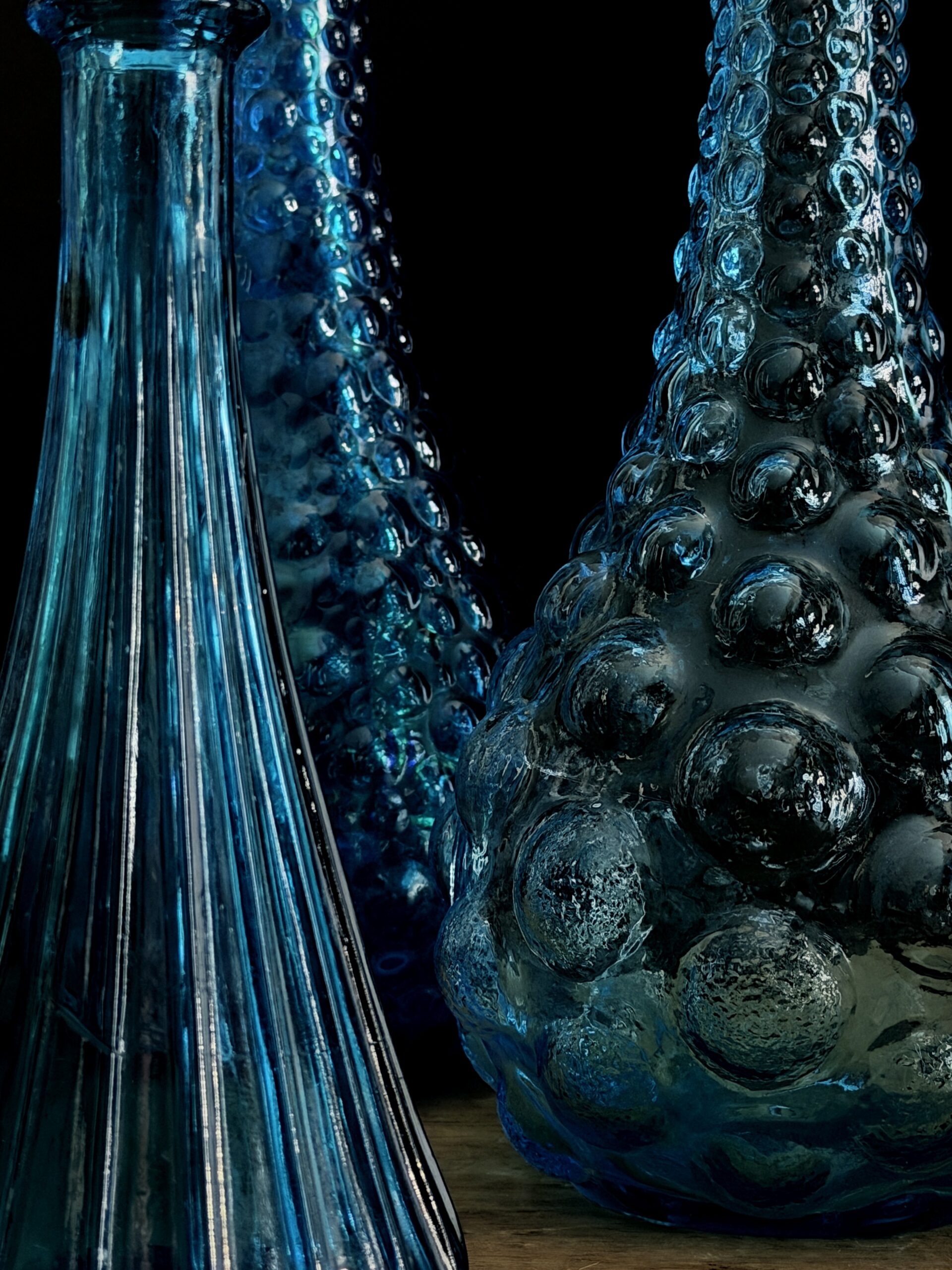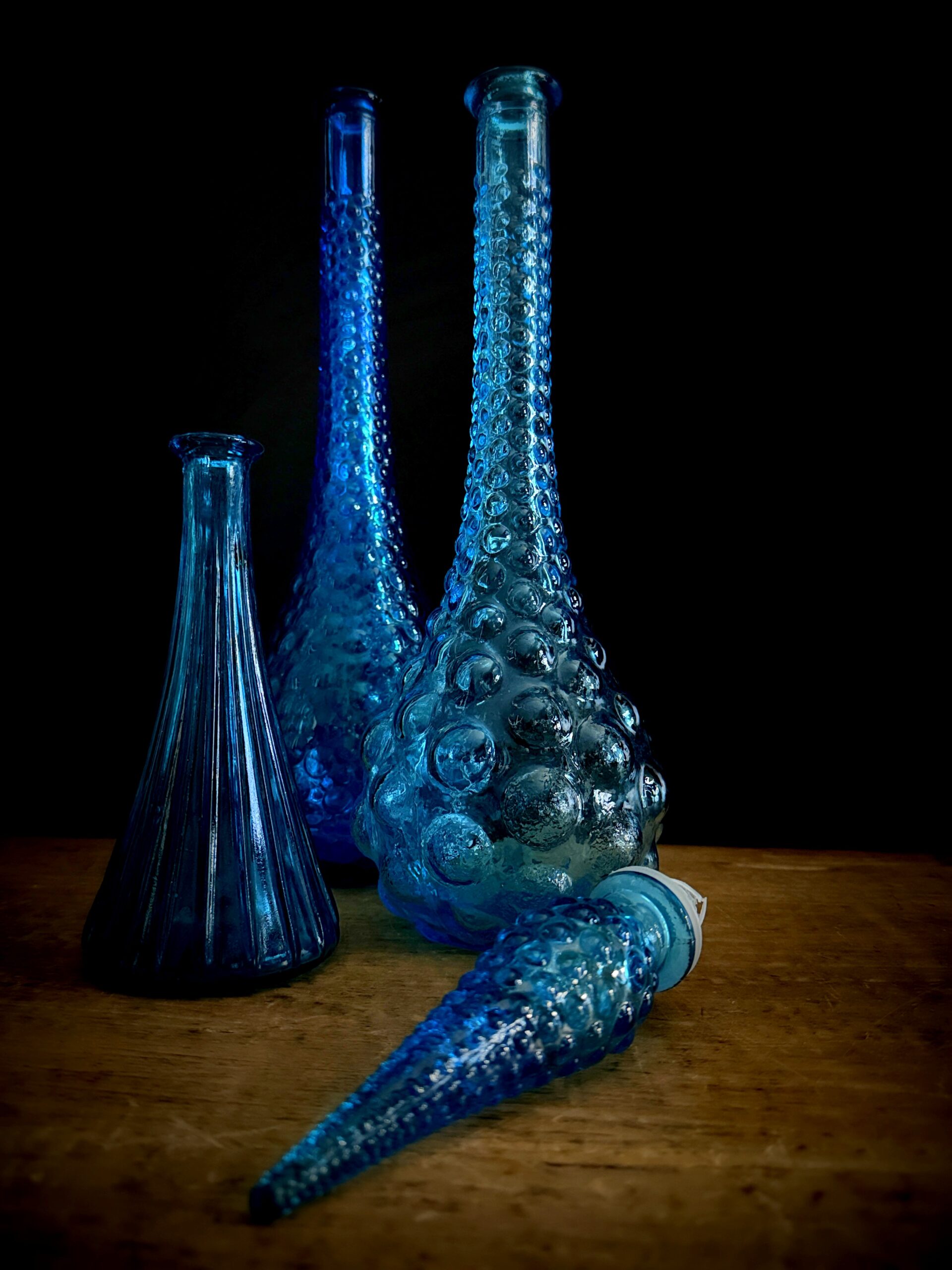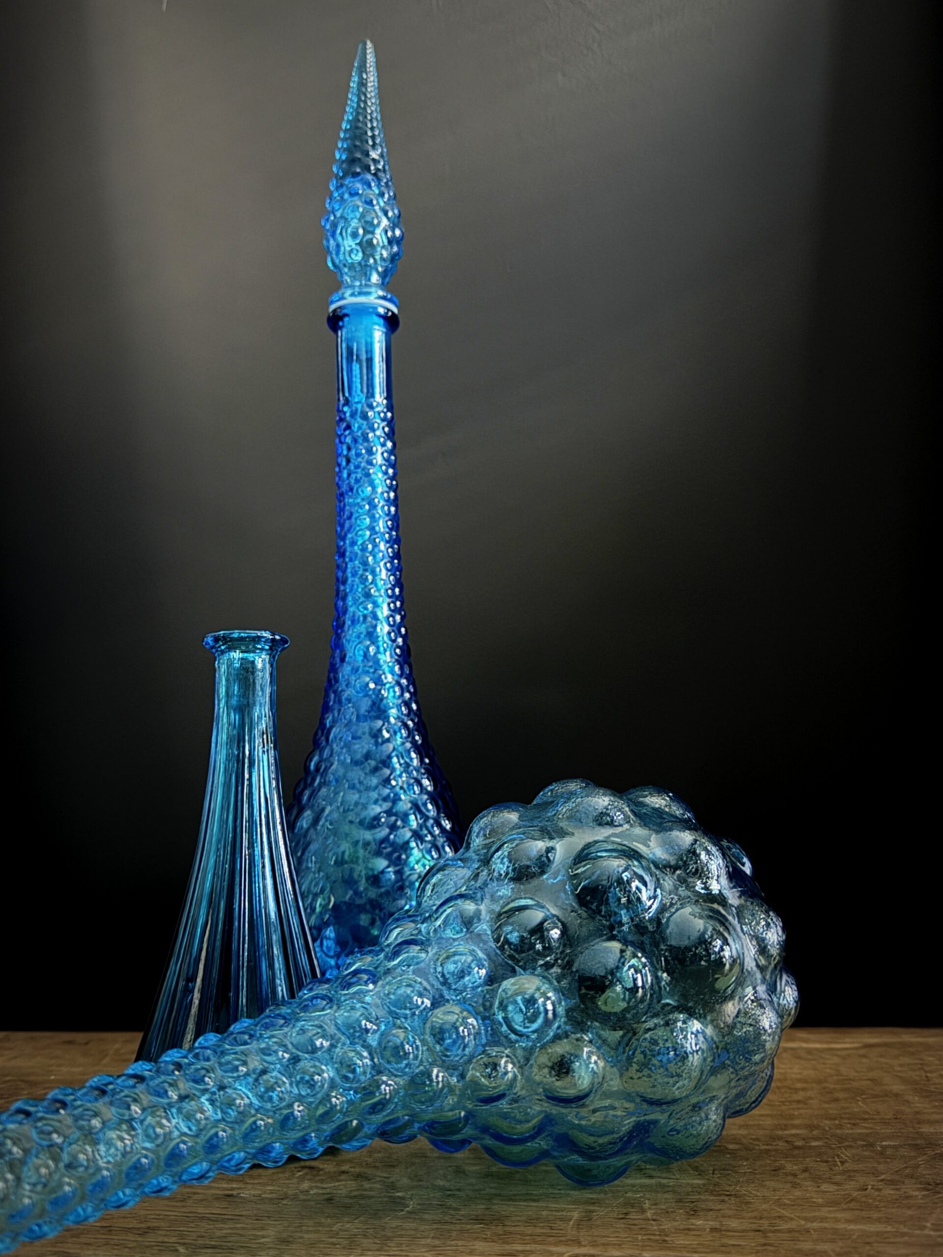 Empoli decanters are especially famous for their colourful and artistic designs. These decanters are often handmade, which means that each piece is unique. Traditional Empoli decanters are usually made of clear or coloured glass and often decorated with patterns of bubbles, ridges or drop-shaped ornaments that give the glass an organic, almost sculptural look. Most of these decanters have a graceful, flowing shape, with a long neck and an elegant pouring opening, making them both practical and aesthetic objects. One of the most striking features of Empoli decanters is the use of colour. Empoli glassblowers often used rich, vibrant colours, from amber and greens to shades of blue and even more bold colours such as fuchsia and orange. This made Empoli glass a popular choice for decoration in the 1960s and 1970s, an era when the Italian design movement flourished.