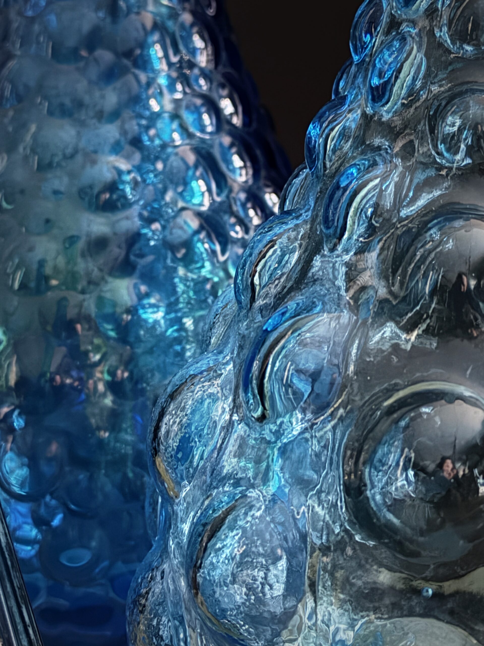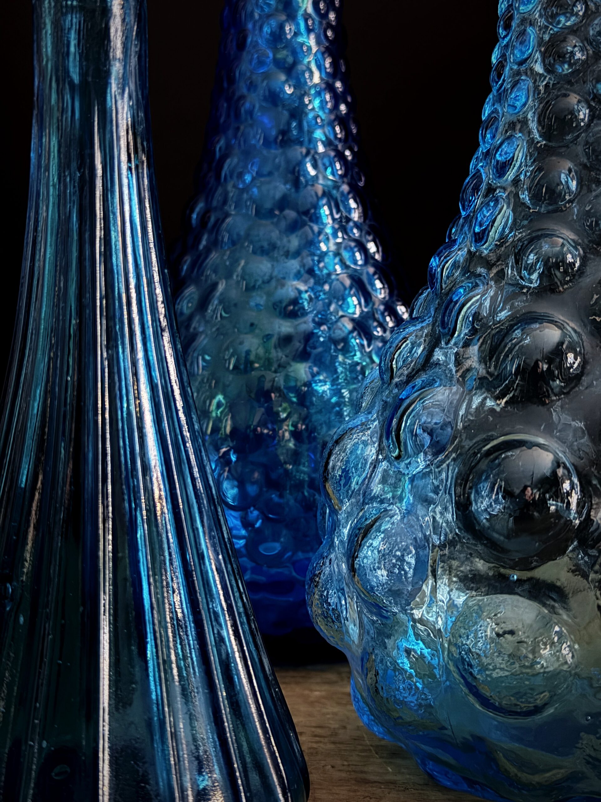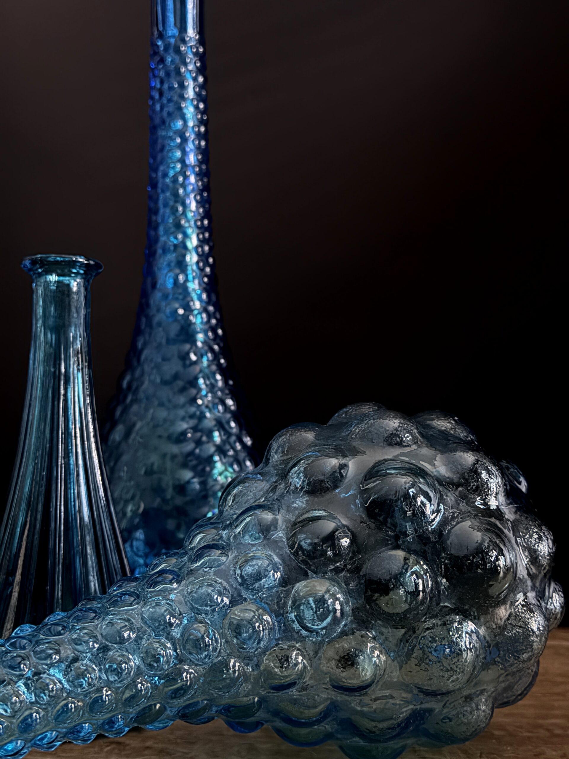 Empoli decanters are especially famous for their colourful and artistic designs. These decanters are often handmade, which means that each piece is unique. Traditional Empoli decanters are usually made of clear or coloured glass and often decorated with patterns of bubbles, ridges or drop-shaped ornaments that give the glass an organic, almost sculptural look. Most of these decanters have a graceful, flowing shape, with a long neck and an elegant pouring opening, making them both practical and aesthetic objects. One of the most striking features of Empoli decanters is the use of colour. Empoli glassblowers often used rich, vibrant colours, from amber and greens to shades of blue and even more bold colours such as fuchsia and orange. This made Empoli glass a popular choice for decoration in the 1960s and 1970s, an era when the Italian design movement flourished.