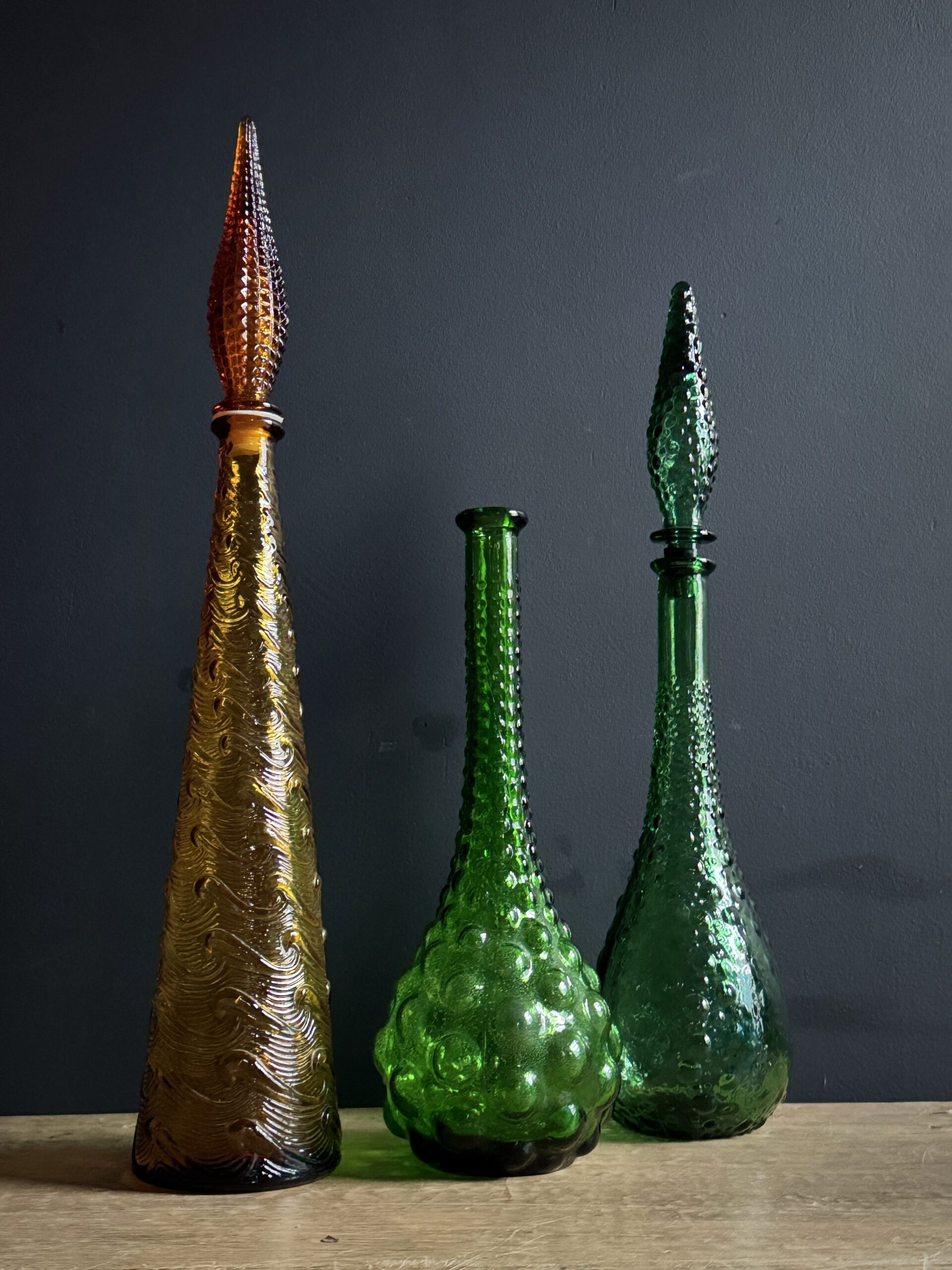 Empoli decanters are especially famous for their colourful and artistic designs. These decanters are often handmade, which means that each piece is unique. Traditional Empoli decanters are usually made of clear or coloured glass and often decorated with patterns of bubbles, ridges or drop-shaped ornaments that give the glass an organic, almost sculptural look. Most of these decanters have a graceful, flowing shape, with a long neck and an elegant pouring opening, making them both practical and aesthetic objects. One of the most striking features of Empoli decanters is the use of colour. Empoli glassblowers often used rich, vibrant colours, from amber and greens to shades of blue and even more bold colours such as fuchsia and orange. This made Empoli glass a popular choice for decoration in the 1960s and 1970s, an era when the Italian design movement flourished.