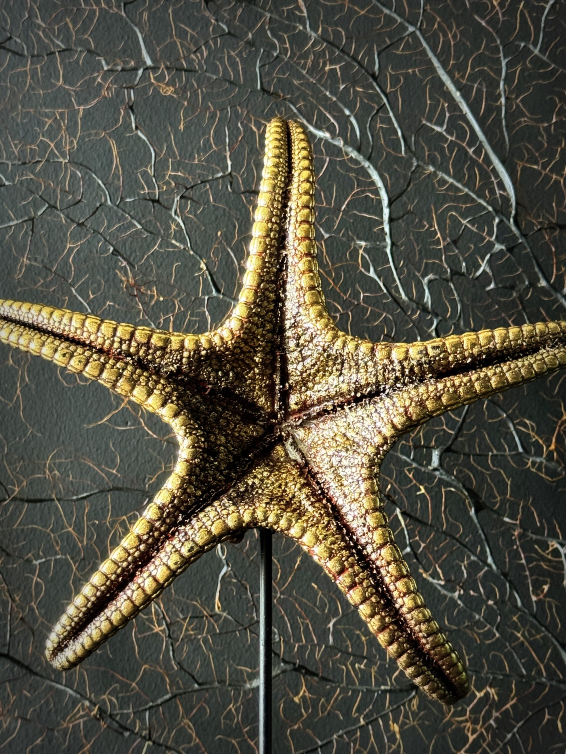 Starfish which is coated with real metal (Renaissance gold) and placed on a base. This starfish has a particularly symmetrical pattern and the metallizing process gives it a beautiful look. We can metallize the starfish on different colors.