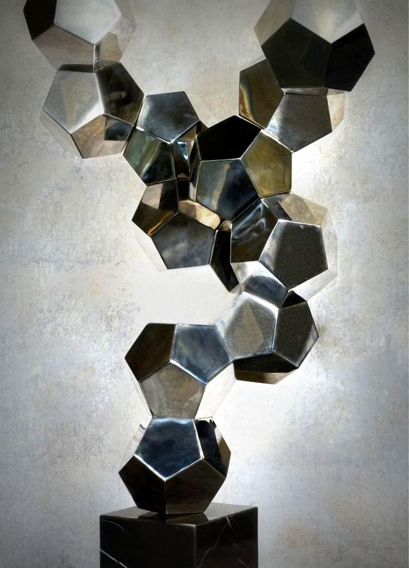 This sculpture is inspired by the structure of ore formed from molten silicates and the rich volatile combinations which are produced. In this instance 12-sided shapes, called dodecagons, combine together. Mineral 2.0 is an aerial version fit for a collection of artistic curiosities.
