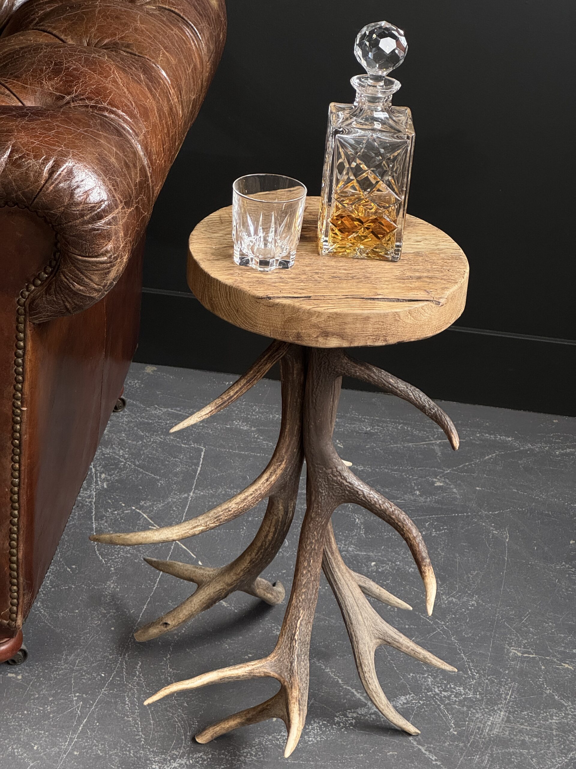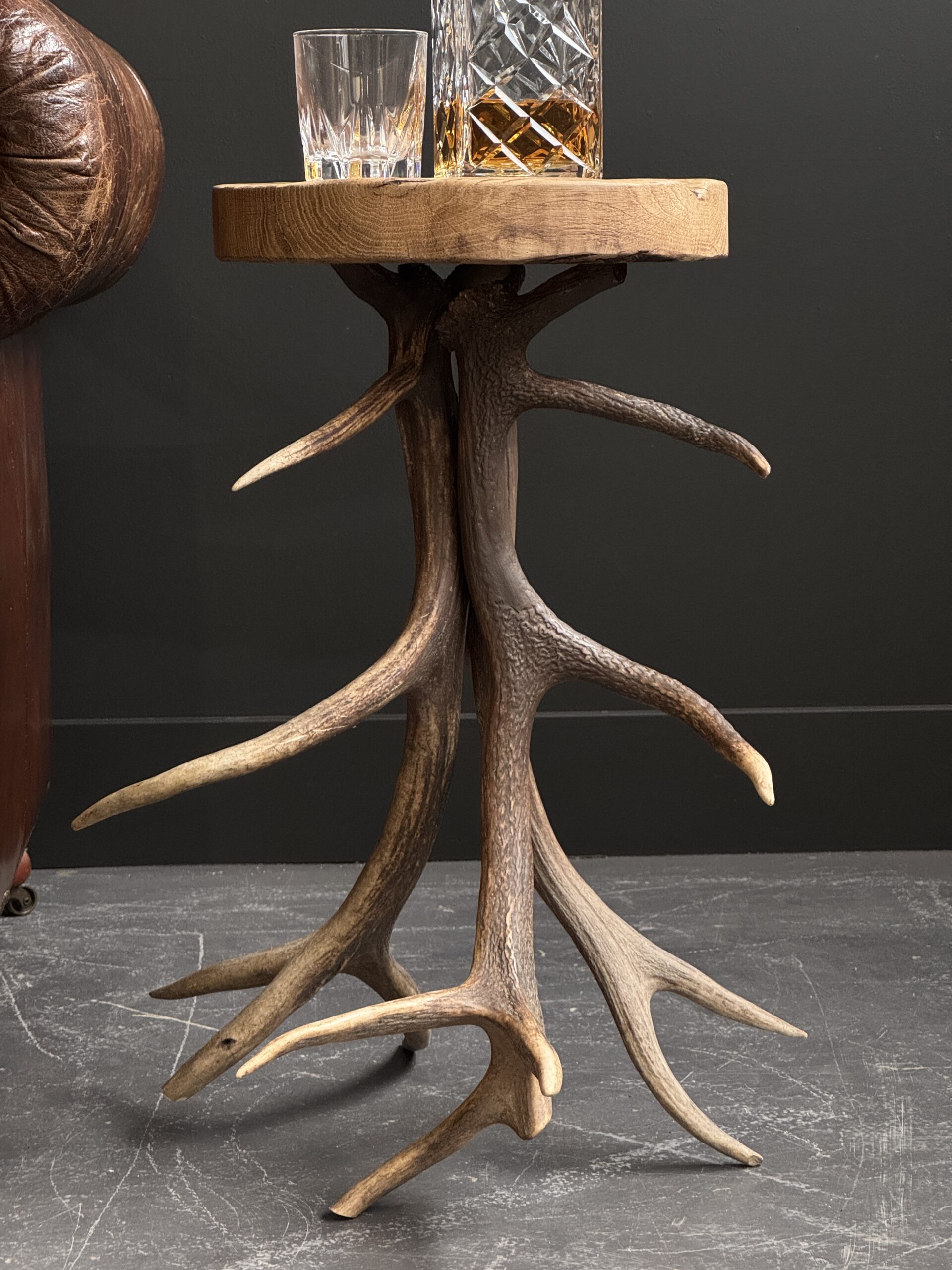 Small side table made of antlers. Combined with the top of special old oak, this gives the table a stylish look.