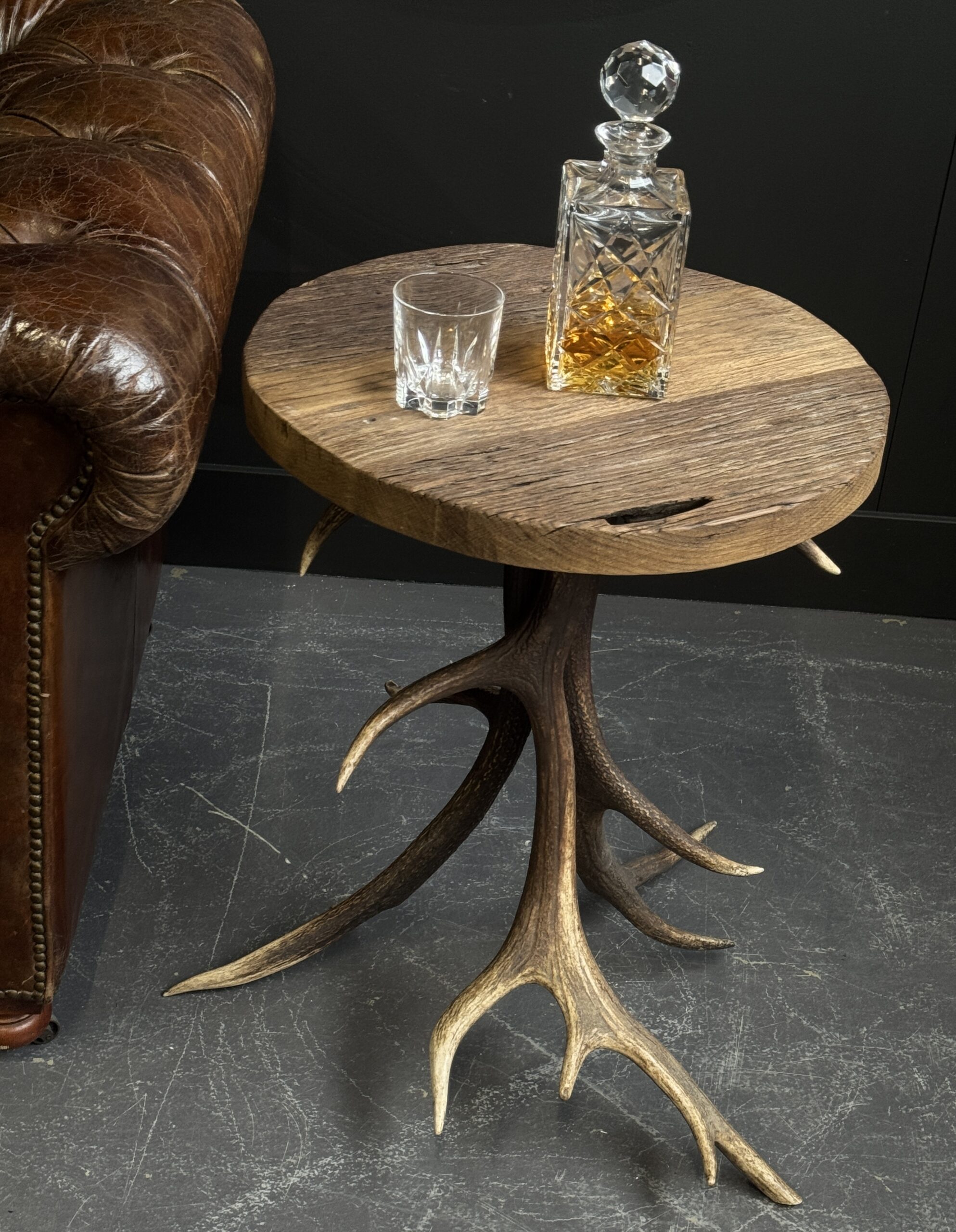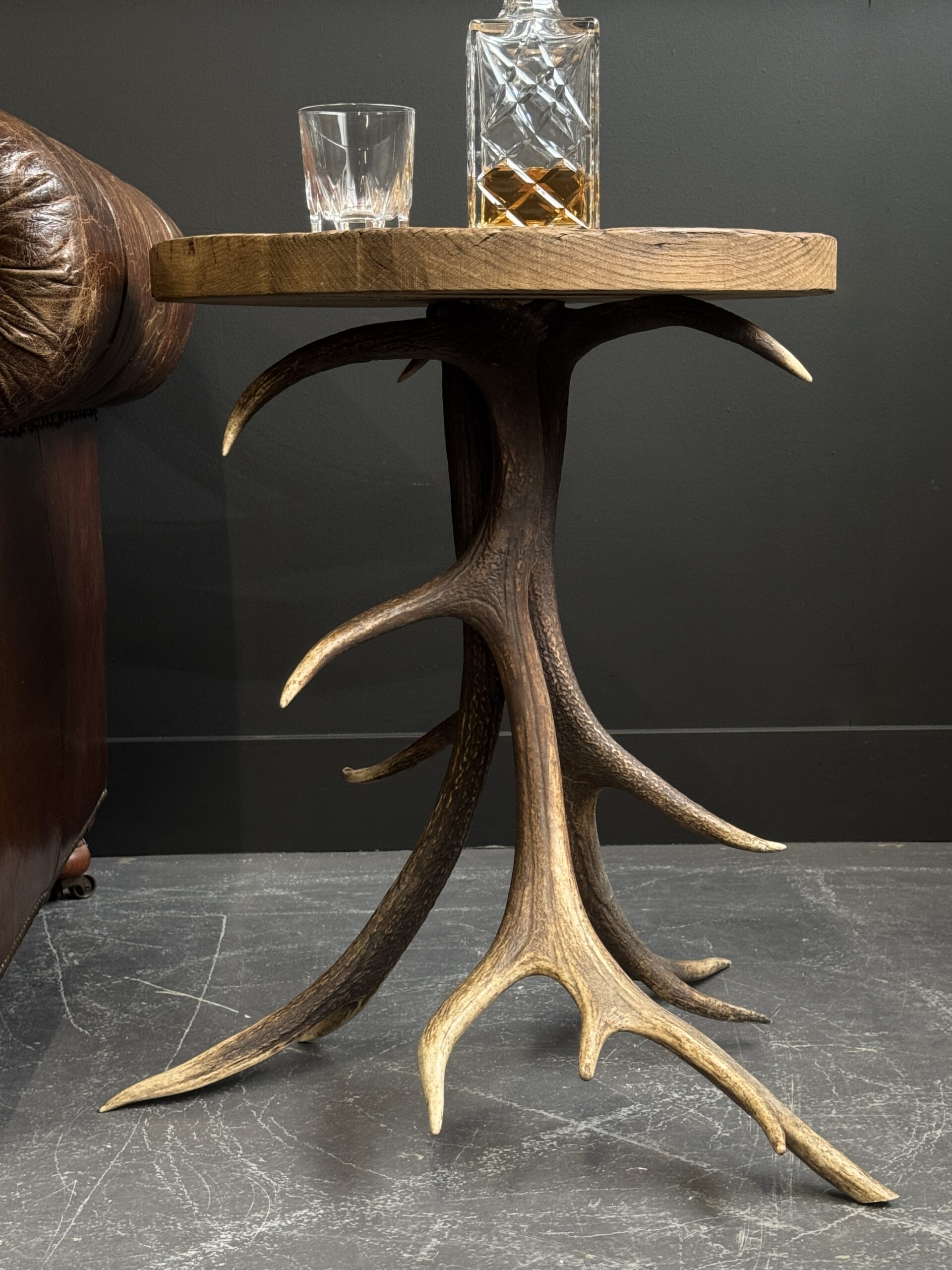 Small side table made of antlers. Combined with the top of special old oak, this gives the table a stylish look.