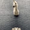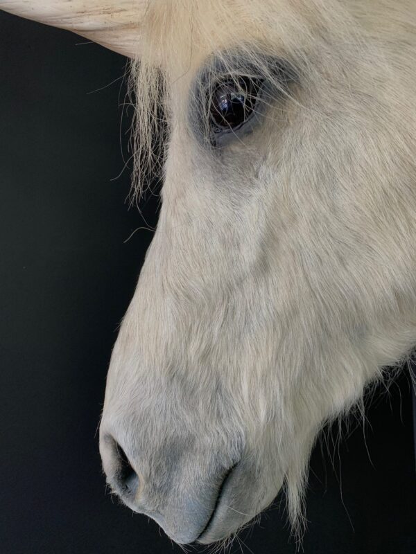 Mounted head of a unicorn. The unicorn demands a small white horse with nice long manes. On the front a replica of a narwhal tooth is mounted.