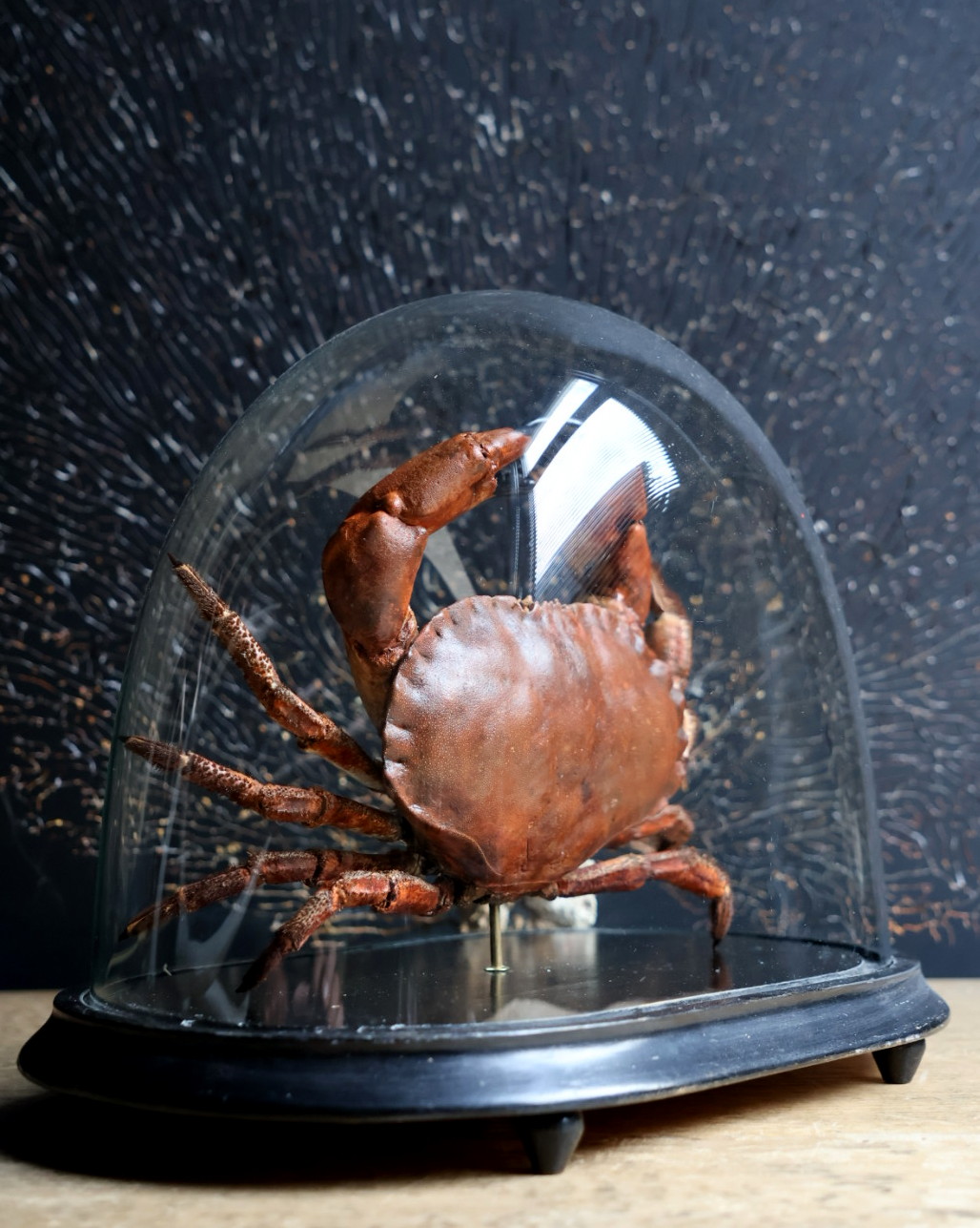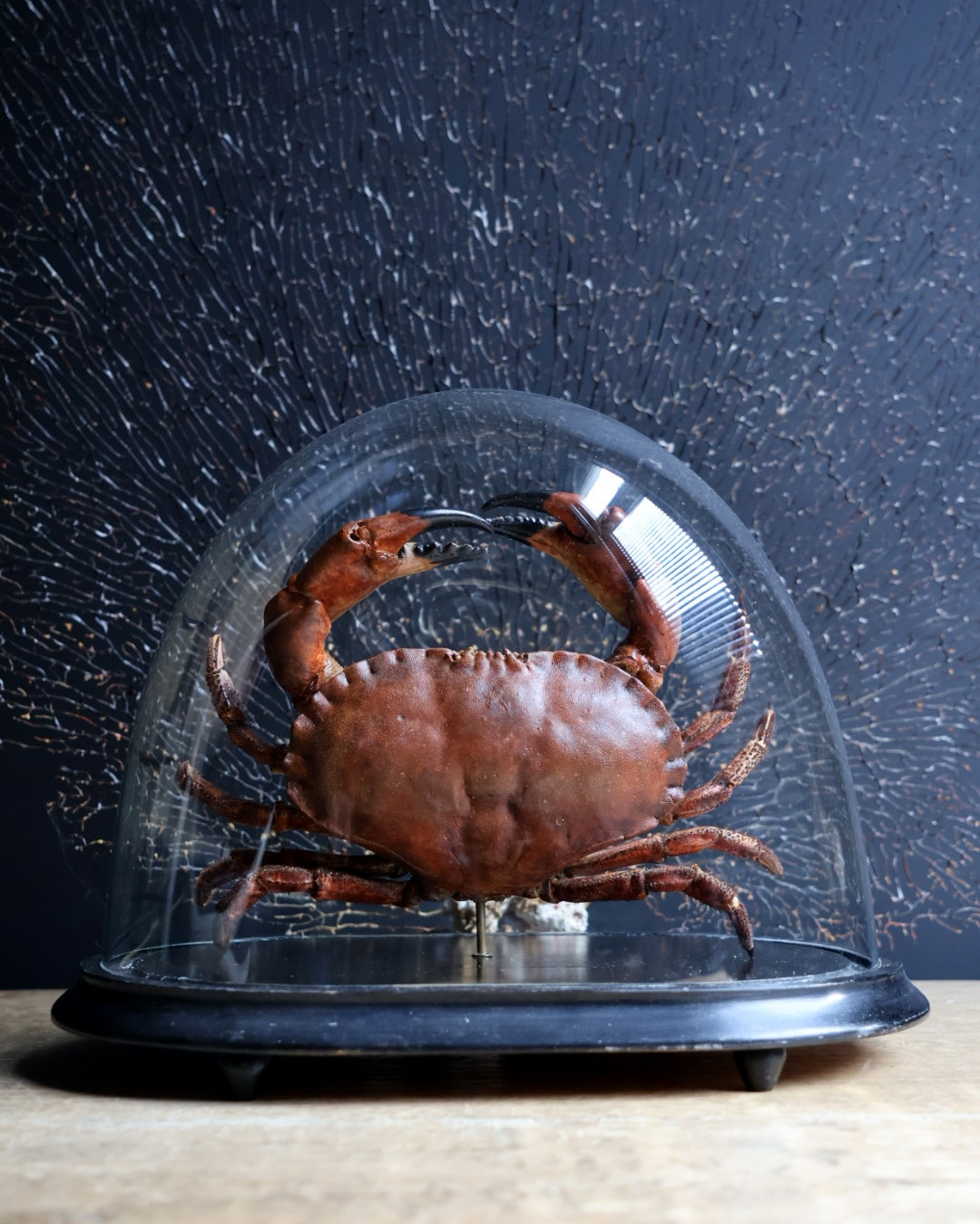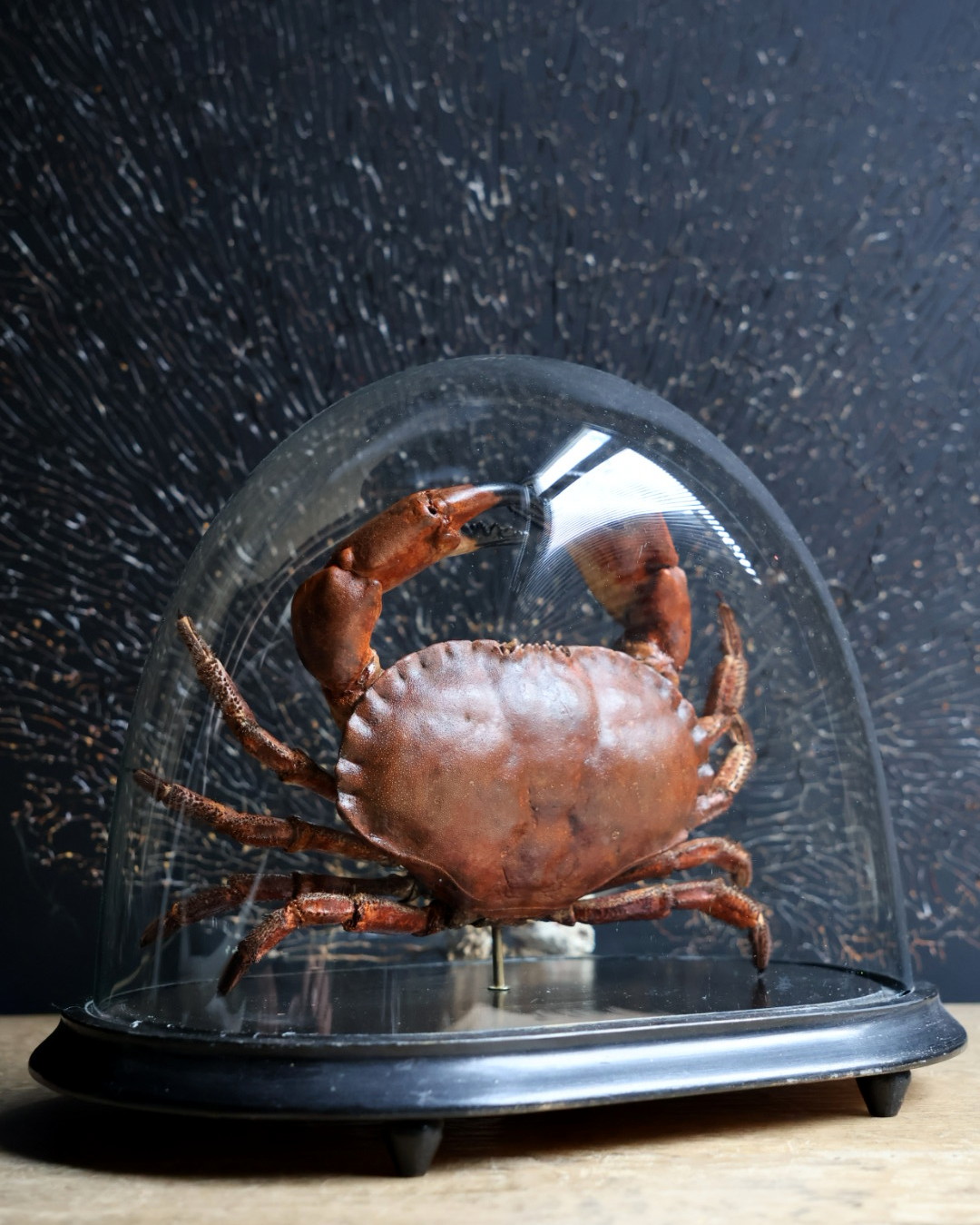 Antique dome with largtaxidermy North Sea crab. This crab is very expertly prepared which is a very time-consuming job. The crab is placed under an antique bell jar which makes it a beautiful eye catcher. This carefully prepared North Sea crab is unique object. The crab has been completely cleaned by hand and then coloured to restore its natural tones and textures. The result is a vivid and authentic image of the animal, as if it was taken straight from the sea. Under an antique glass bell jar, the crab is given a museum-like appearance, where craft, nature and history come together in an elegant and timeless decorative piece.