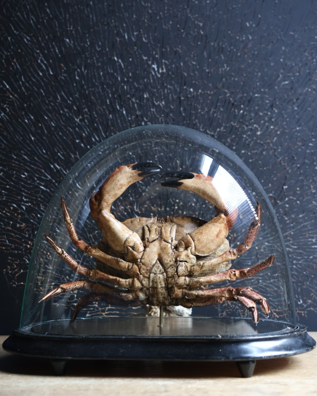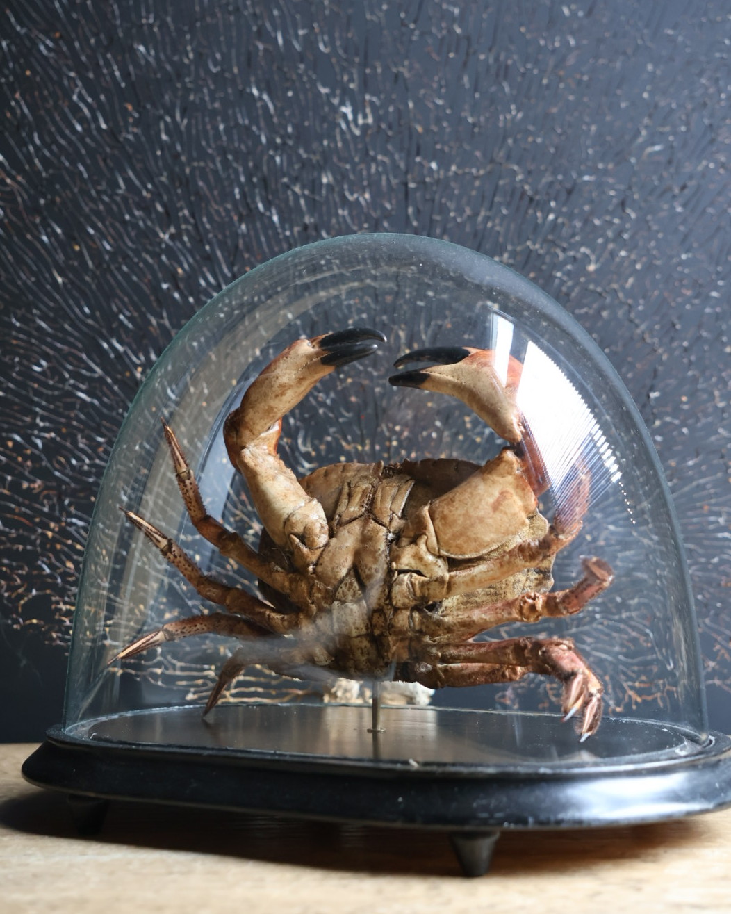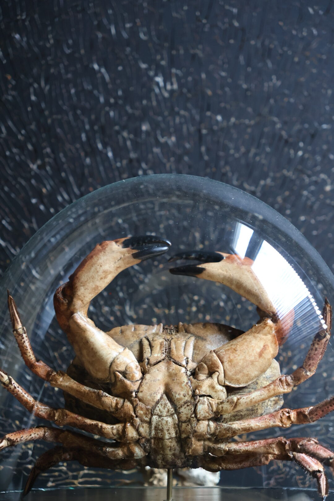 Antique dome with largtaxidermy North Sea crab. This crab is very expertly prepared which is a very time-consuming job. The crab is placed under an antique bell jar which makes it a beautiful eye catcher. This carefully prepared North Sea crab is unique object. The crab has been completely cleaned by hand and then coloured to restore its natural tones and textures. The result is a vivid and authentic image of the animal, as if it was taken straight from the sea. Under an antique glass bell jar, the crab is given a museum-like appearance, where craft, nature and history come together in an elegant and timeless decorative piece.