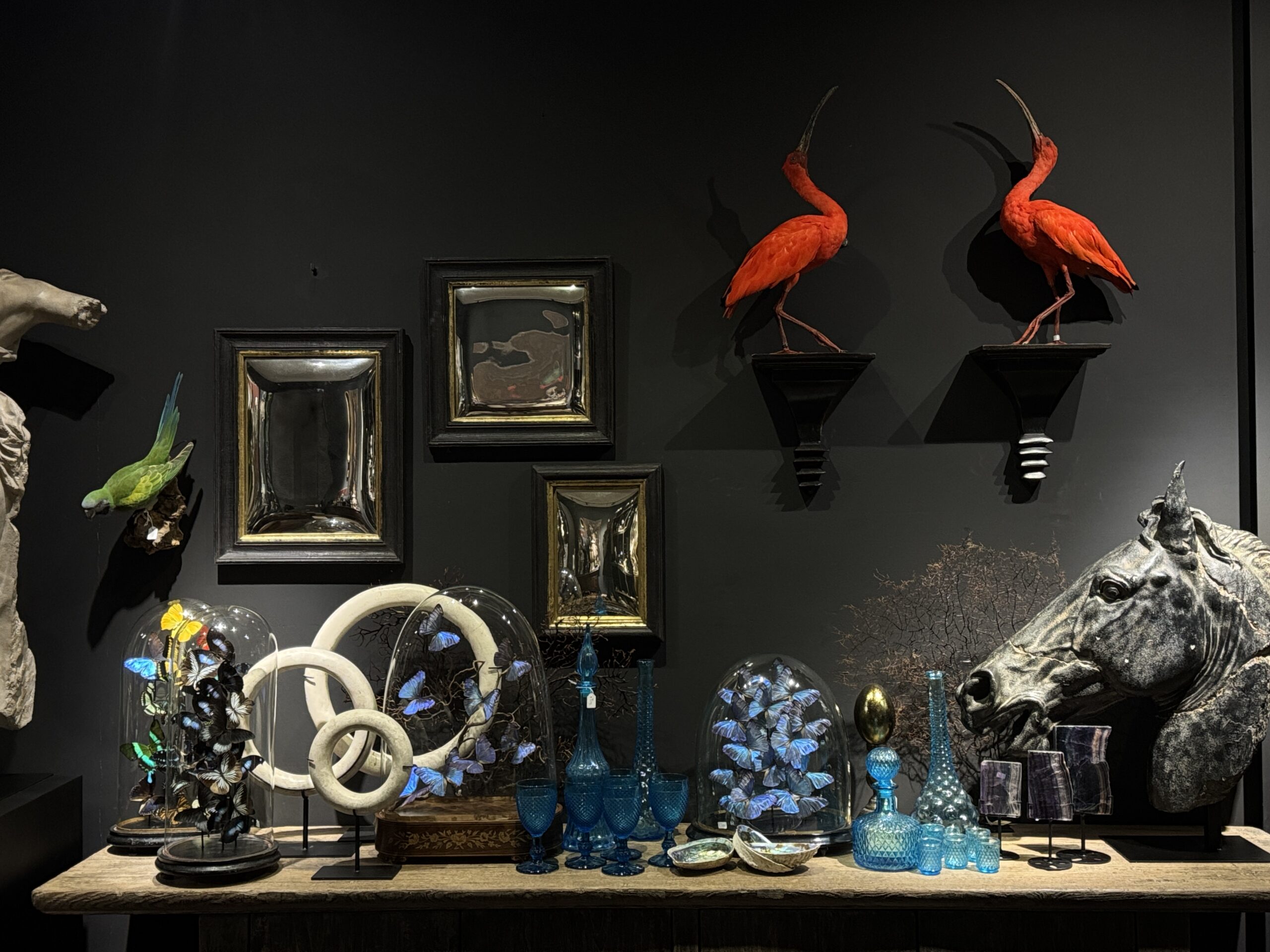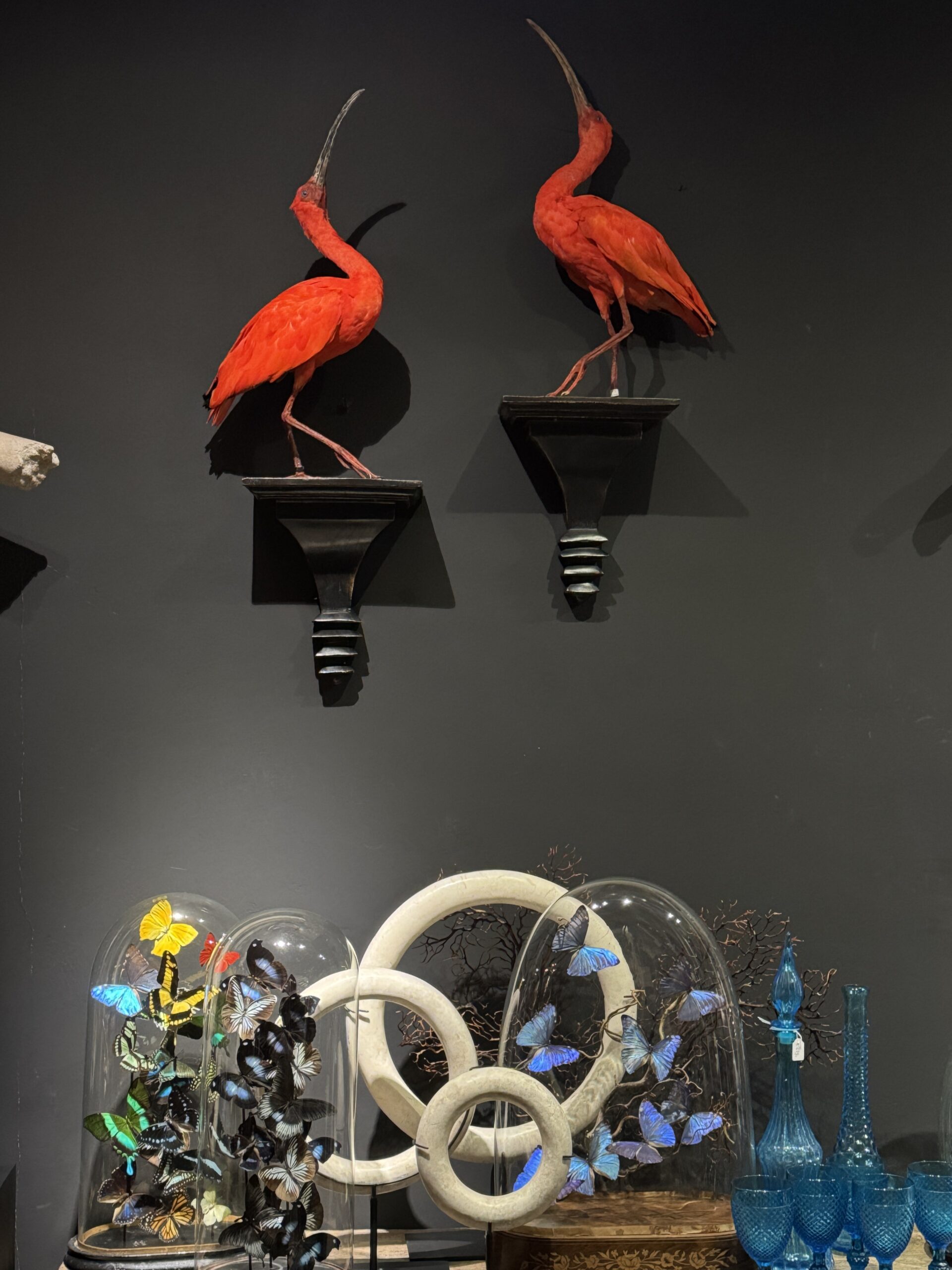 Mounted red ibis in stately pose. The ibis is beautifully colored and this particular bird is very faithfully mounted. It is also mounted on an ornate classic wooden consolle. Features of the Red Ibis: Vibrant red plumage that stands out in any setting. Elegant long beaks and slender neck. Are widely kept as aviary birds. The younger specimens do not yet have the beautiful red plumage Our Red Ibises are set up with the utmost care and dedication. The postures and anatomy make them true works of art. Contact us today if you are interested in the stuffed ibis. We are happy to answer all your questions and can provide you with any information.