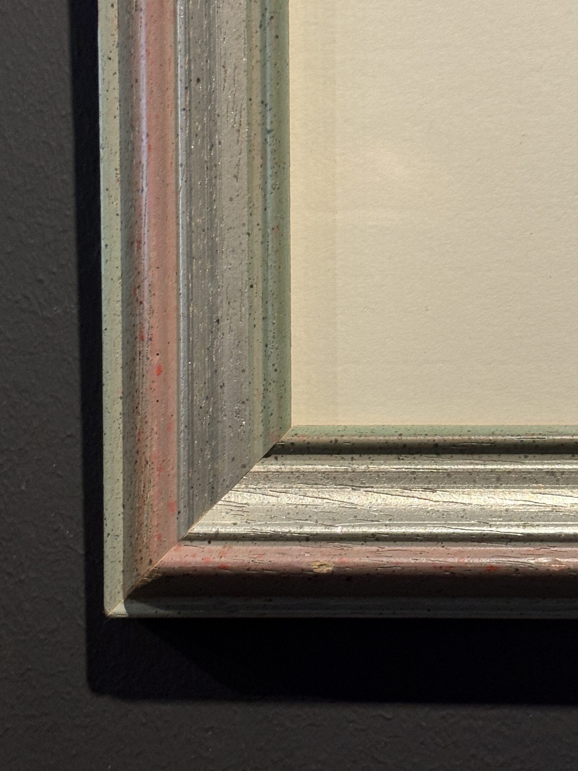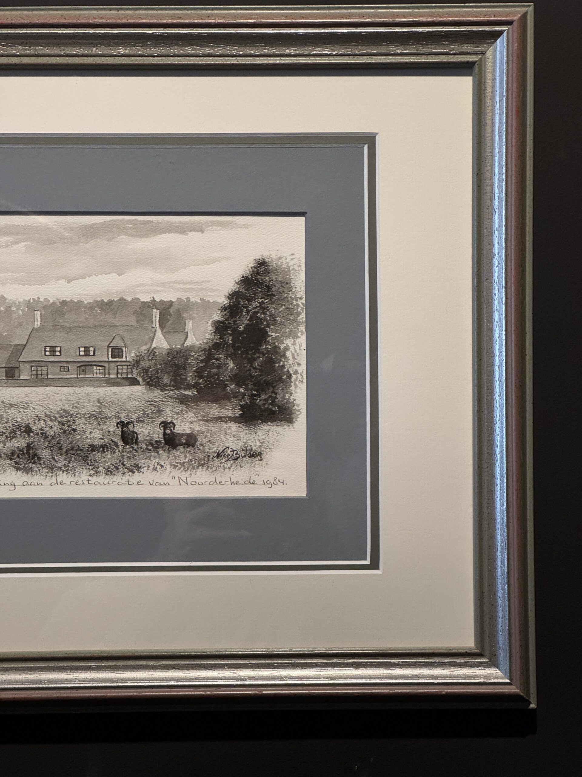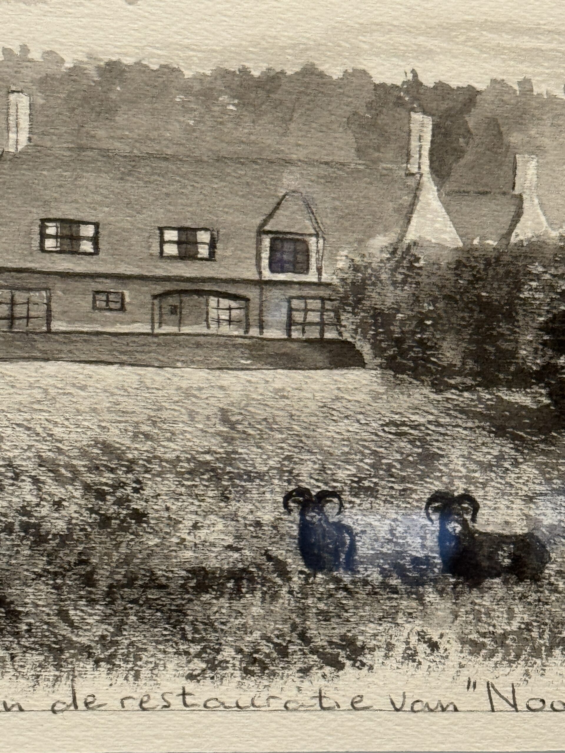 Beautifully framed drawing by Nico Bulder. The scene shows a building with two mouflons in the foreground.