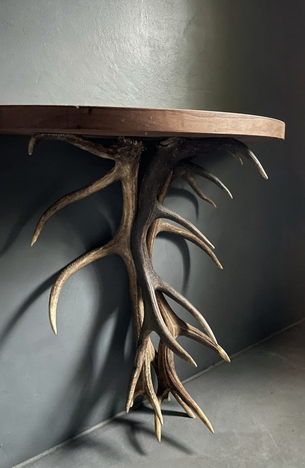 Handmade antler wall table. The table is made from the antlers of red deer combined with a top of oak.