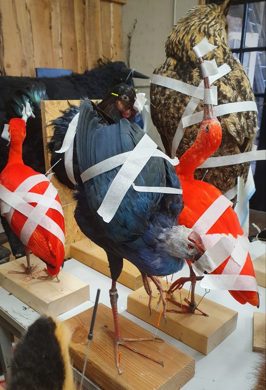 Currently, several beautiful animals are being worked on with great dedication. The taxidermy process is very labour-intensive and very much time is spent on the finest details and anatomy to make all animals life-like. Each animal is carefully studied and handled so that we can best capture the natural beauty and complexity of the animals. When preparing, it is essential to accurately understand the anatomical structures. This includes everything from bone structure to muscle groups and skin texture. We use advanced materials to ensure the integrity of each animal. The goal is to set up an animal in the most natural posture and detail to, for example, eyes nose and mouth. By focusing on these finer details, we hope to create a visual masterpiece that makes people aware of nature's splendour and fragility, and we strive to execute each project with the utmost dedication and precision. This is reflected in the beautiful final results.... The animals being worked on, which will soon be on display on our website, are: Scandinavian bear, Black bear, European eagle owl, various sheep breeds, black-masked ibis, black half roosters, Onagadorie roosters, noble parrots in frame, raccoon, sitting and lying, swan, swan chick, black-banded bearded bird, red ibis, pink cockatoos, Purple moorhen, crowned crane, Arrasari, white peacock hen.