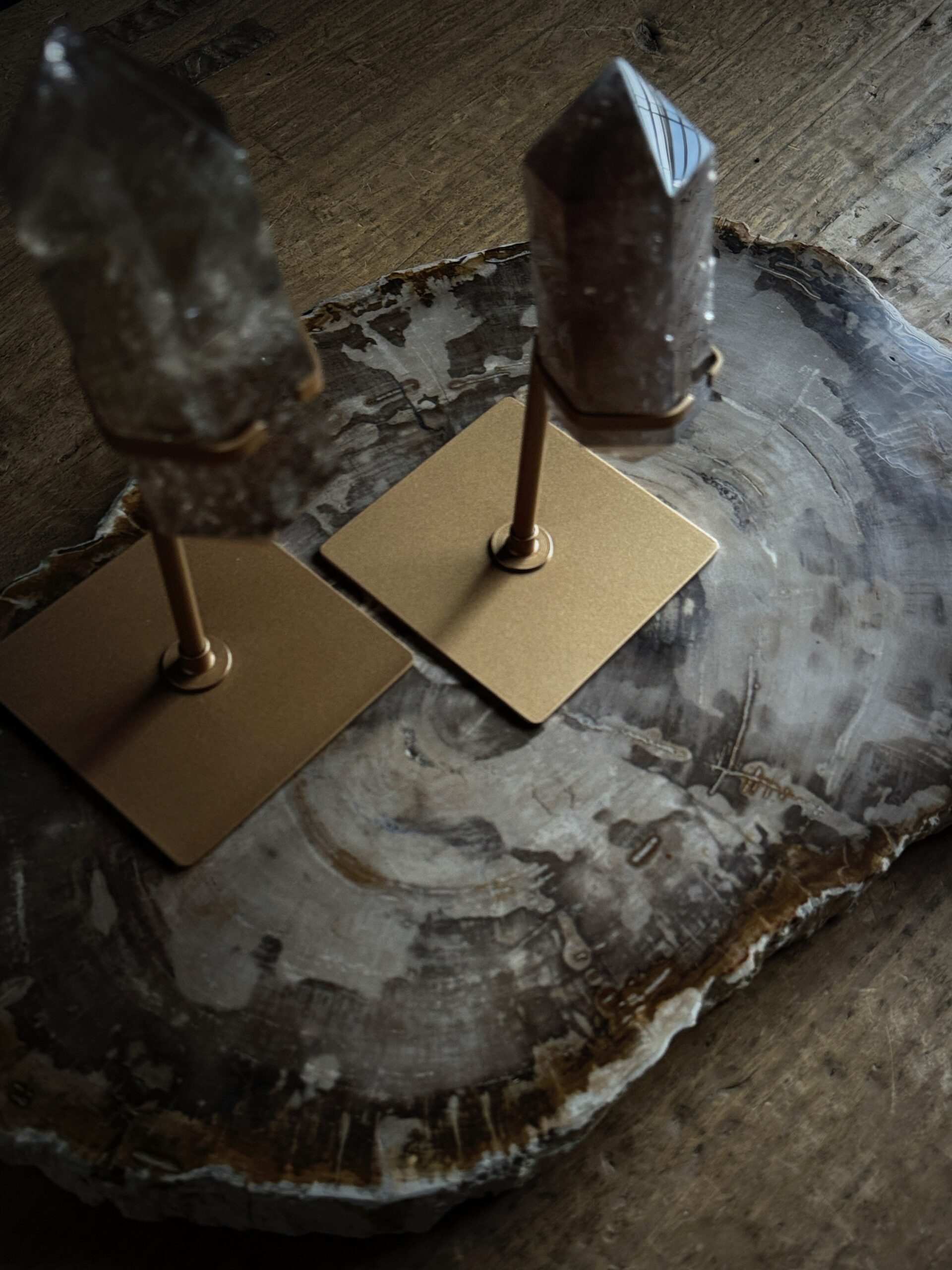 3 rookkwartsstenen op een voetstuk