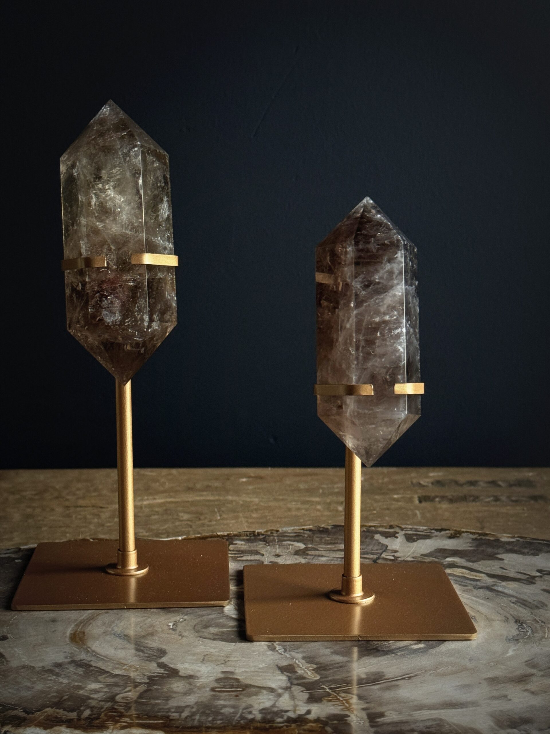 Set van 3 rookkwartsstenen op een voetstuk