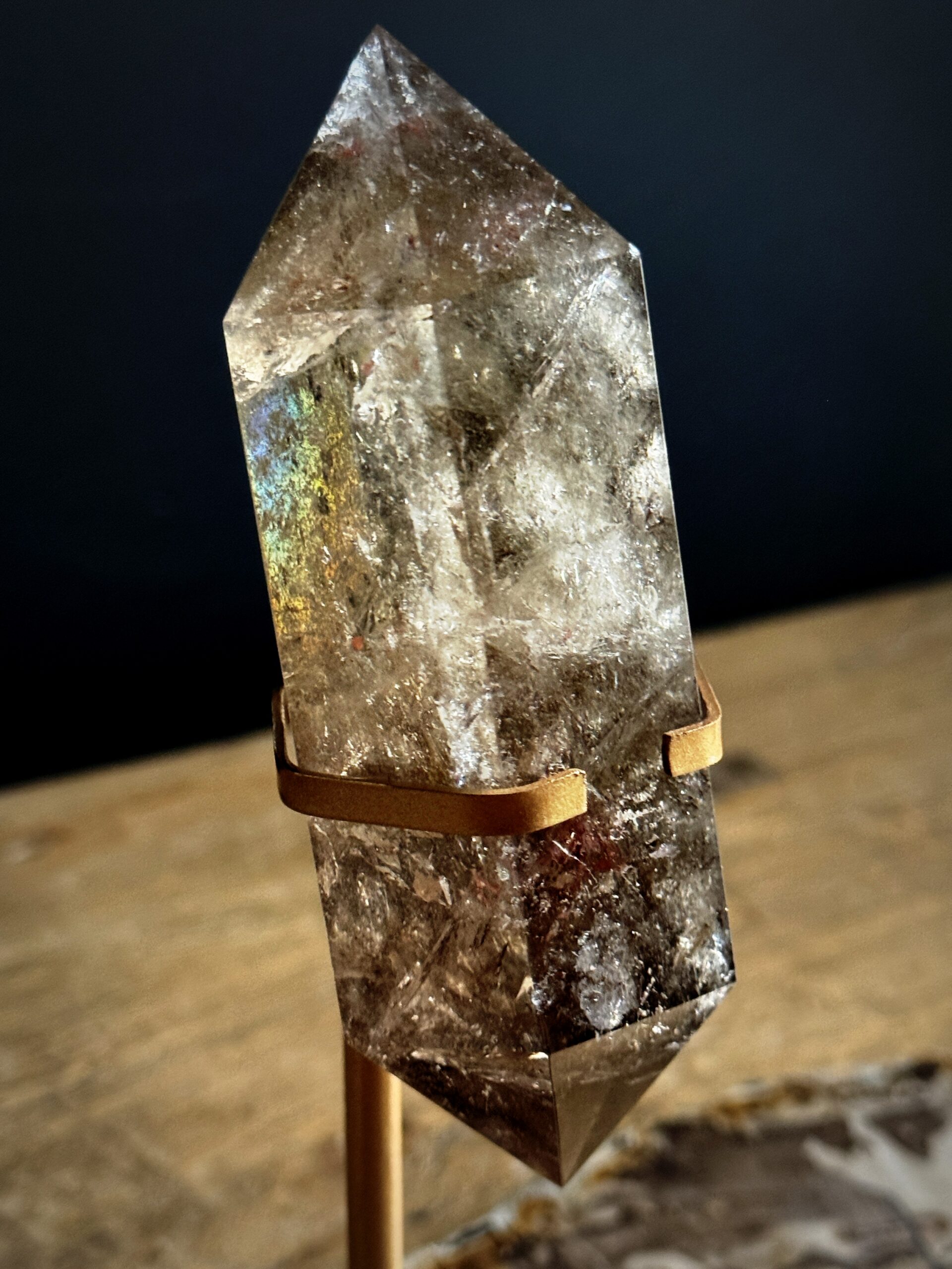 Deze kwartsvariant, met zijn diepe bruine en rookgrijze tinten, dankt zijn kleur aan de subtiele werking van natuurlijke straling op delicate sporen van aluminium, wat resulteert in een kristal dat zowel ingetogen als mysterieus is. Rookkwarts is een steen die bescherming en aarding biedt, negatieve energieën absorbeert, onrustige emoties kalmeert en veerkracht bevordert, waardoor blijvende sereniteit wordt uitgenodigd. In het Keltische Schotland werd het lange tijd beschouwd als de nationale edelsteen, die zorgvuldig werd gebruikt voor kiltknopen of dolkhandvatten, waarbij elegantie werd gecombineerd met symbolische kracht. Als minerale weerspiegeling van innerlijke kracht begeleidt het trouw degenen die rouwen of momenten van crisis doormaken, en biedt het een discrete maar krachtige toevluchtsoord.
