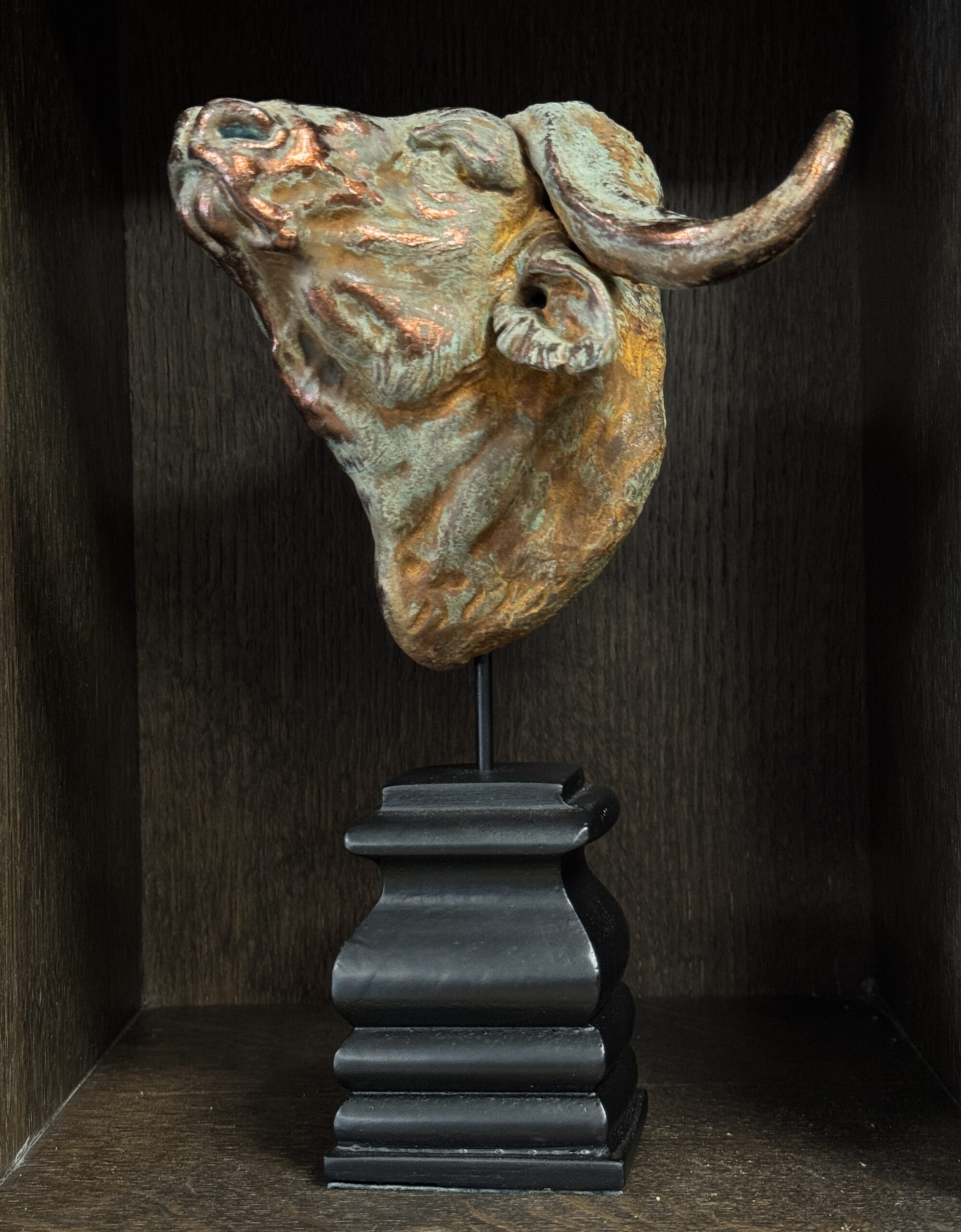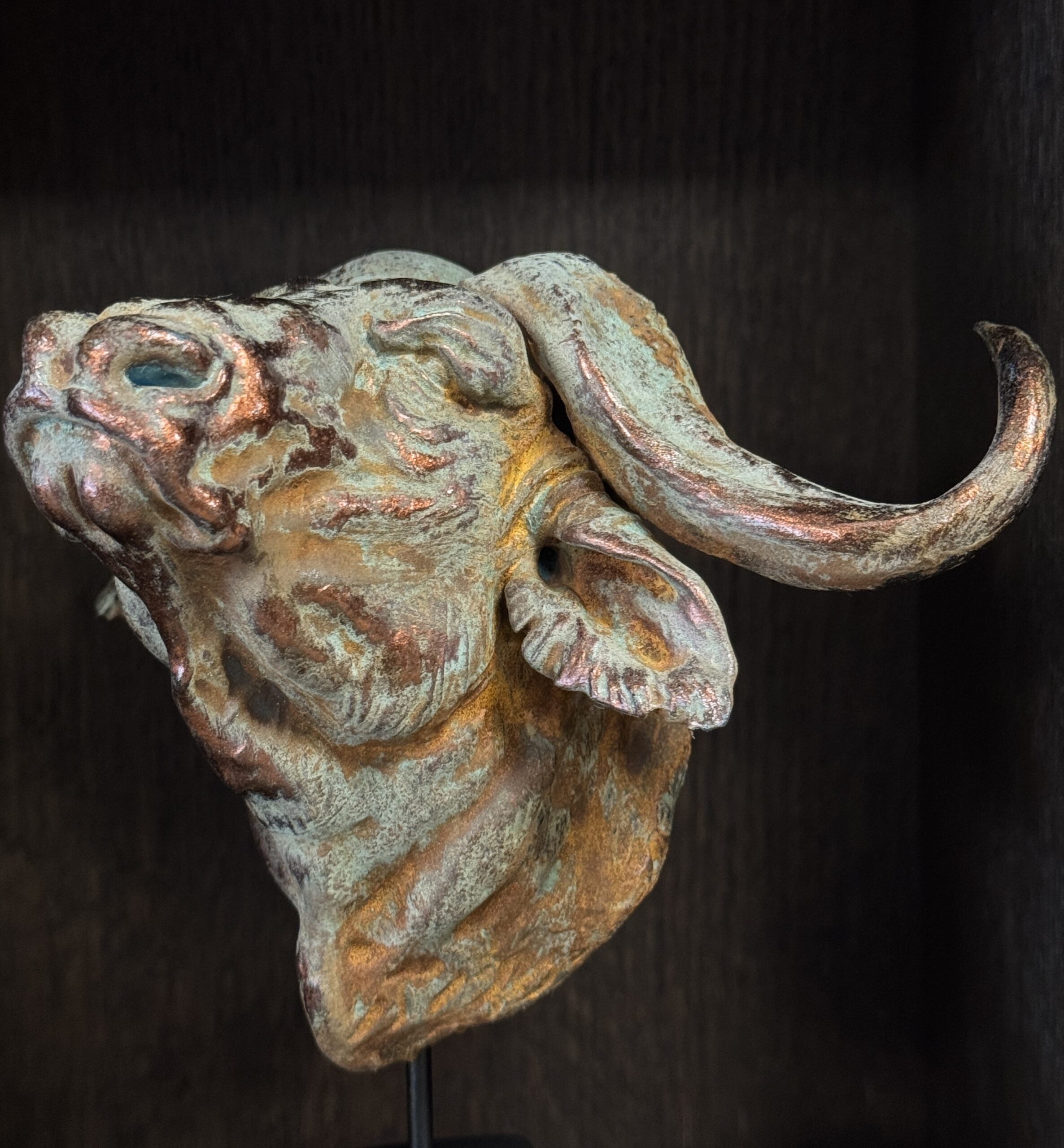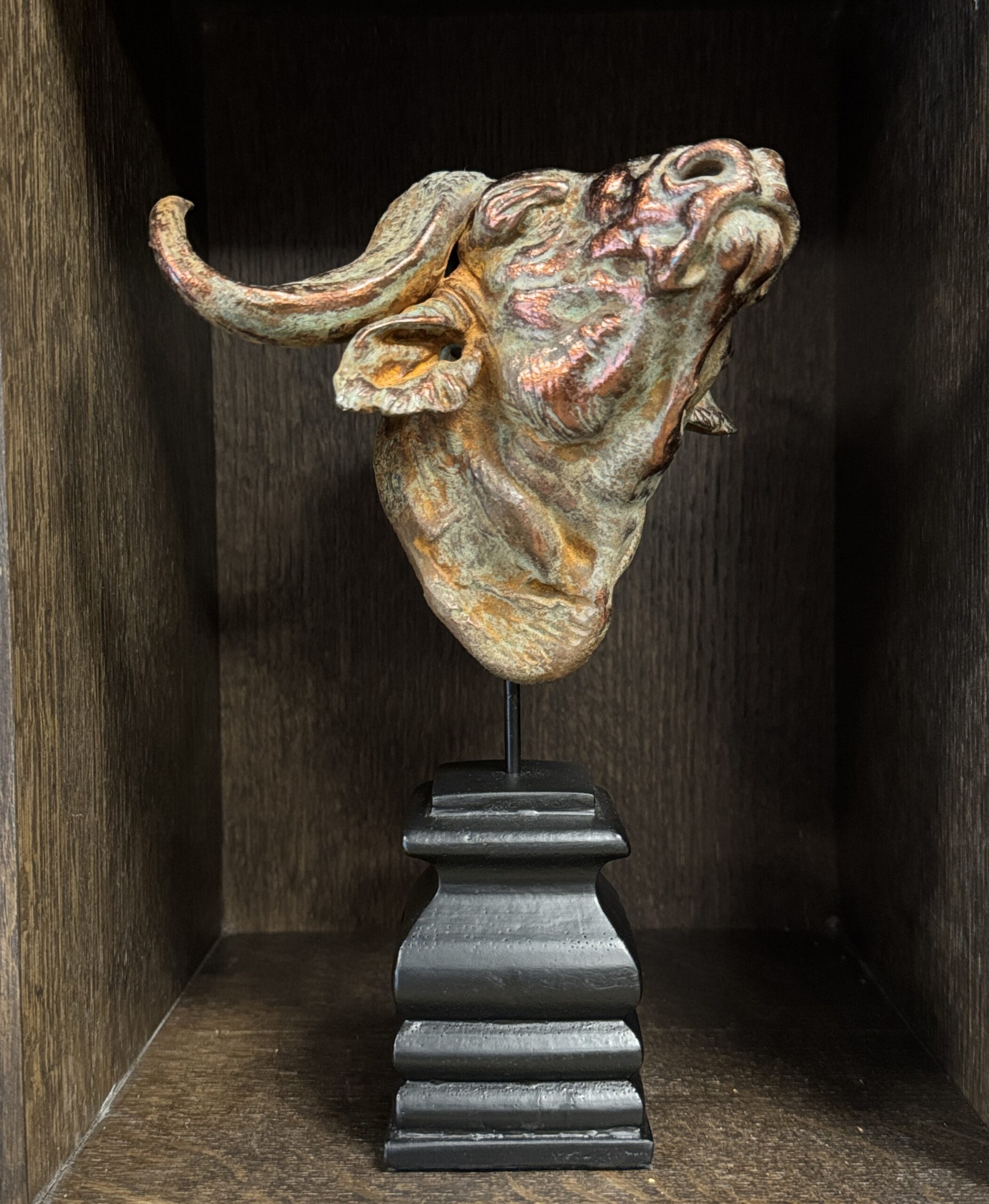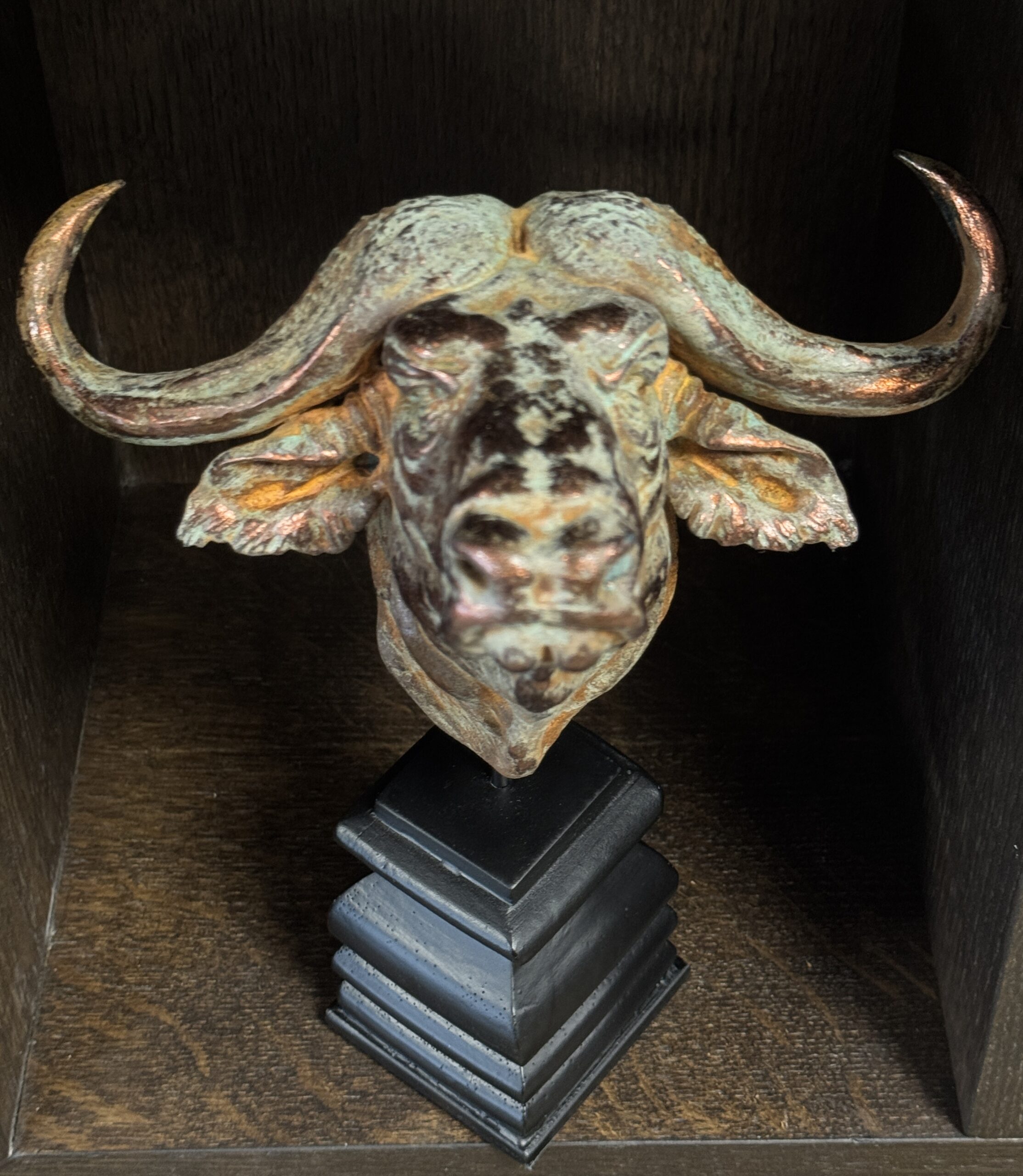 Dit bijzondere beeldje toont een krachtige kaapse buffel, uitgevoerd in kunststof maar afgewerkt met een authentieke bronzen laag. Door de natuurlijke oxidatie heeft het oppervlak een fraaie groene patina gekregen, wat het beeldje een doorleefde en bijna antieke uitstraling geeft. Het geheel is stevig gemonteerd op een sokkeltje, waardoor het zowel als decoratief object als verzamelstuk tot zijn recht komt.