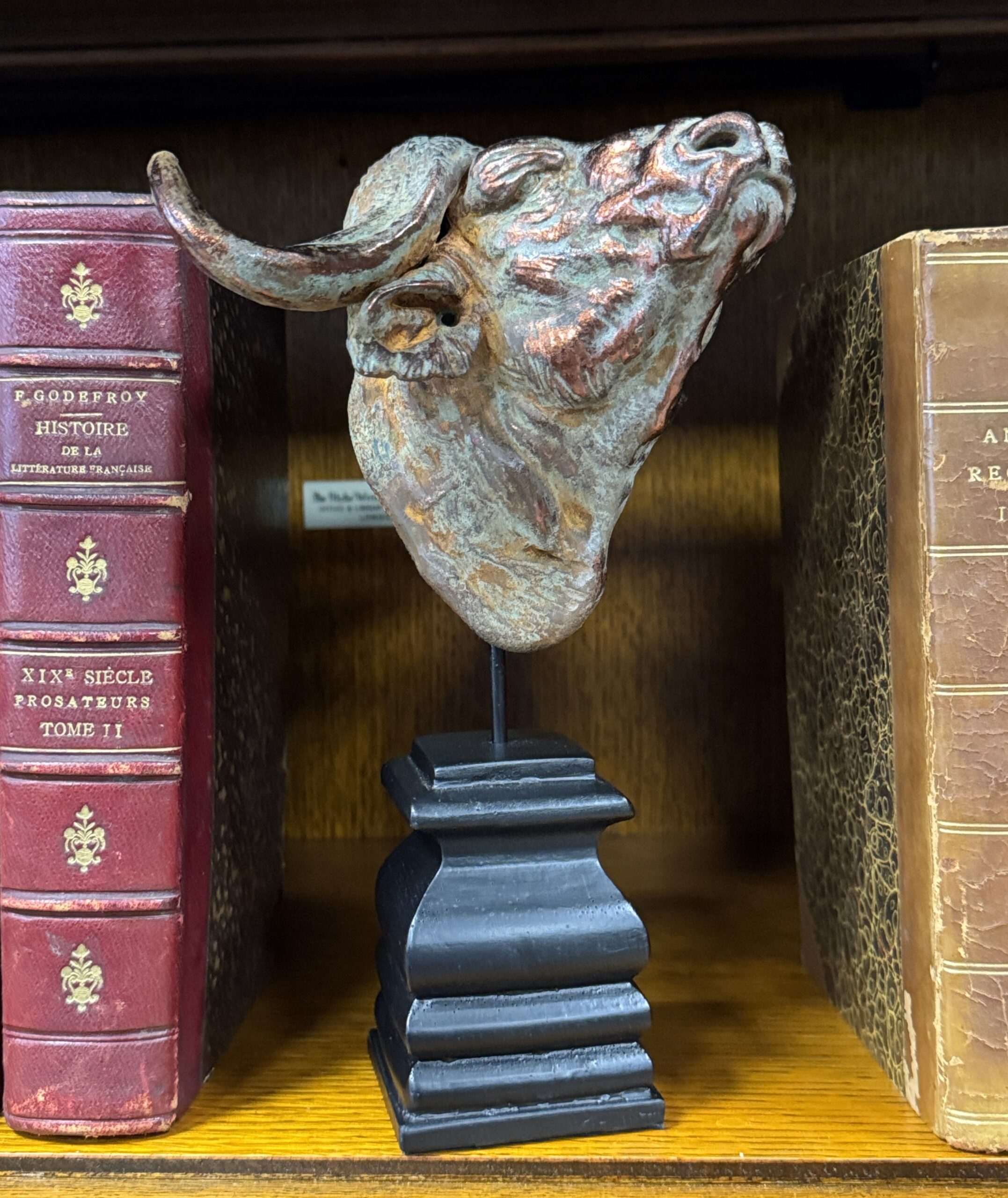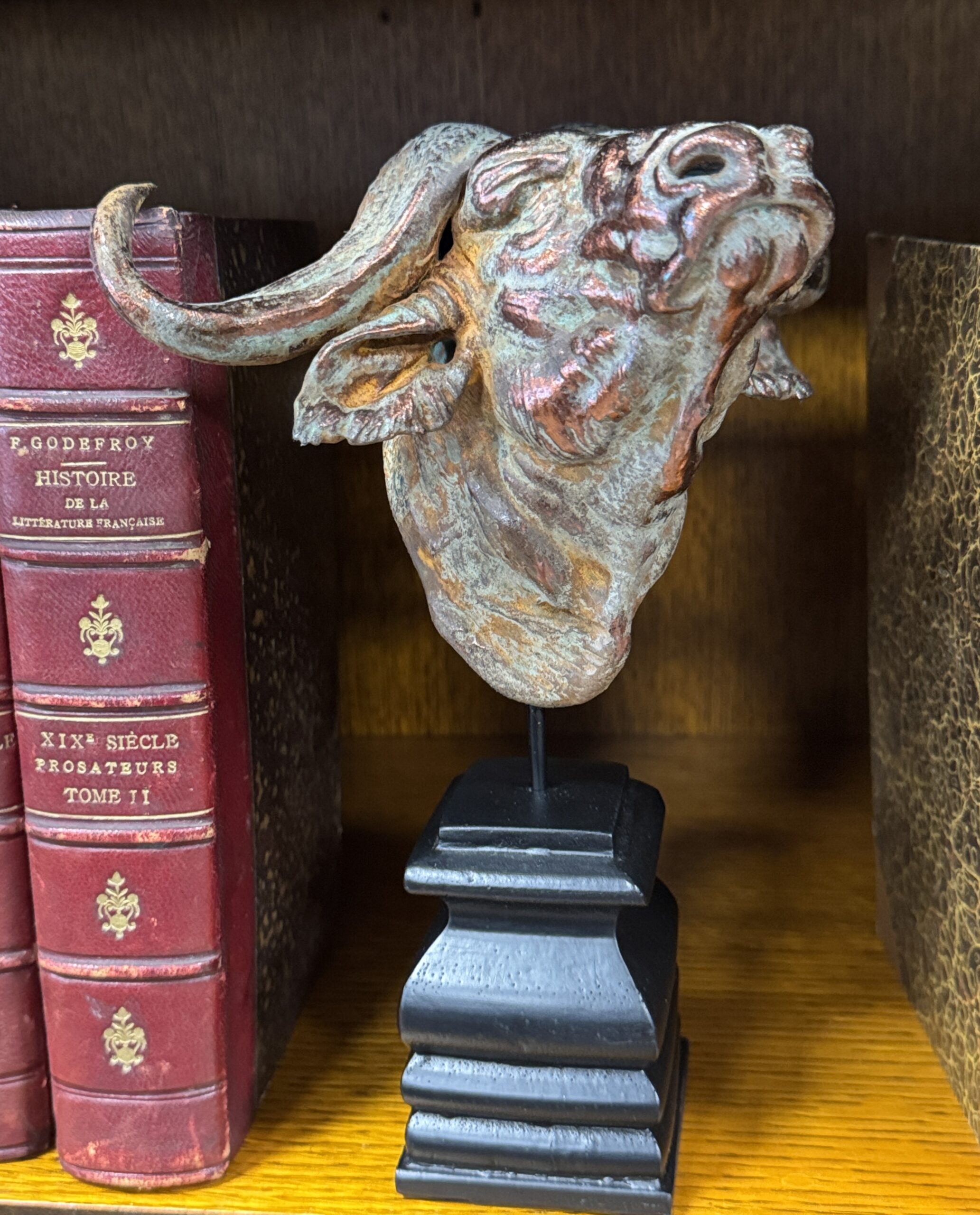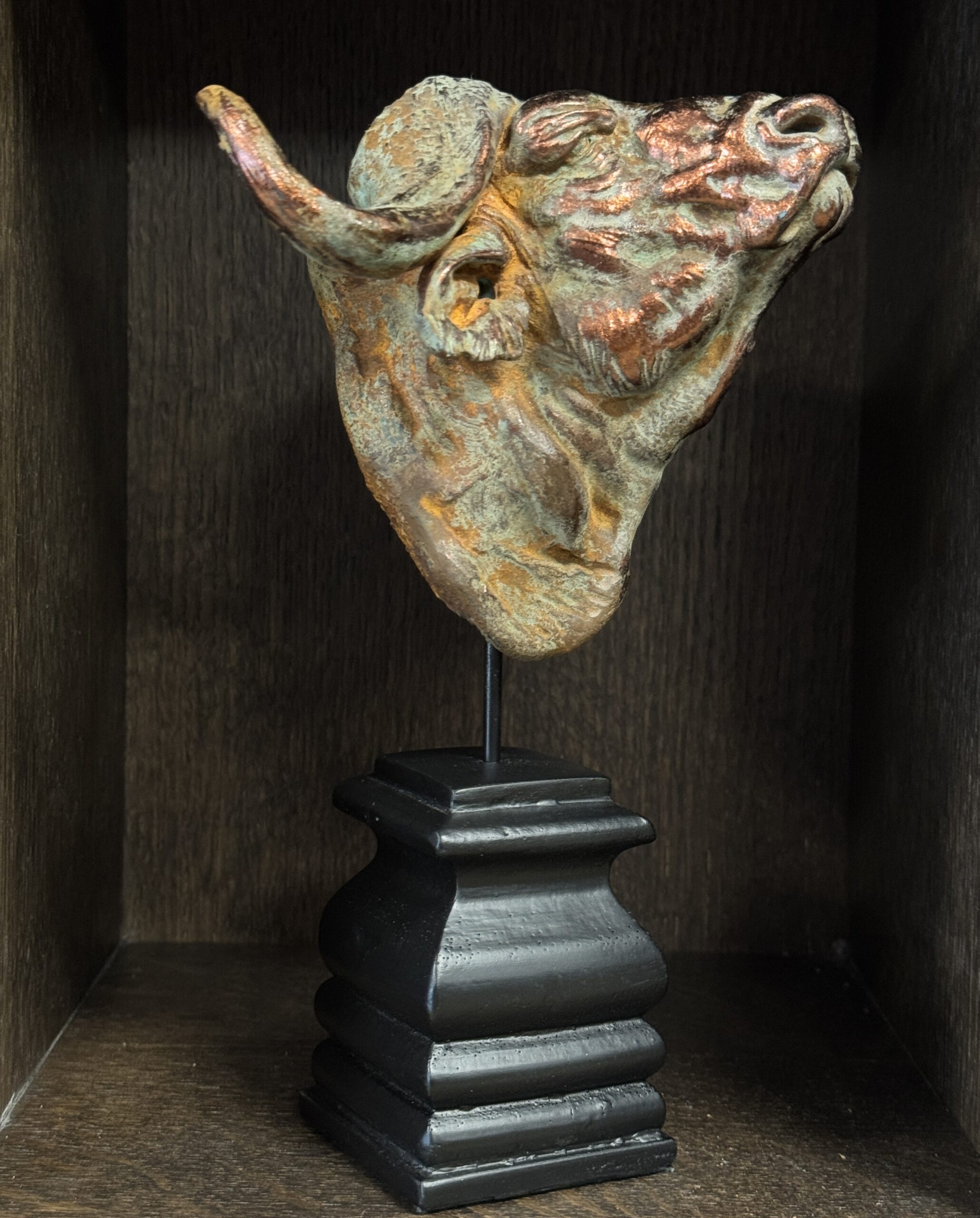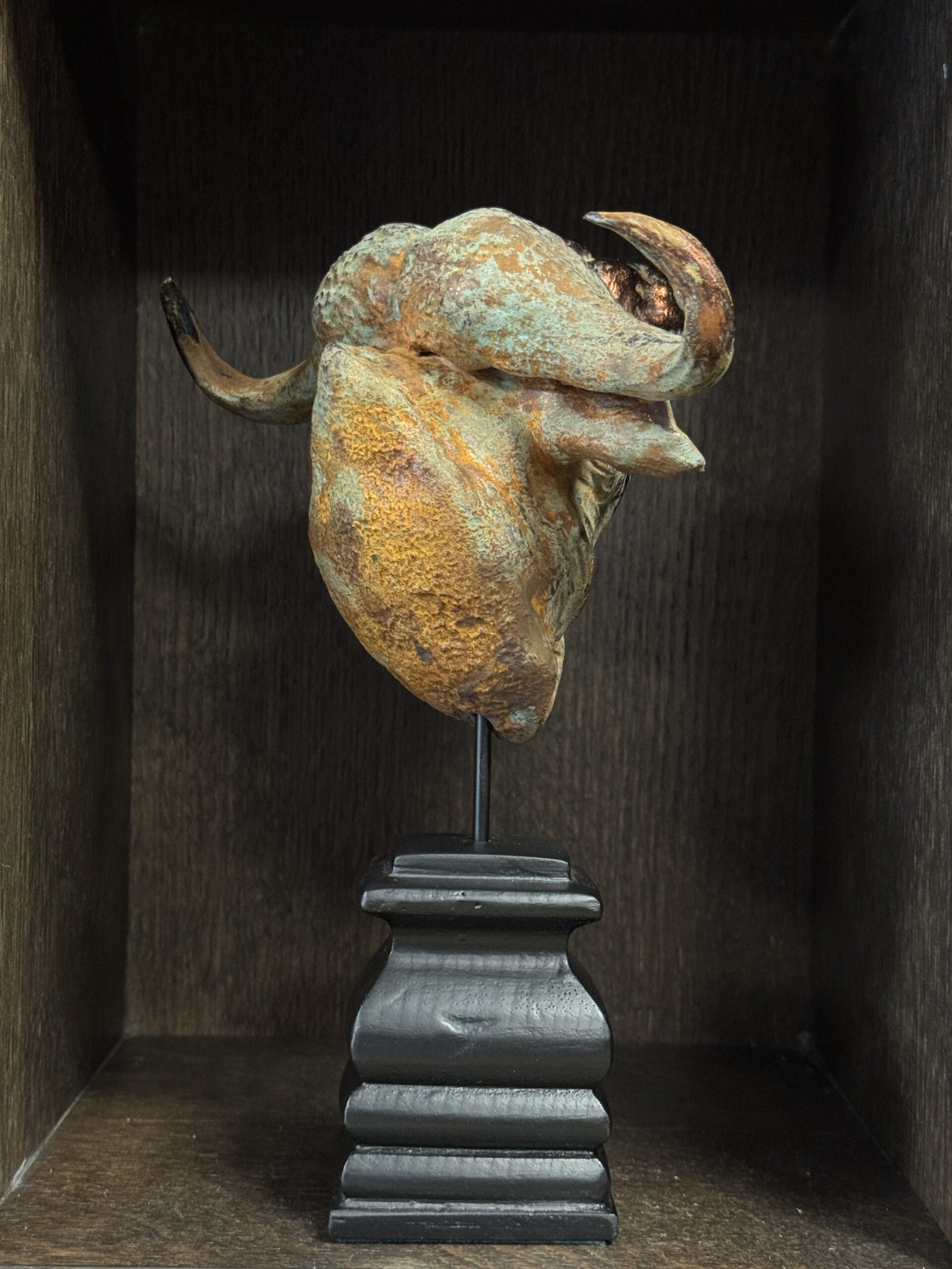Dit bijzondere beeldje toont een krachtige kaapse buffel, uitgevoerd in kunststof maar afgewerkt met een authentieke bronzen laag. Door de natuurlijke oxidatie heeft het oppervlak een fraaie groene patina gekregen, wat het beeldje een doorleefde en bijna antieke uitstraling geeft. Het geheel is stevig gemonteerd op een sokkeltje, waardoor het zowel als decoratief object als verzamelstuk tot zijn recht komt.
