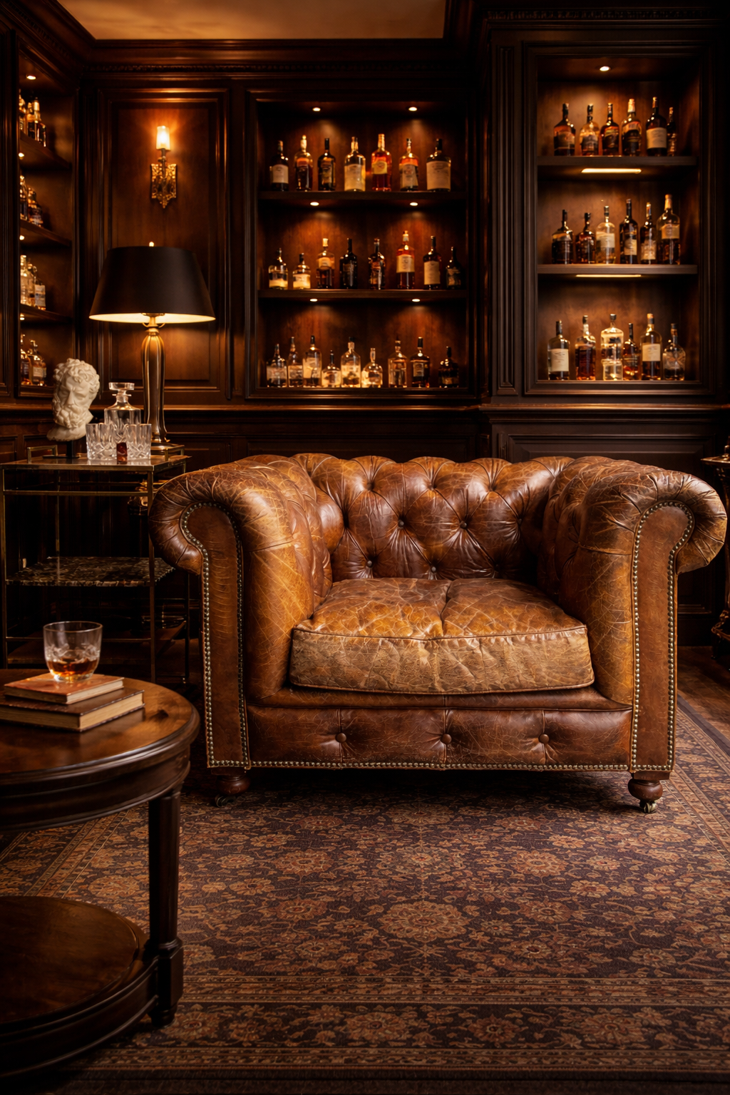 Deze set van twee vintage Chesterfield fauteuils met bijpassende poef onderscheidt zich door haar karaktervolle en hoogwaardige uitstraling.