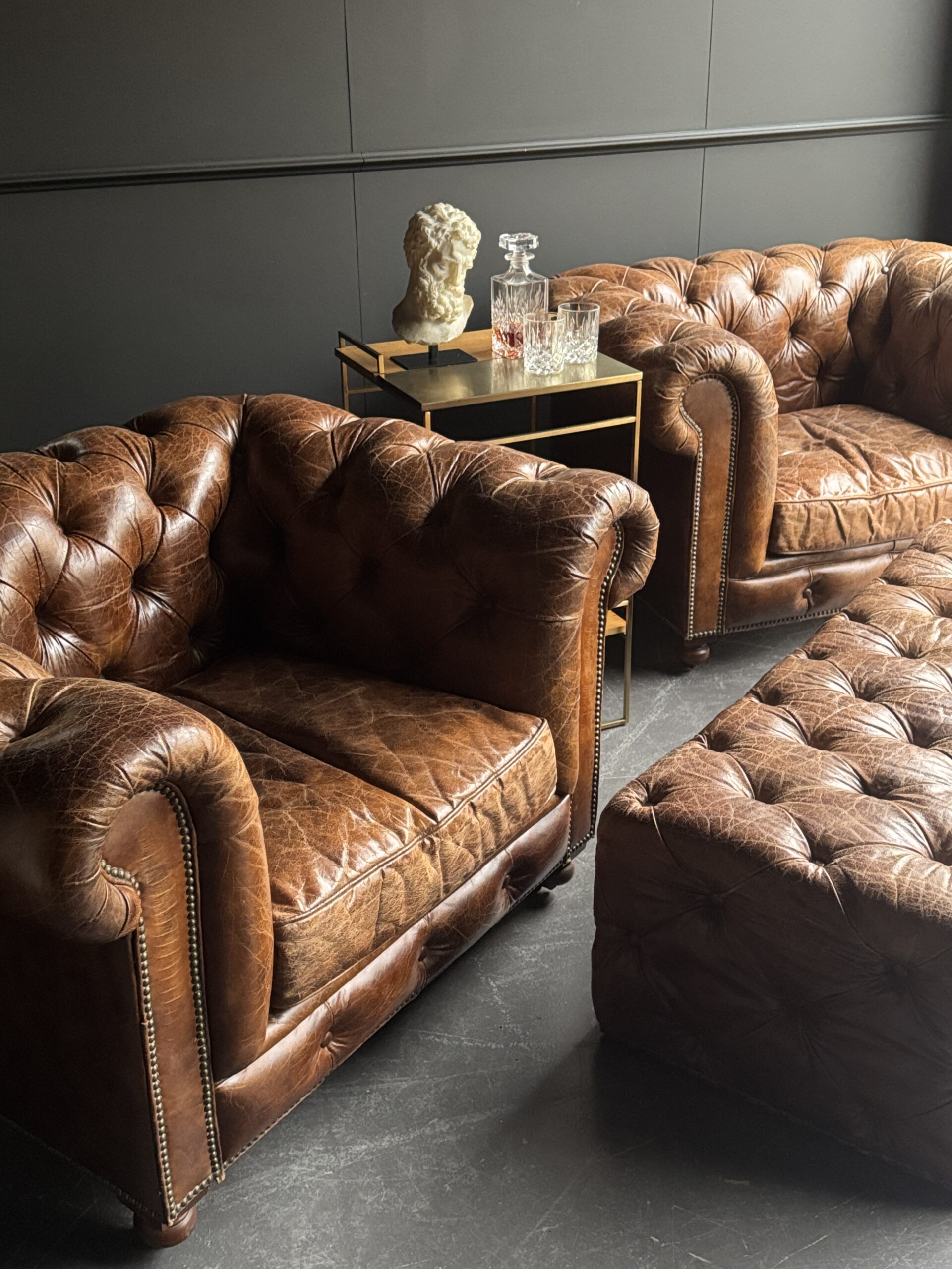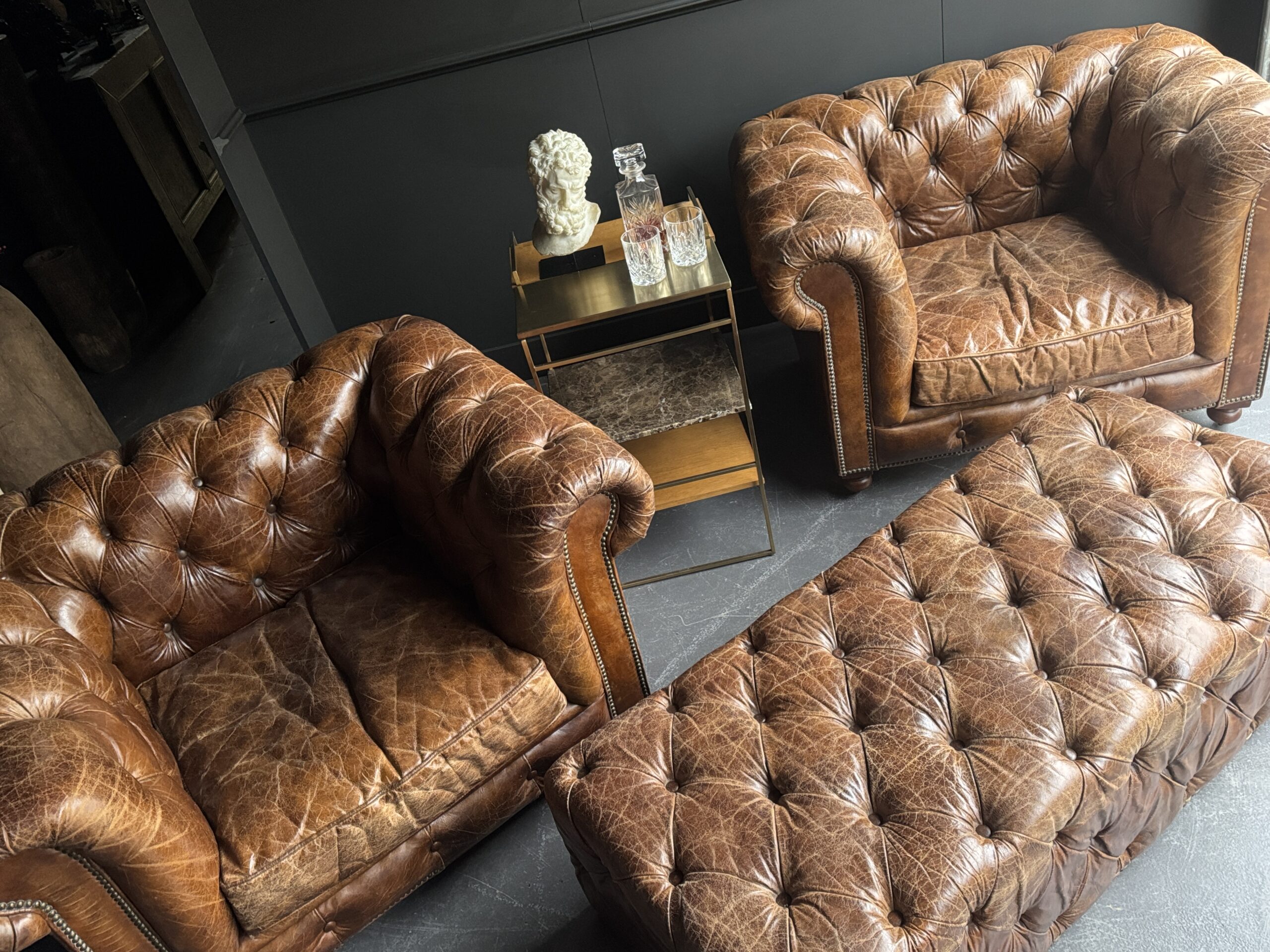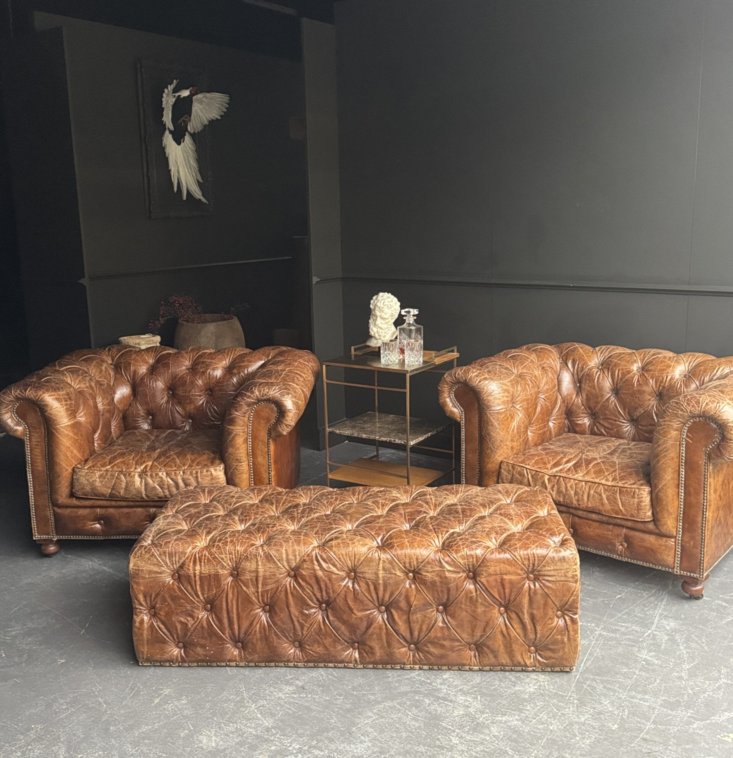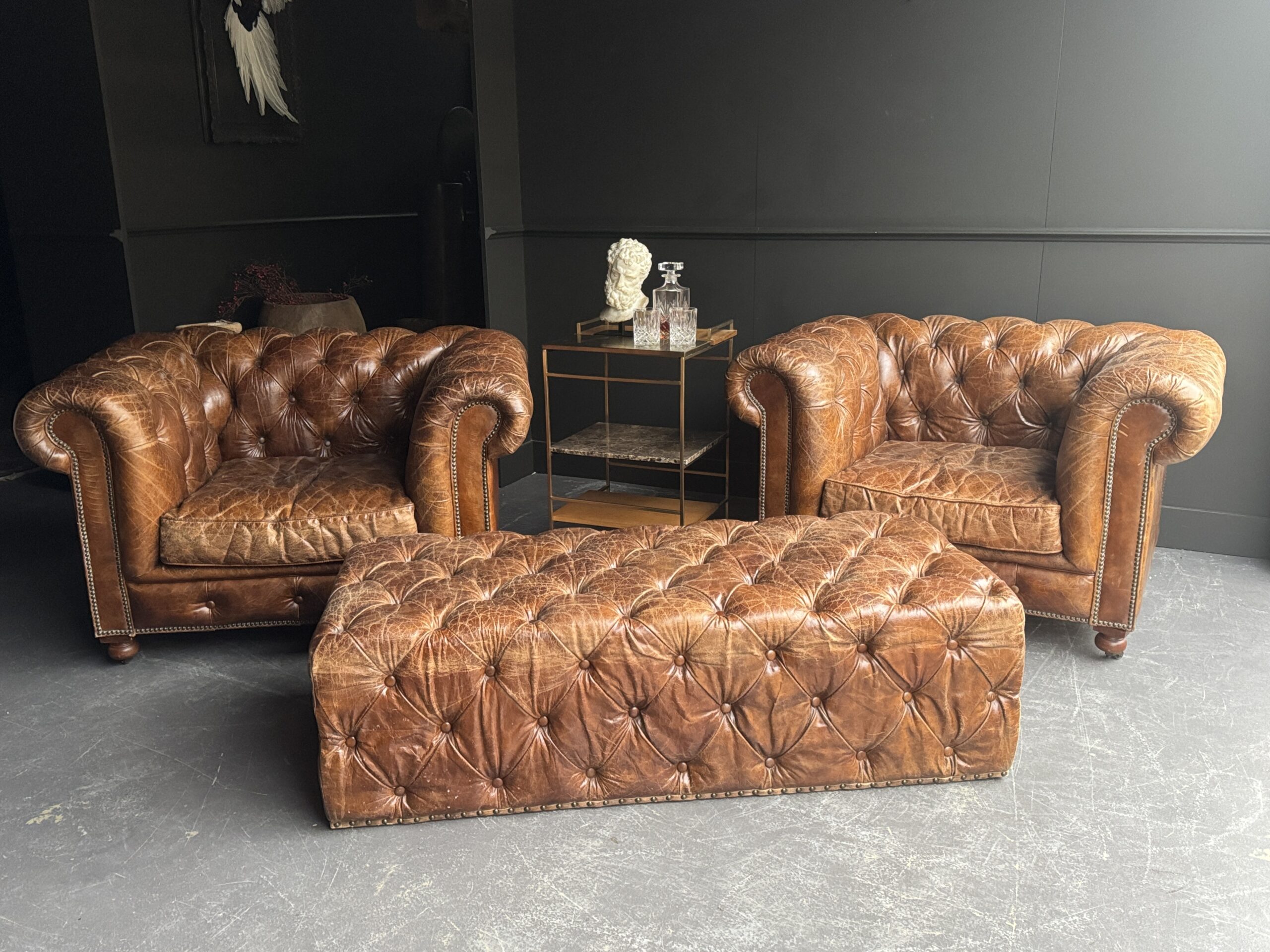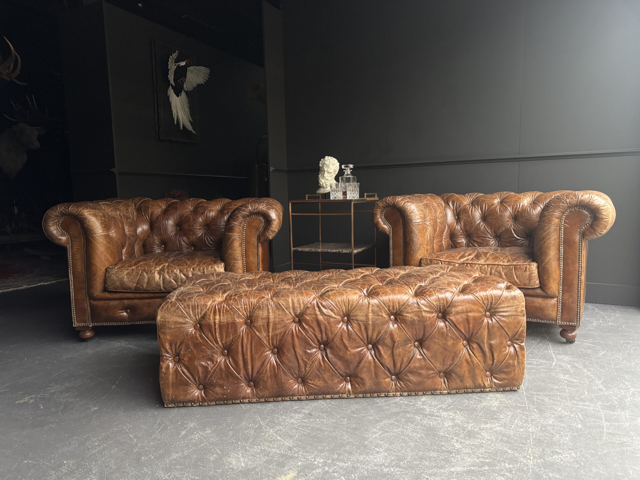Bijzondere set van 2 Chesterfield fauteuils en bijpassende poef.