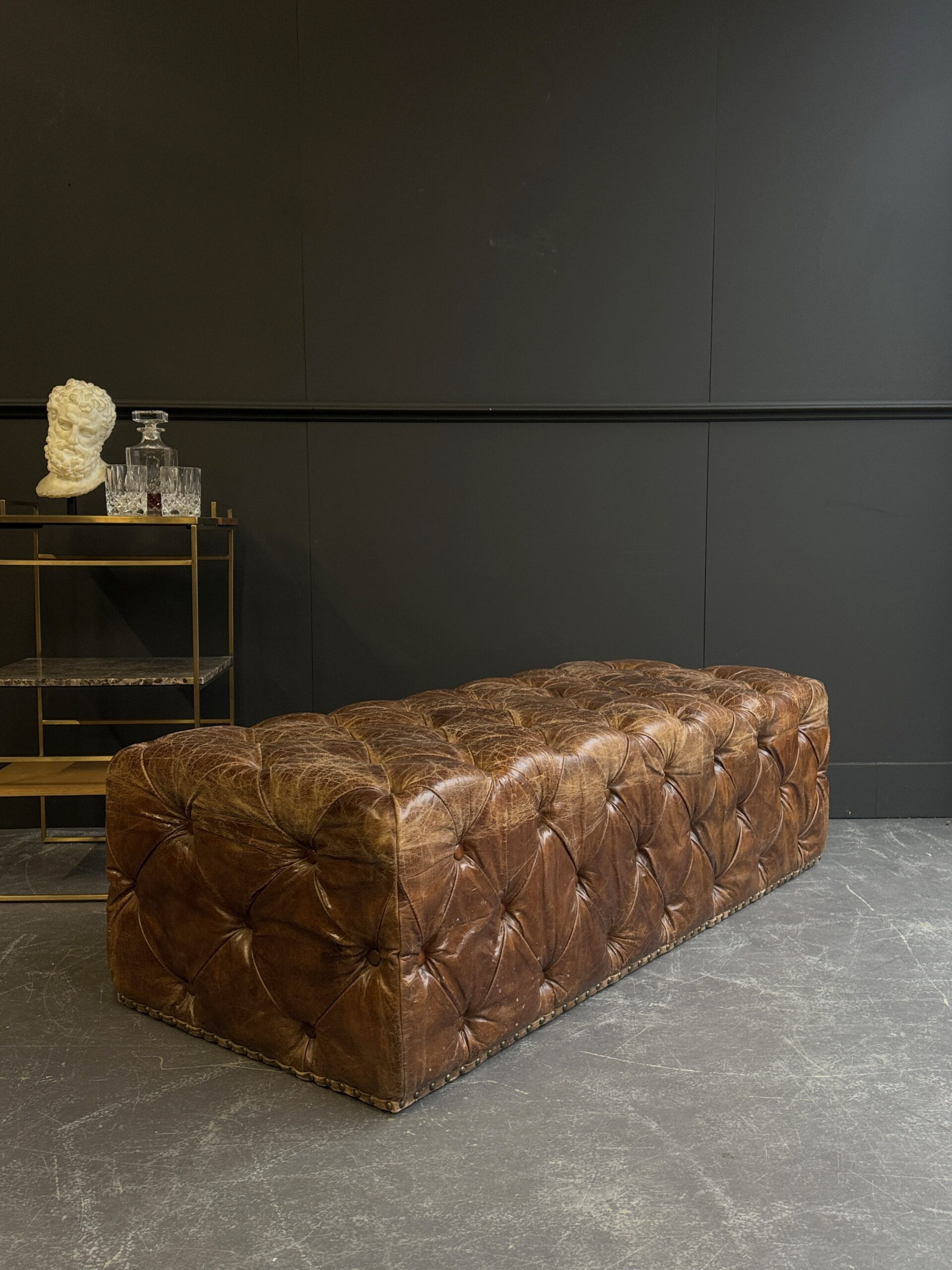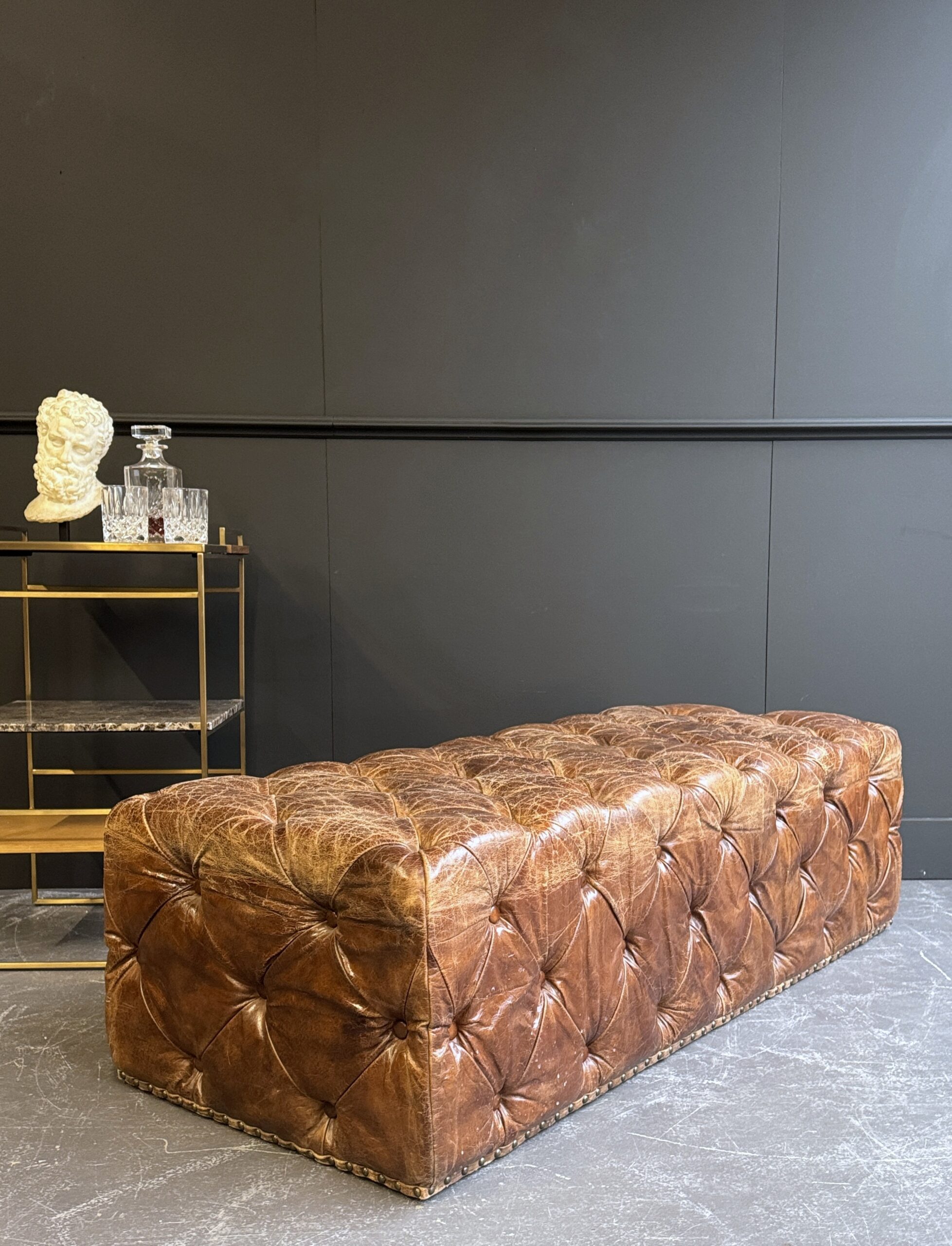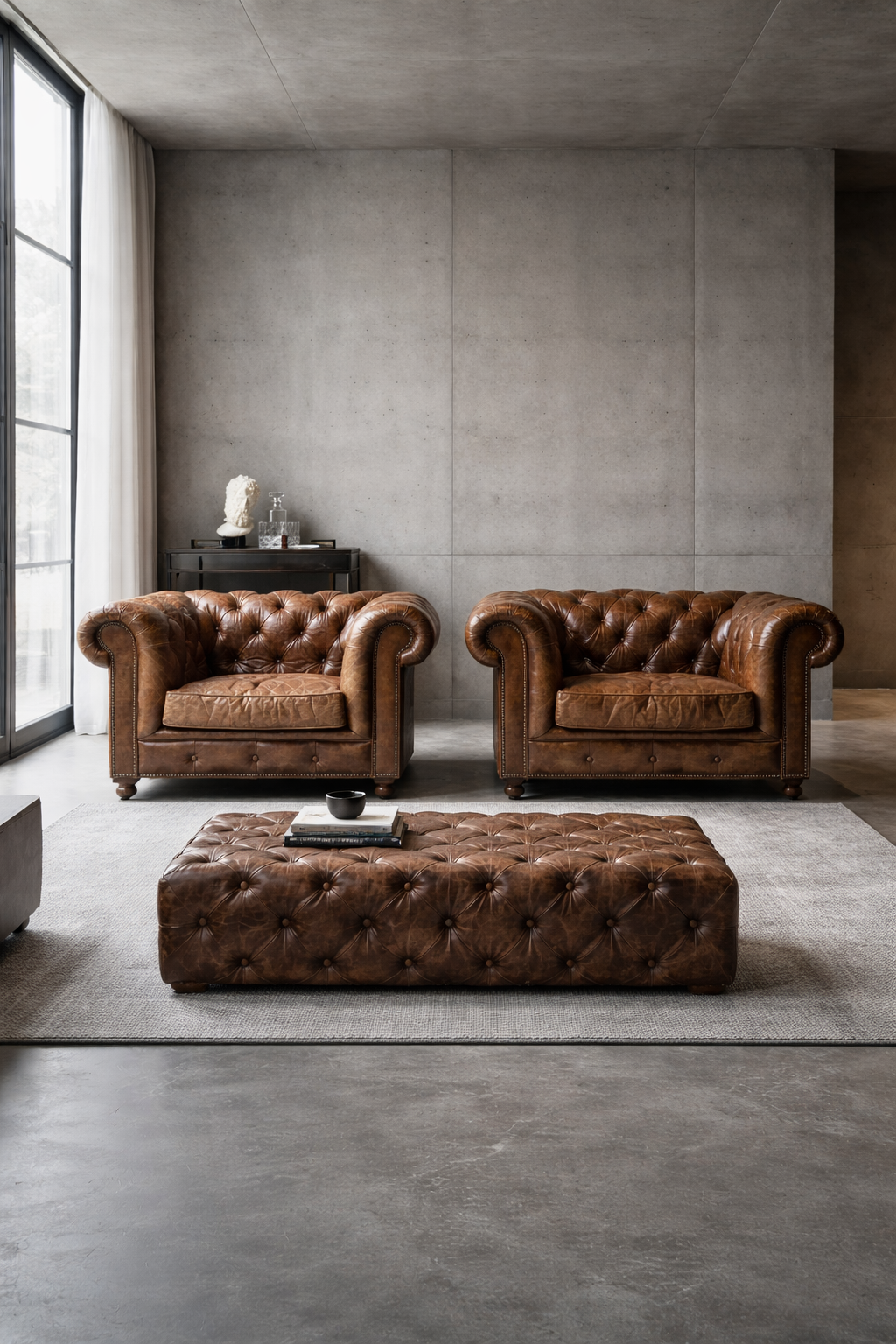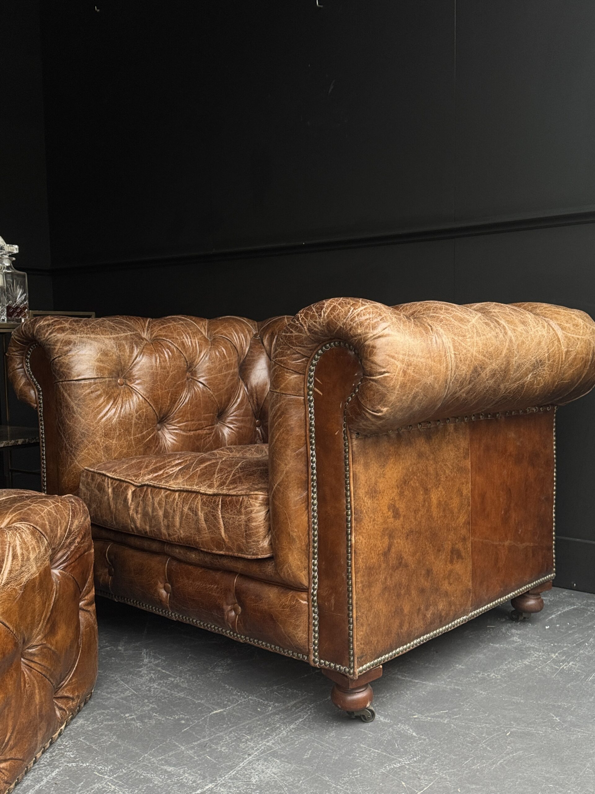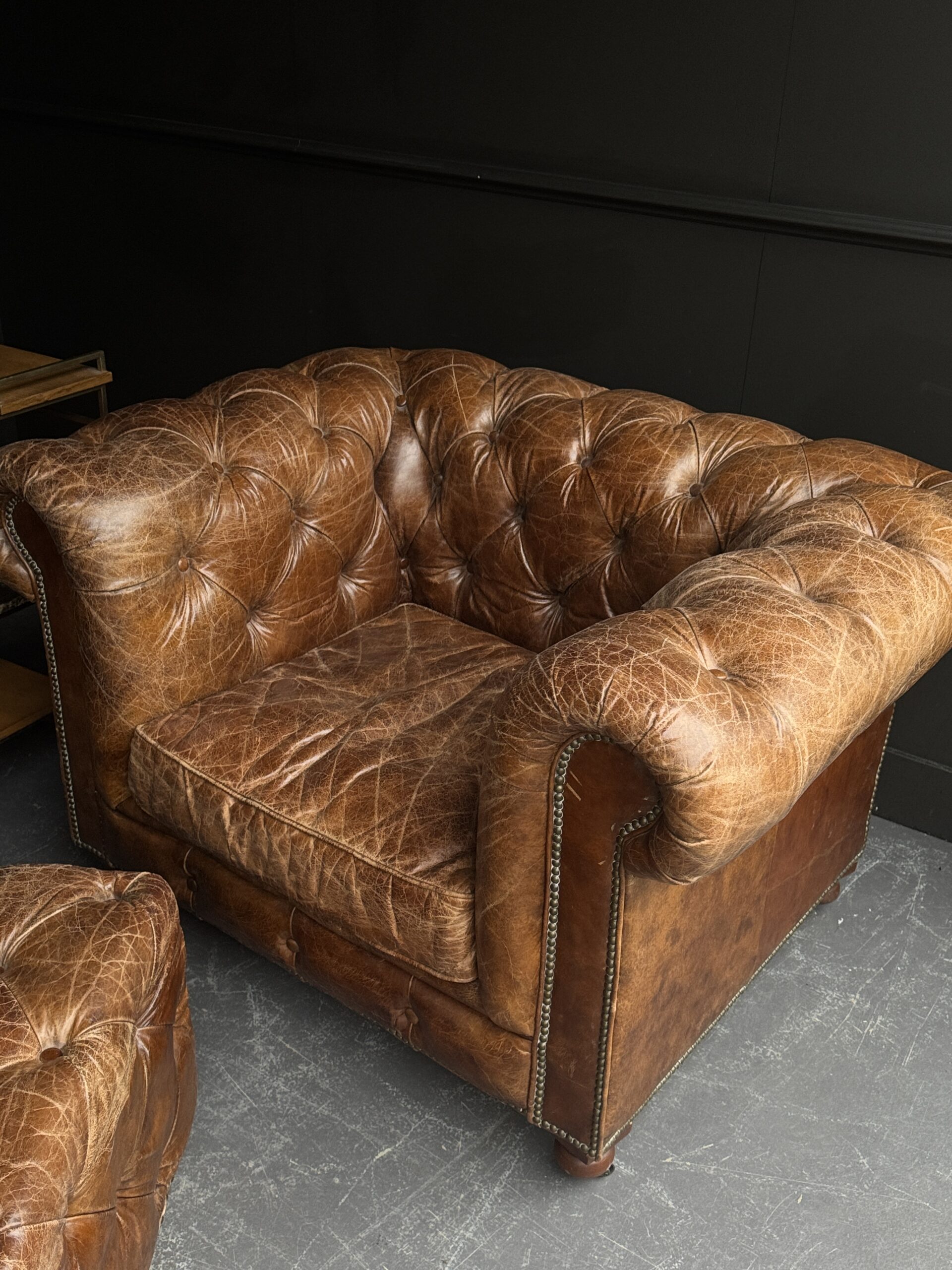 Bijzondere set van 2 Chesterfield fauteuils en bijpassende poef.
