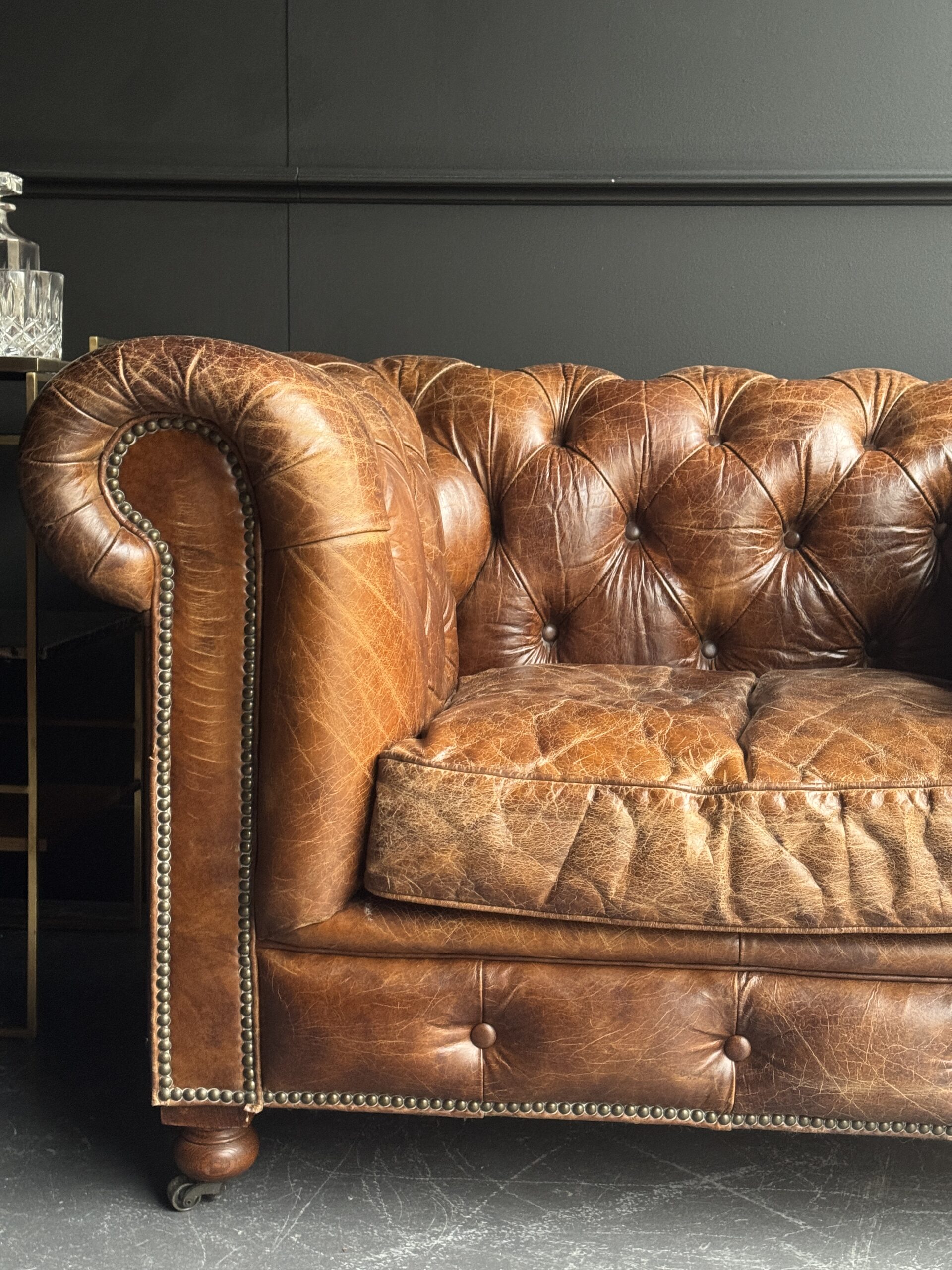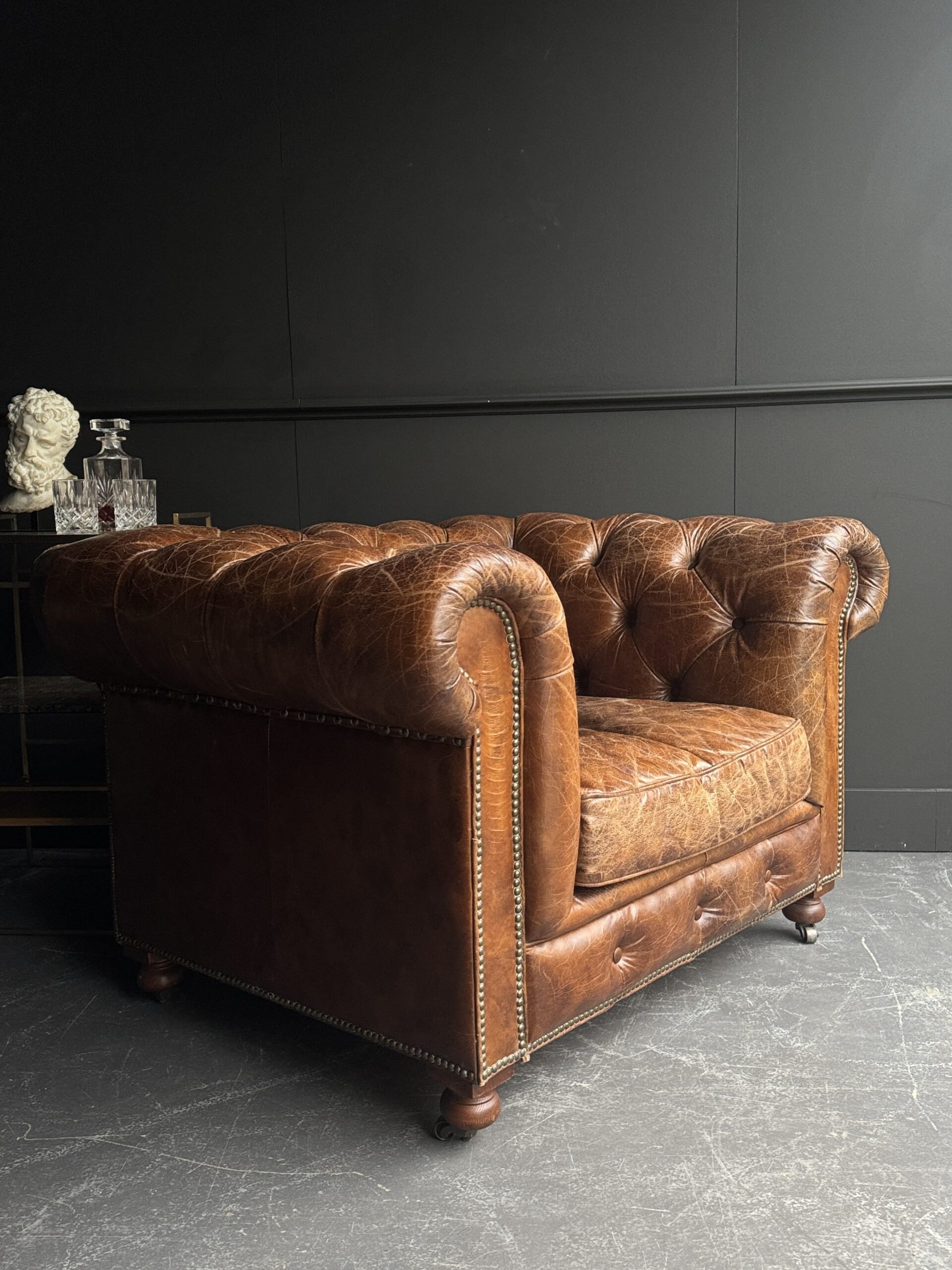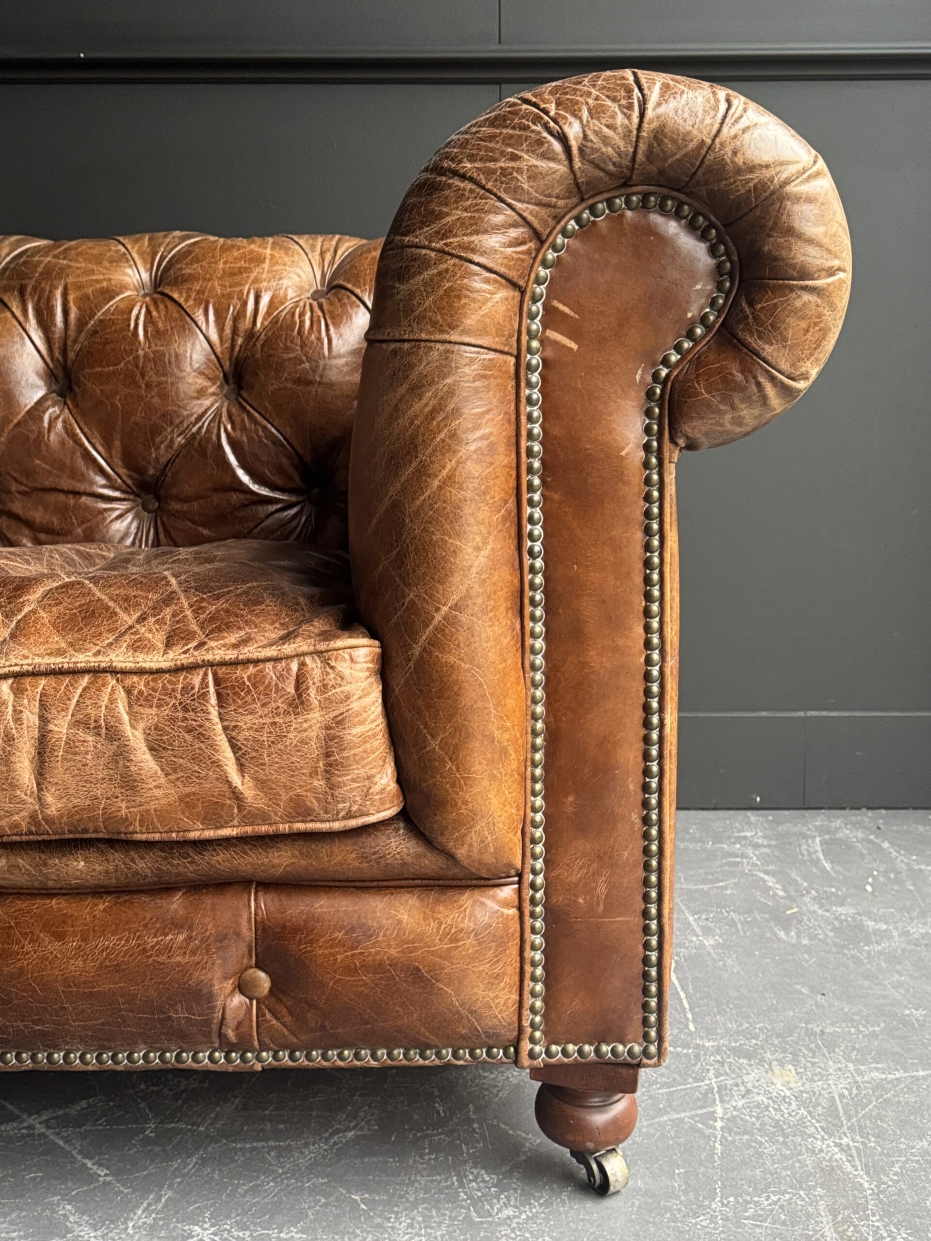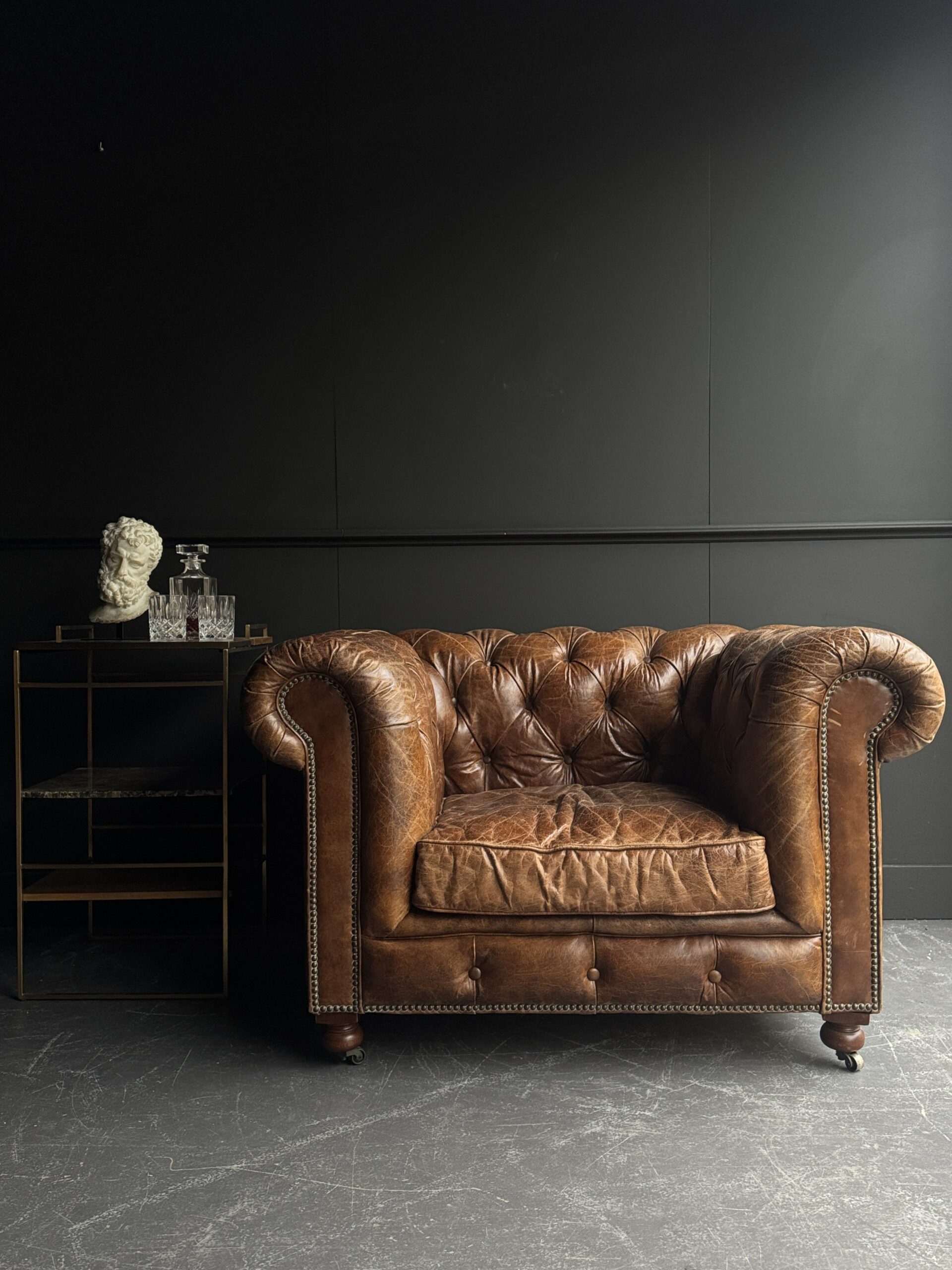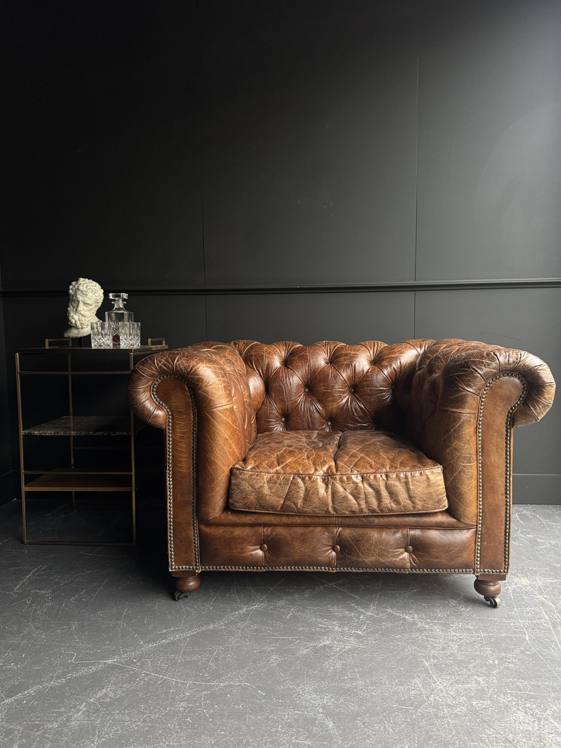 Bijzondere set van 2 Chesterfield fauteuils en bijpassende poef.