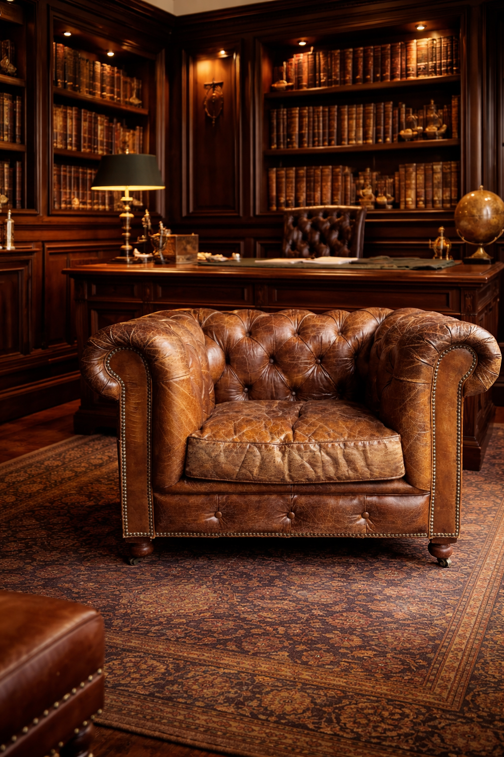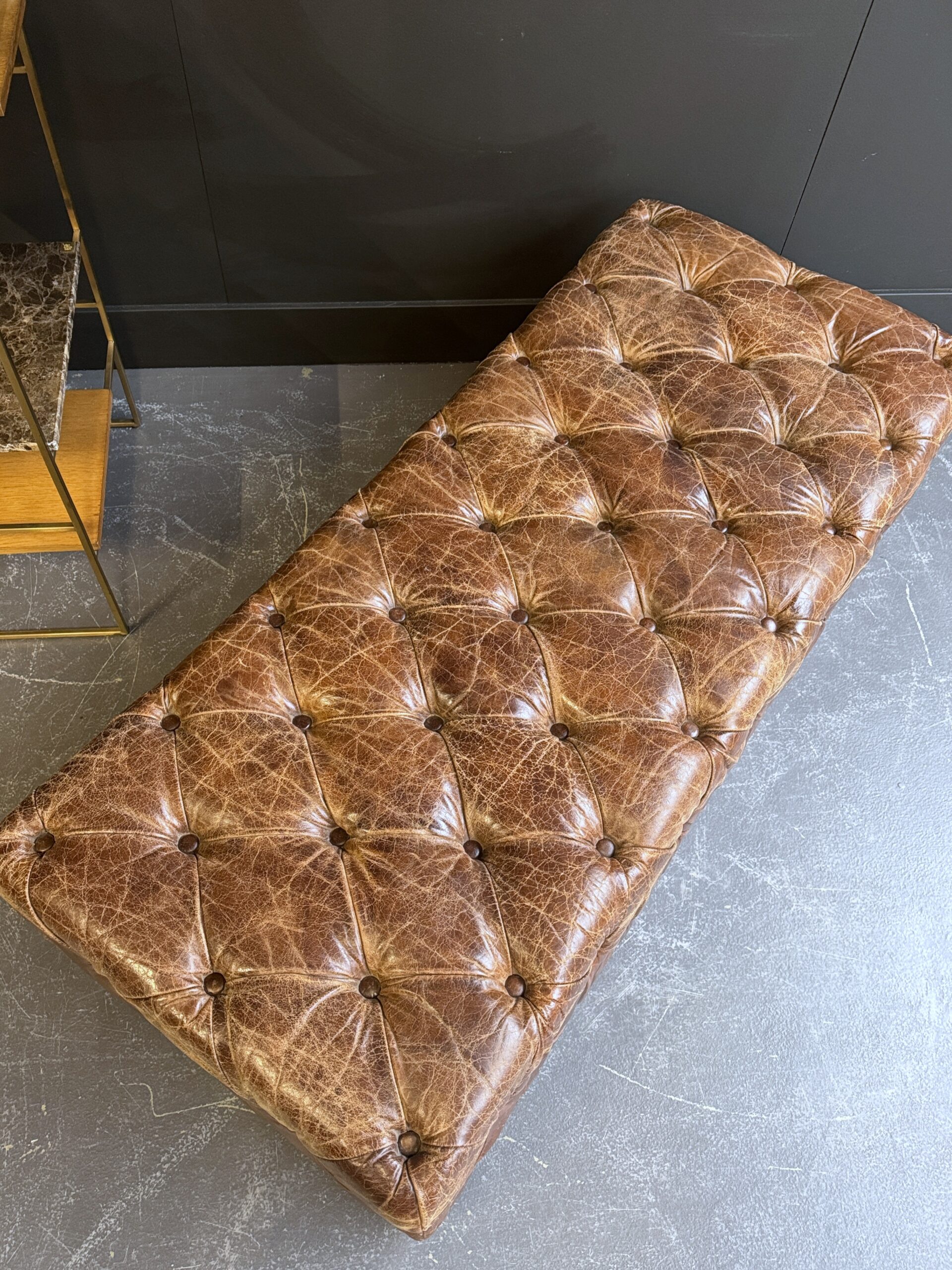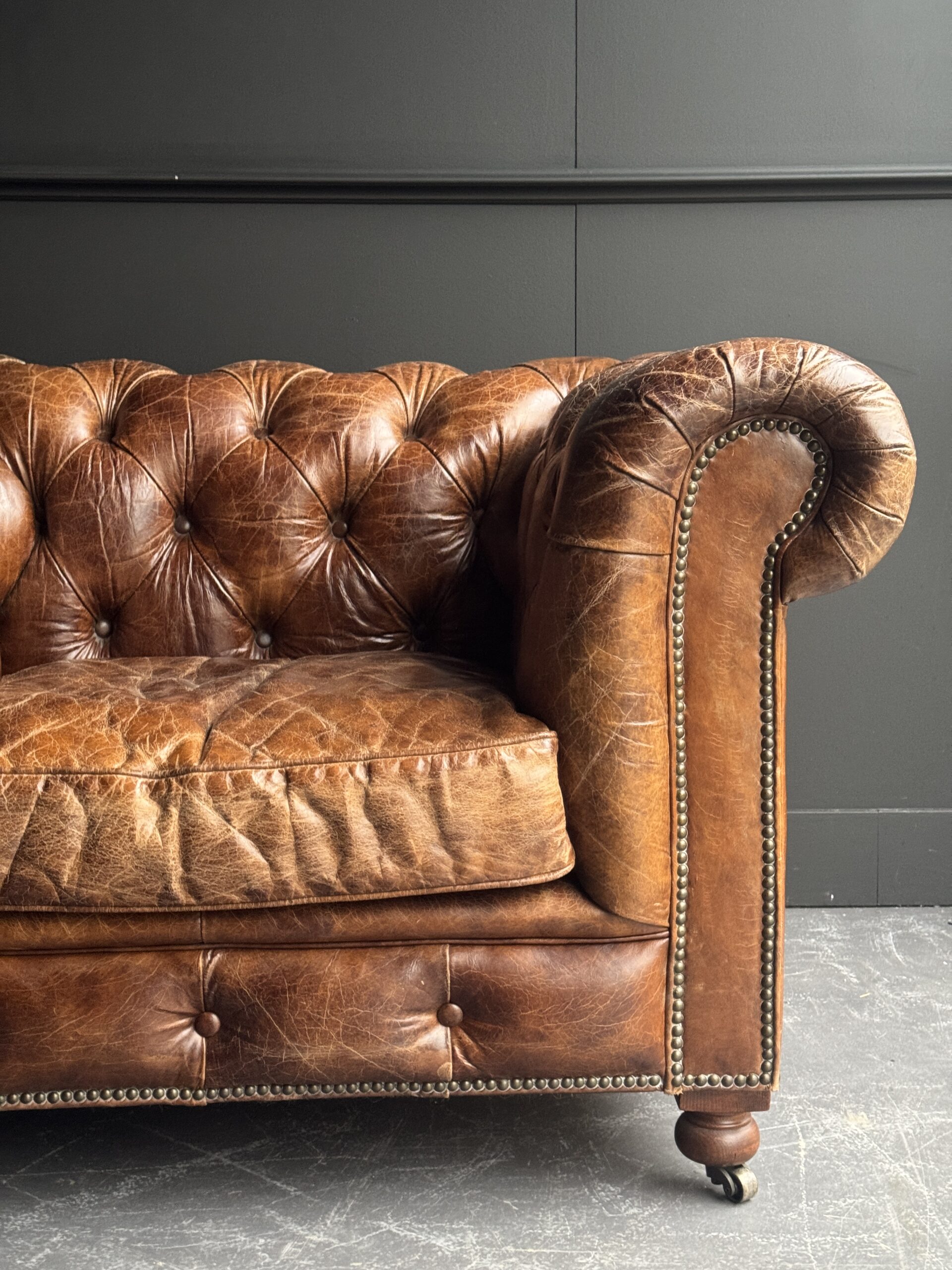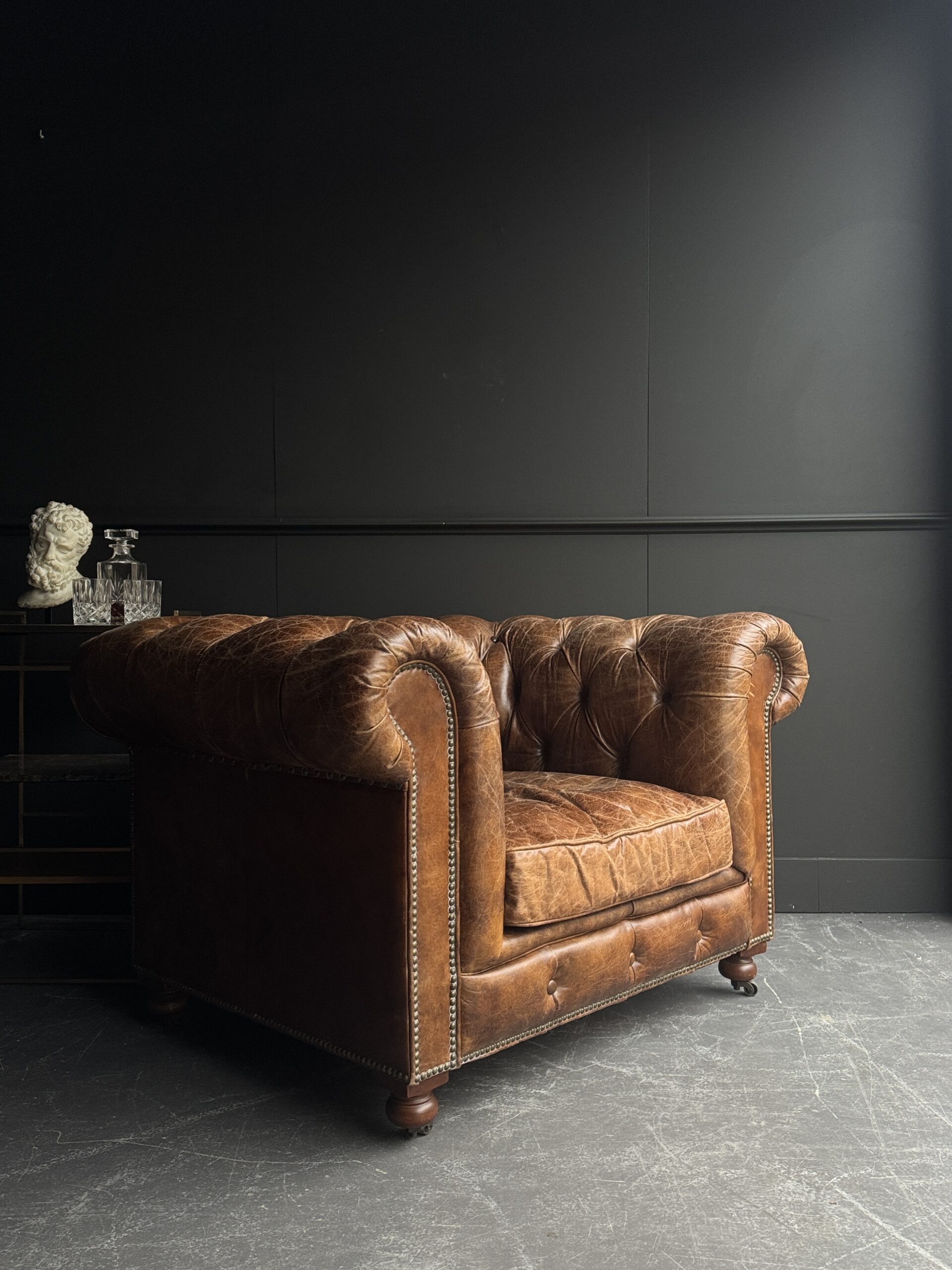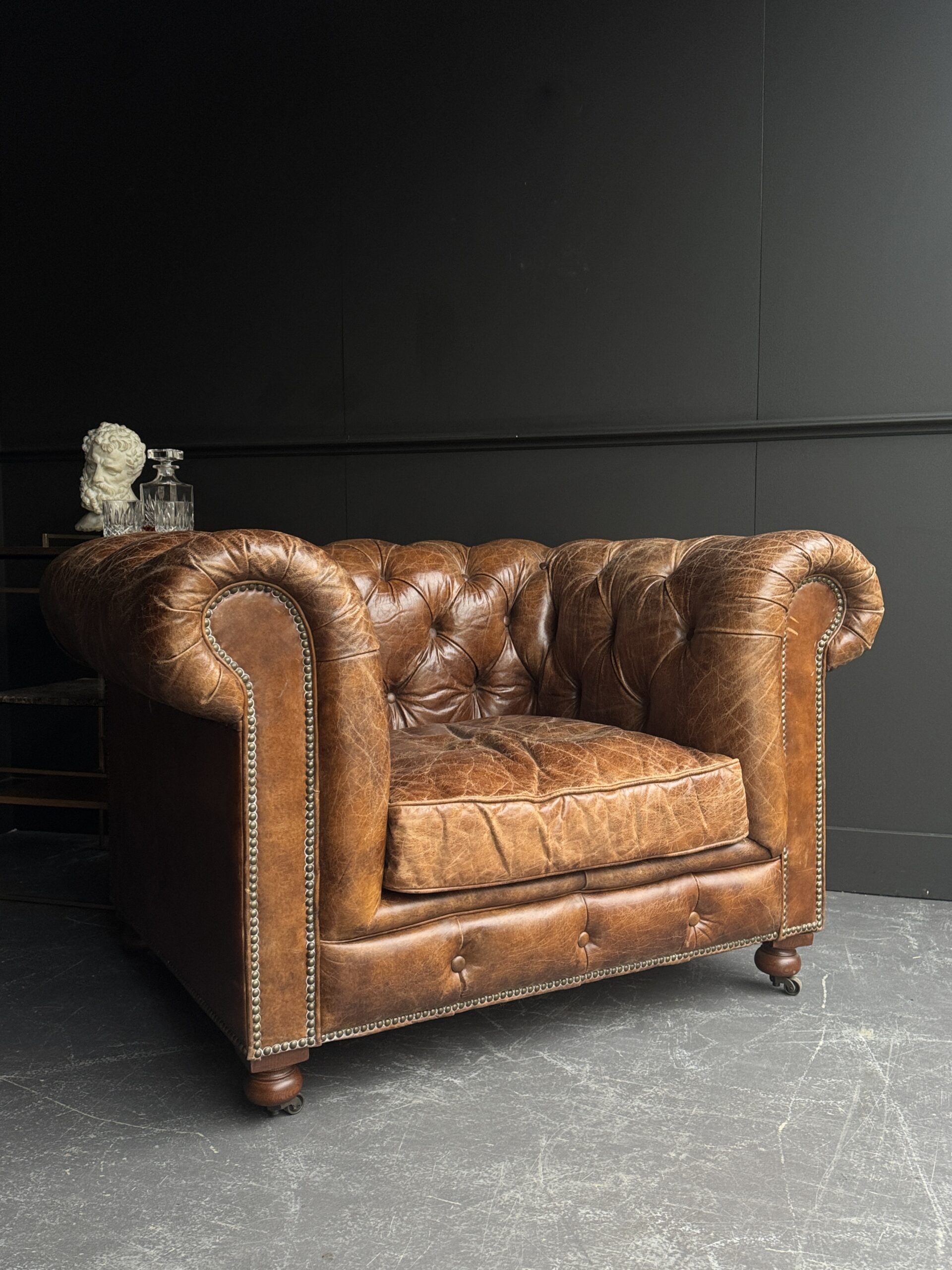 Bijzondere set van 2 Chesterfield fauteuils en bijpassende poef.