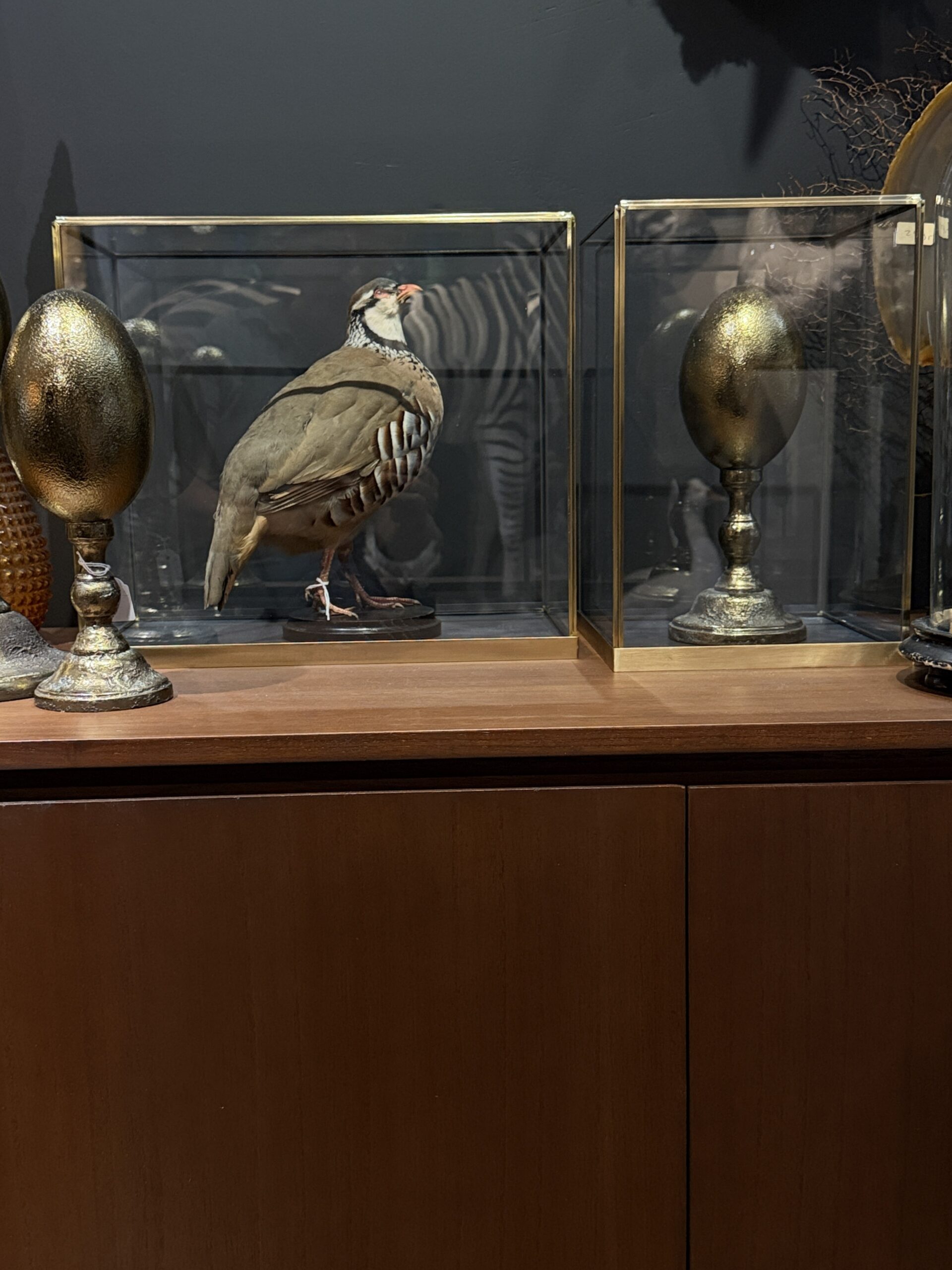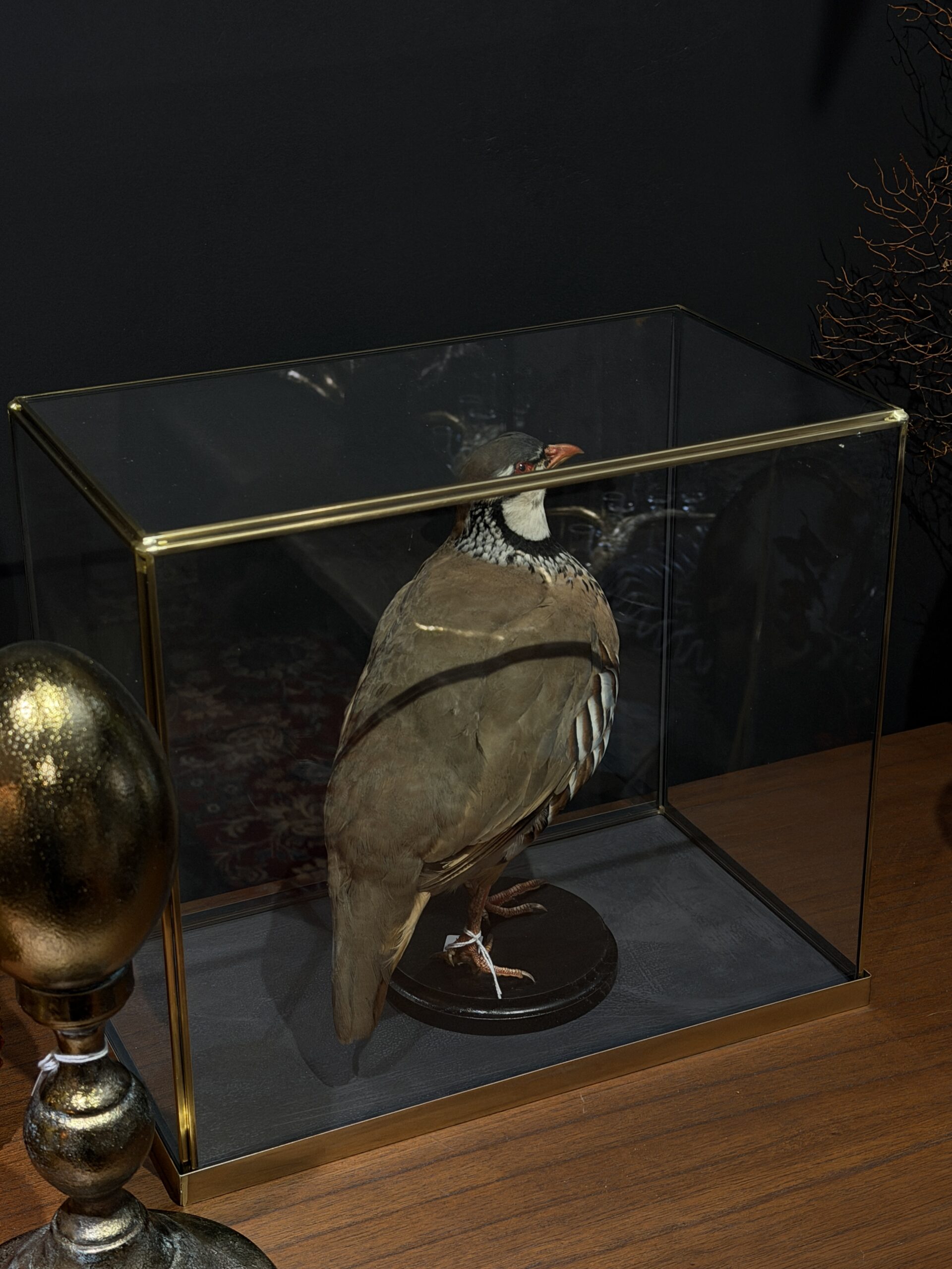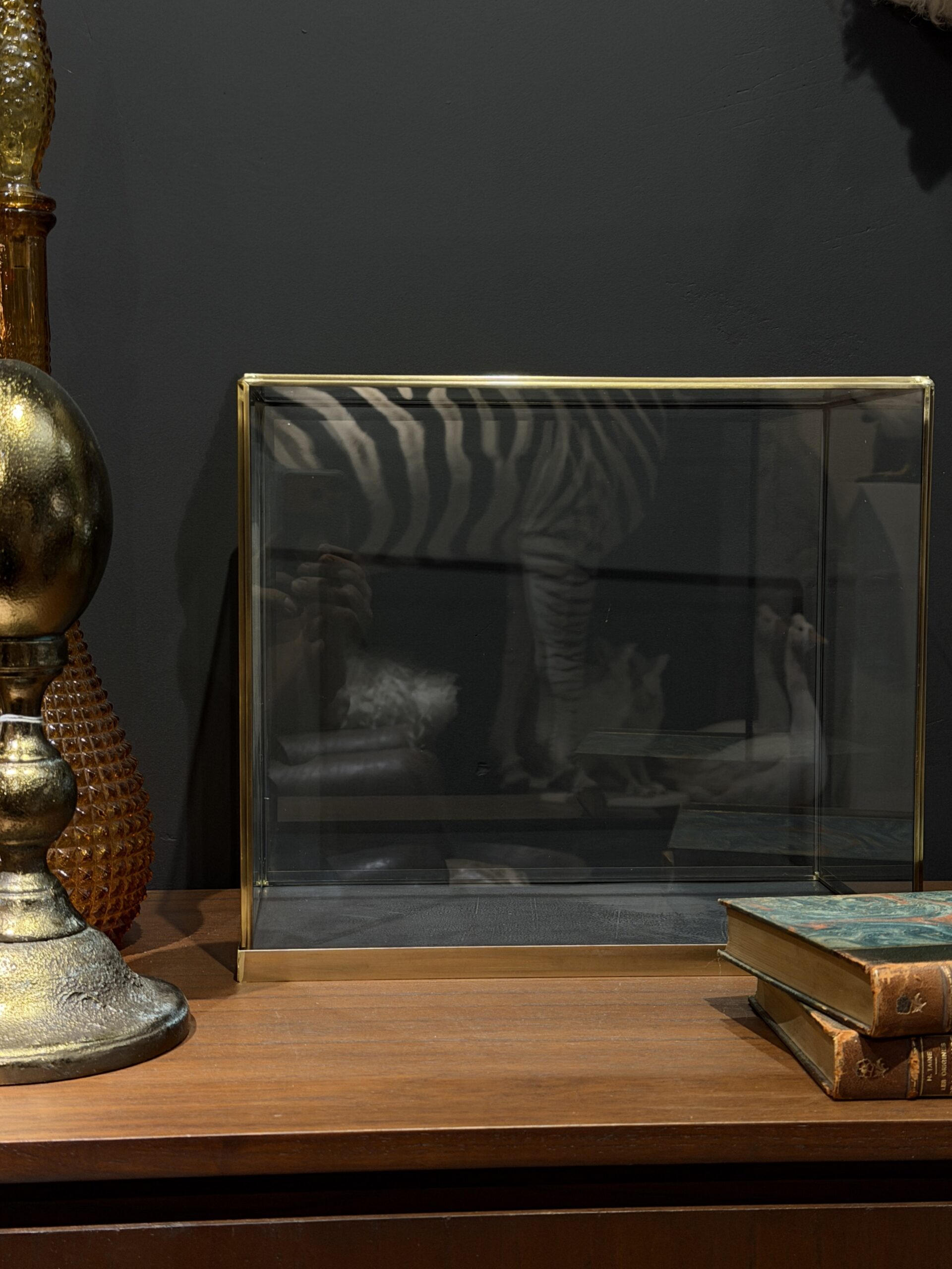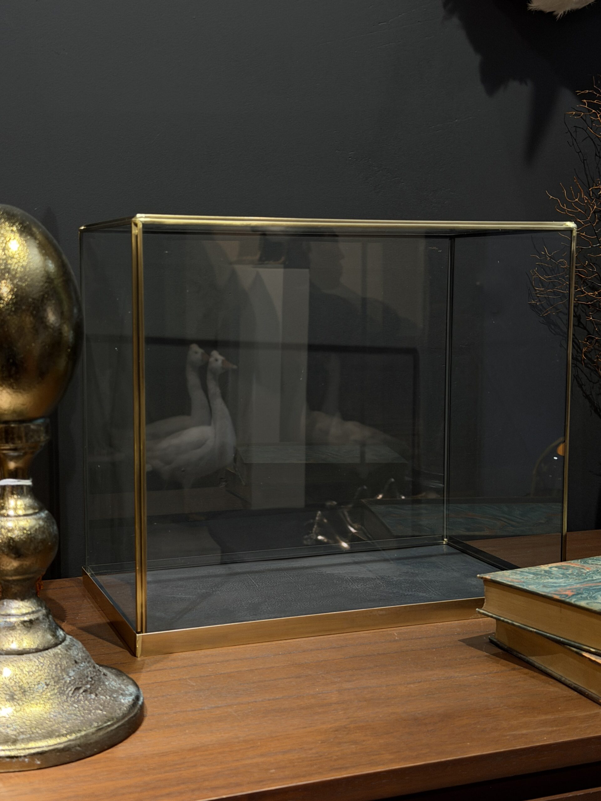 Deze stijlvolle glazen vitrine met een koperen frame is ideaal om bijzondere objecten stofvrij en veilig te presenteren. Dankzij het transparante glas blijft de inhoud volledig zichtbaar, terwijl het stevige frame een elegante, warme uitstraling geeft. Perfect voor het tentoonstellen van verzamelstukken, decoratieve items of kostbare herinneringen in huis of op kantoor.