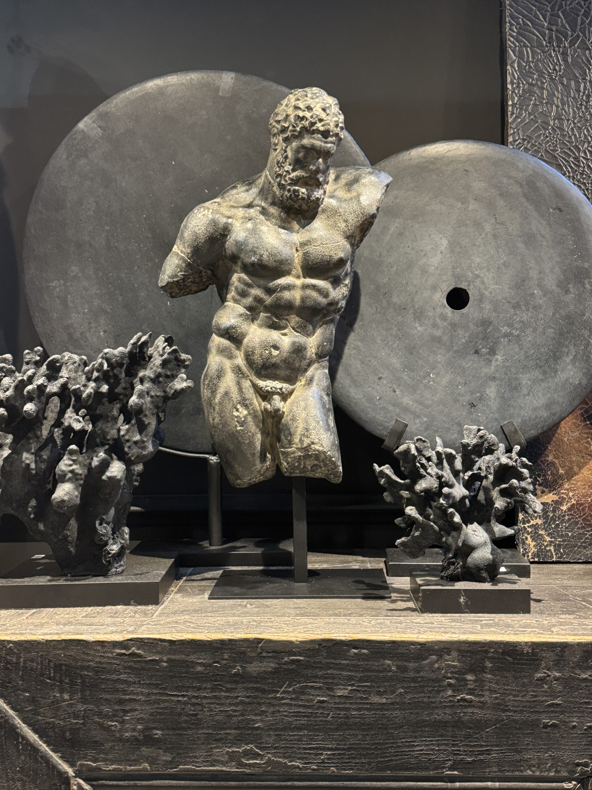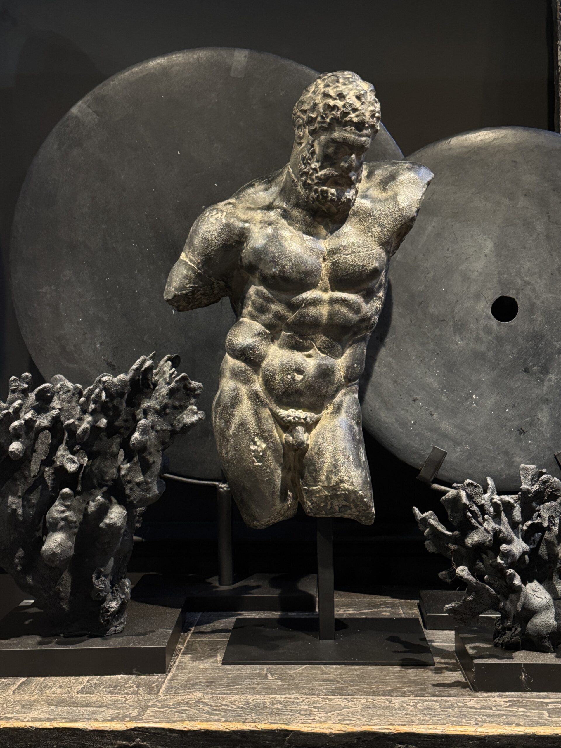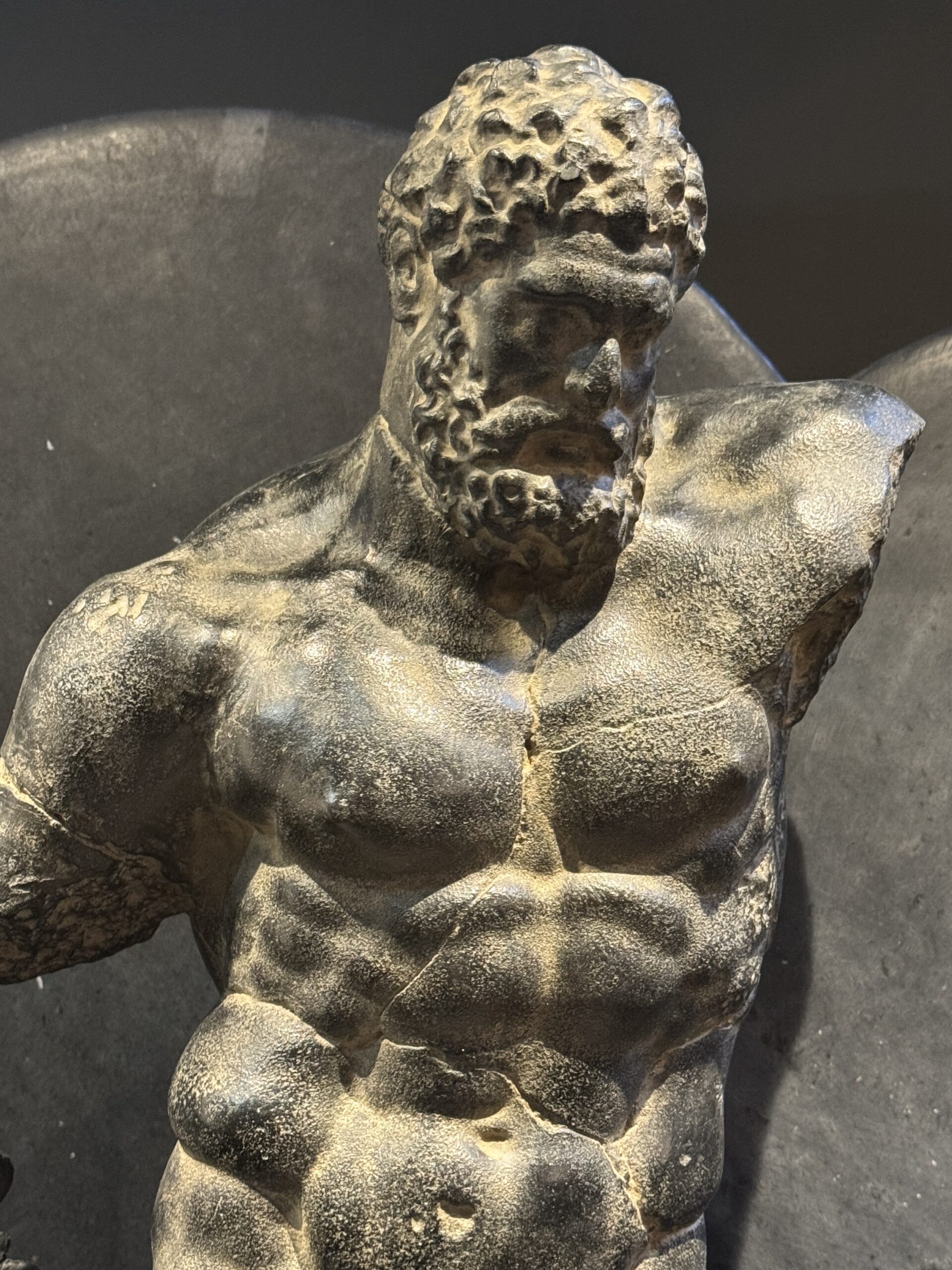 Reproductie van een fragment van een Herculesbeeld uit het begin van de 3de eeuw, toegeschreven aan de beeldhouwer Glycon uit Athene. Het stelt de Griekse held voor die net de 11e van de "12 werken van Hercules" heeft volbracht: het stelen van gouden appels uit de tuin van de Hesperiden na het doden van de draak die ze bewaakte.